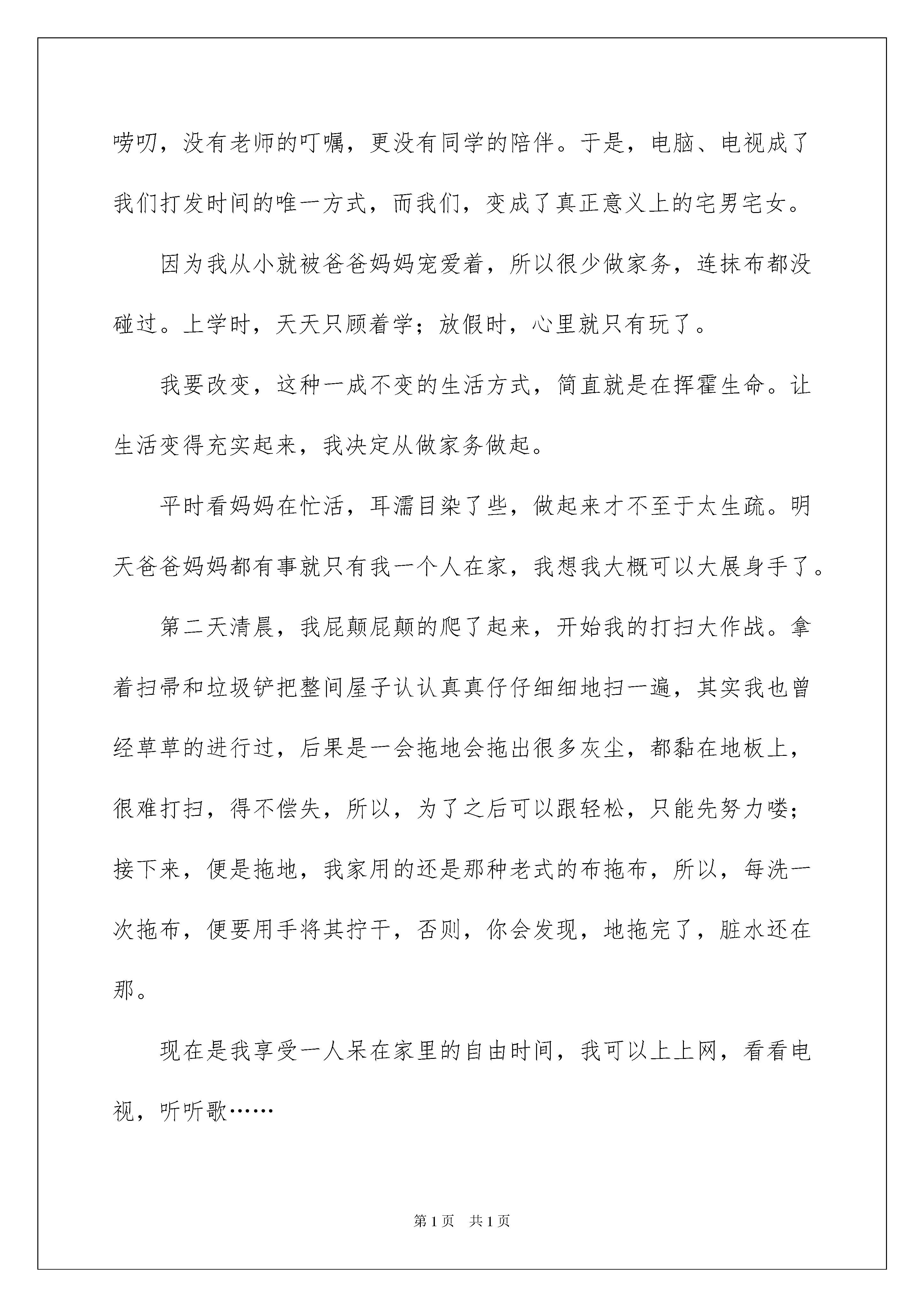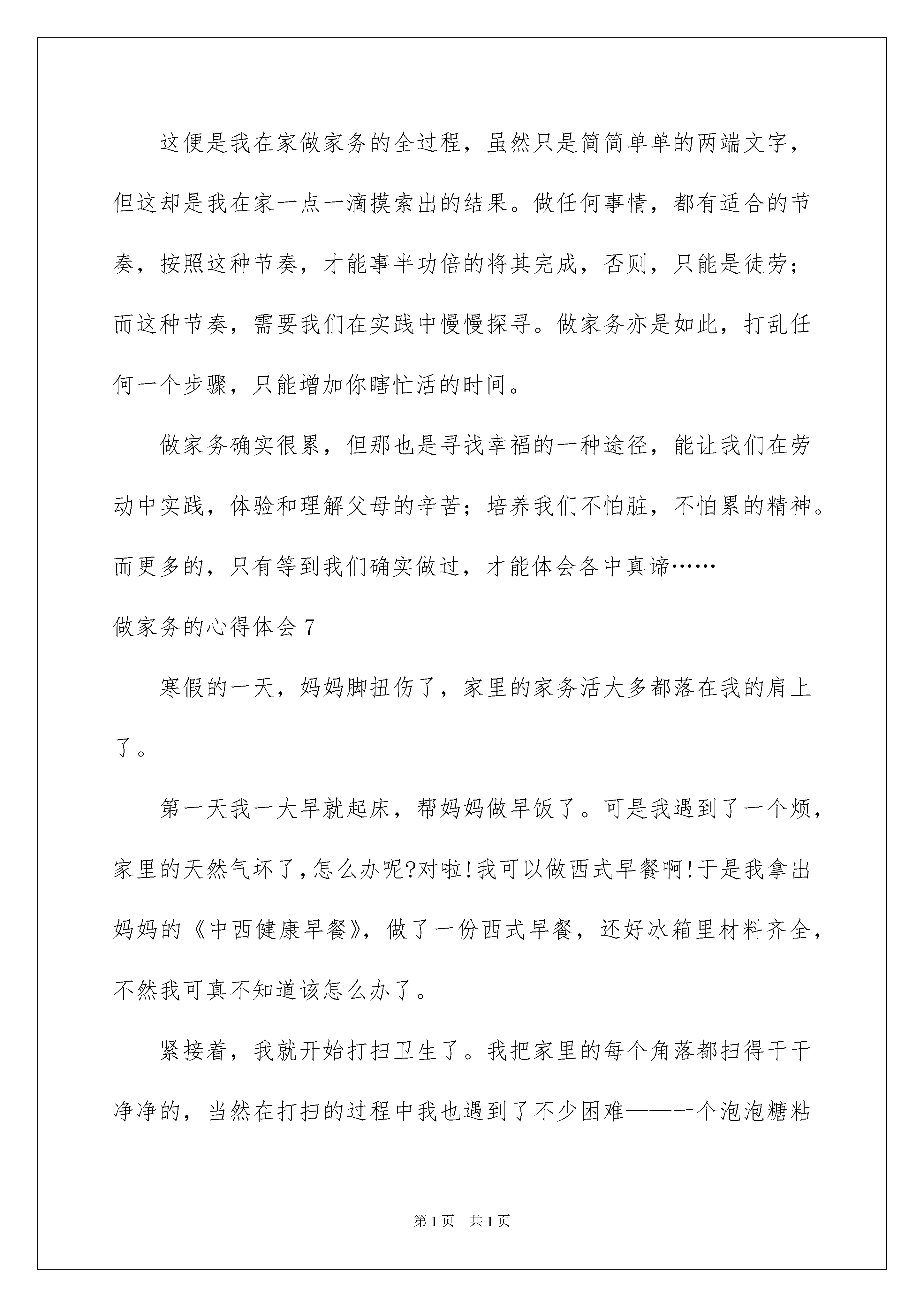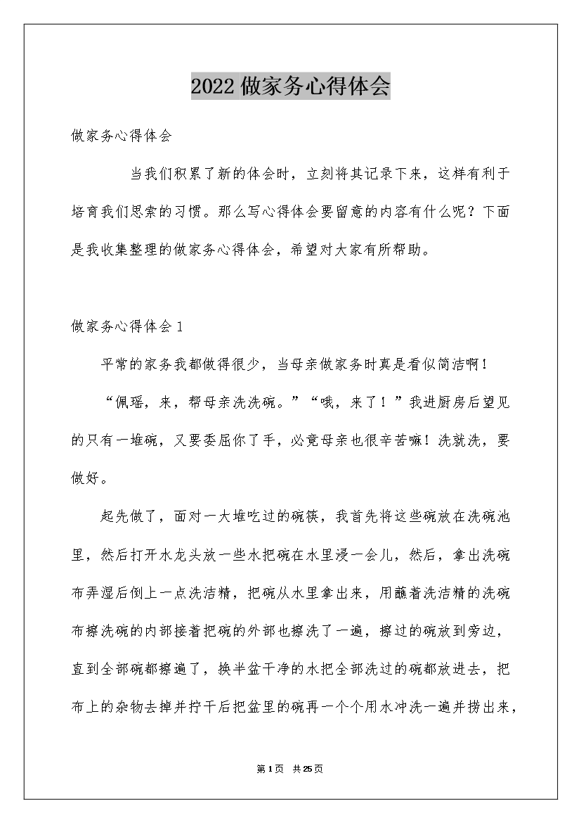 2022做家务心得体会做家务心得体会当我们积累了新的体会时,立刻将其记录下来,这样有利于培育我们思索的习惯。那么写心得体会要留意的内容有什么呢?下面是我收集整理的做家务心得体会,希望对大家有所帮助。做家务心得体会1平常的家务我都做得很少,当母亲做家务时真是看似简洁啊!“佩瑶,来,帮母亲洗洗碗。”“哦,来了!”我进厨房后望见的只有一堆碗,又要委屈你了