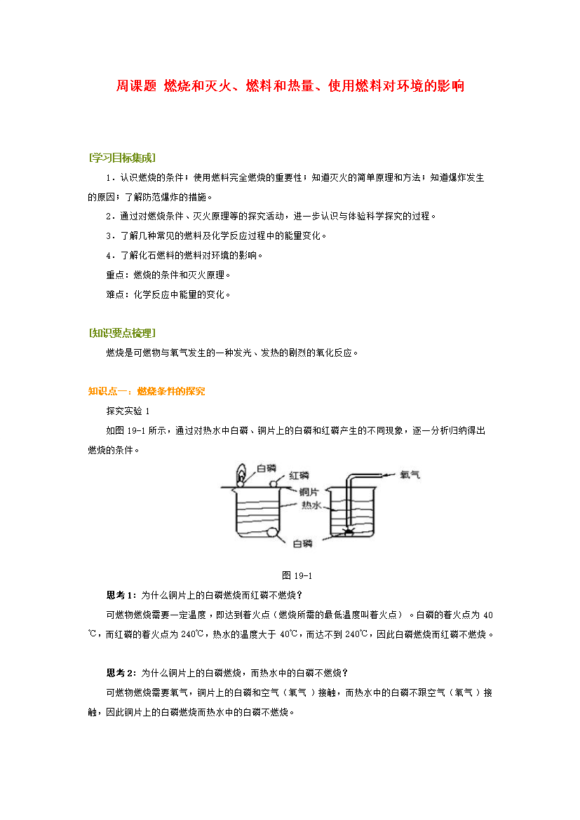 周课题燃烧和灭火、燃料和热量、使用燃料对环境的影响[学习目标集成]1.认识燃烧的条件;使用燃料完全燃烧的重要性;知道灭火的简单原理和方法;知道爆炸发生的原因;了解防范爆炸的措施。2.通过对燃烧条件、灭火原理等的探究活动,进一步认识与体验科学探究的过程。3.了解几种常见的燃料及化学反应过程中的能量变化。4.了解化石燃料的燃料对环境的影响。重点:燃烧的条件和灭火原理。难点:化学反应中能量的变化。[知识要点梳理]燃烧是可燃物与氧气发生的一种发光、发热的剧烈的氧化反应。知识点一:燃烧条件的探究探究实验1如图19-