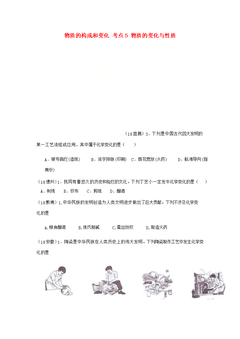 物质的构成和变化考点5物质的变化与性质(18宜昌)3.下列是中国古代四大发明的某一工艺流程或应用,其中属于化学变化的是()A.破布捣烂(造纸)B.活字排版(印刷)C.烟花燃放(火药)D.航海导向(指南针)(18德州)1.我同有着悠久的历史和灿烂的文化。下列丁芝小一定发牛化学变化的是()A.刺绣B.织布C.剪纸D.酿酒(18黔南)1.中华民族的发明创造为人类文明进步做出了巨大贡献。下列不涉及化学变化的是A.粮食酿酒B.侯氏制碱C.蚕丝纺织D.制造火药(18安徽)1.陶瓷是中华民族在人类历史上的伟大发明。下列