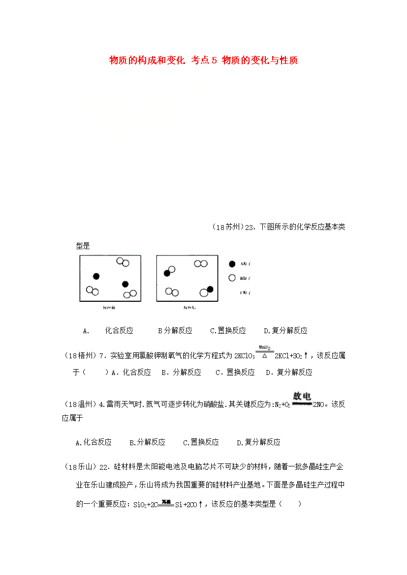 物质的构成和变化考点5物质的变化与性质(18苏州)23、下图所示的化学反应基本类型是化合反应B分解反应C.置换反应D.复分解反应(18梧州)7.实验室用氯酸钾制氧气的化学方程式为2KClO32KCl+3O2↑,该反应属于()A.化合反应B.分解反应C.置换反应D.复分解反应(18温州)4.雷雨天气时.氮气可逐步转化为硝酸盐.其关键反应为:N2+O22NO。该反应属于A.化合反应B.分解反应C.置换反应D.复分解反应(18乐山)22.硅材料是太阳能电池及电脑芯片不可缺少的材料,随着一批多晶硅生产企业在乐山建