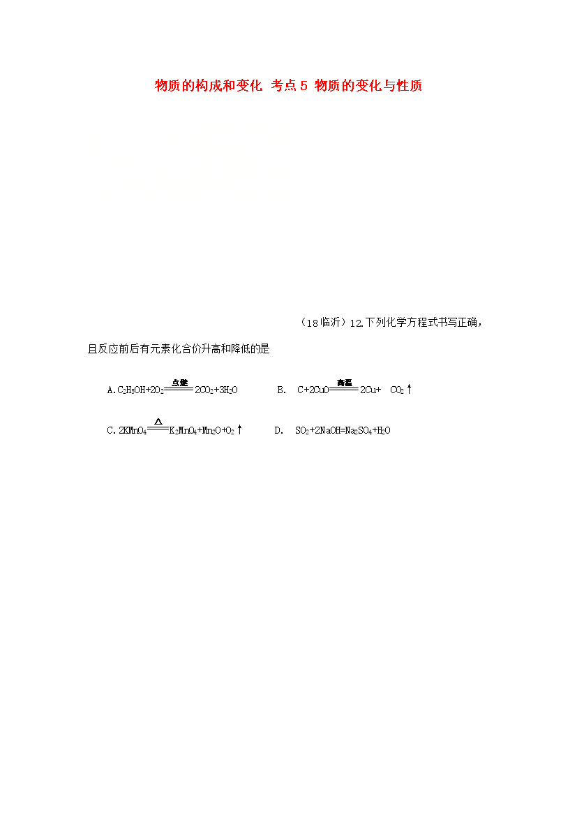 物质的构成和变化考点5物质的变化与性质(18临沂)12.下列化学方程式书写正确,且反应前后有元素化合价升高和降低的是A.C2H5OH+2O22CO2+3H2OB.C+2CuO2Cu+CO2↑C.2KMnO4K2MnO4+Mn2O+O2↑D.SO2+2NaOH=Na2SO4+H2O