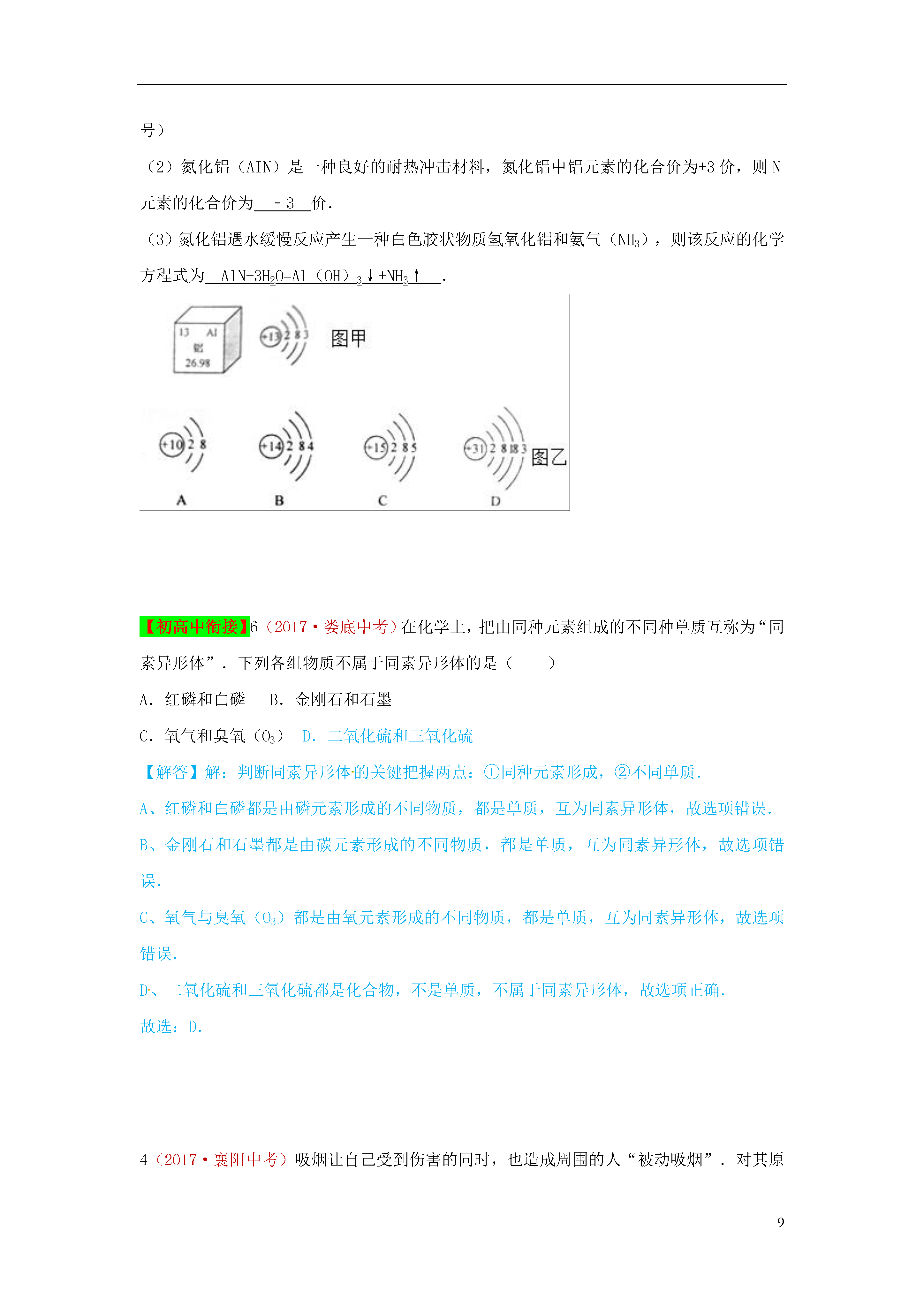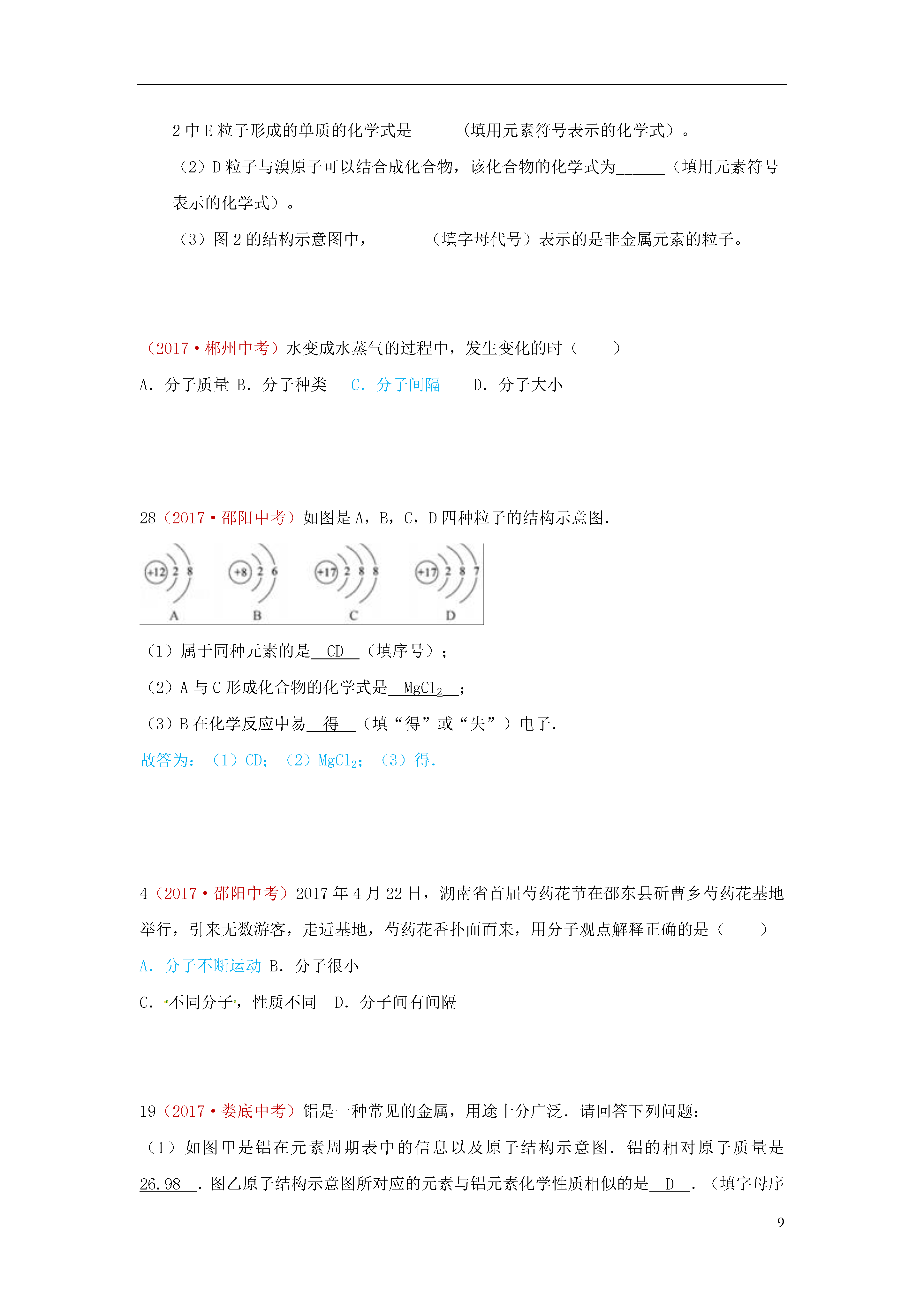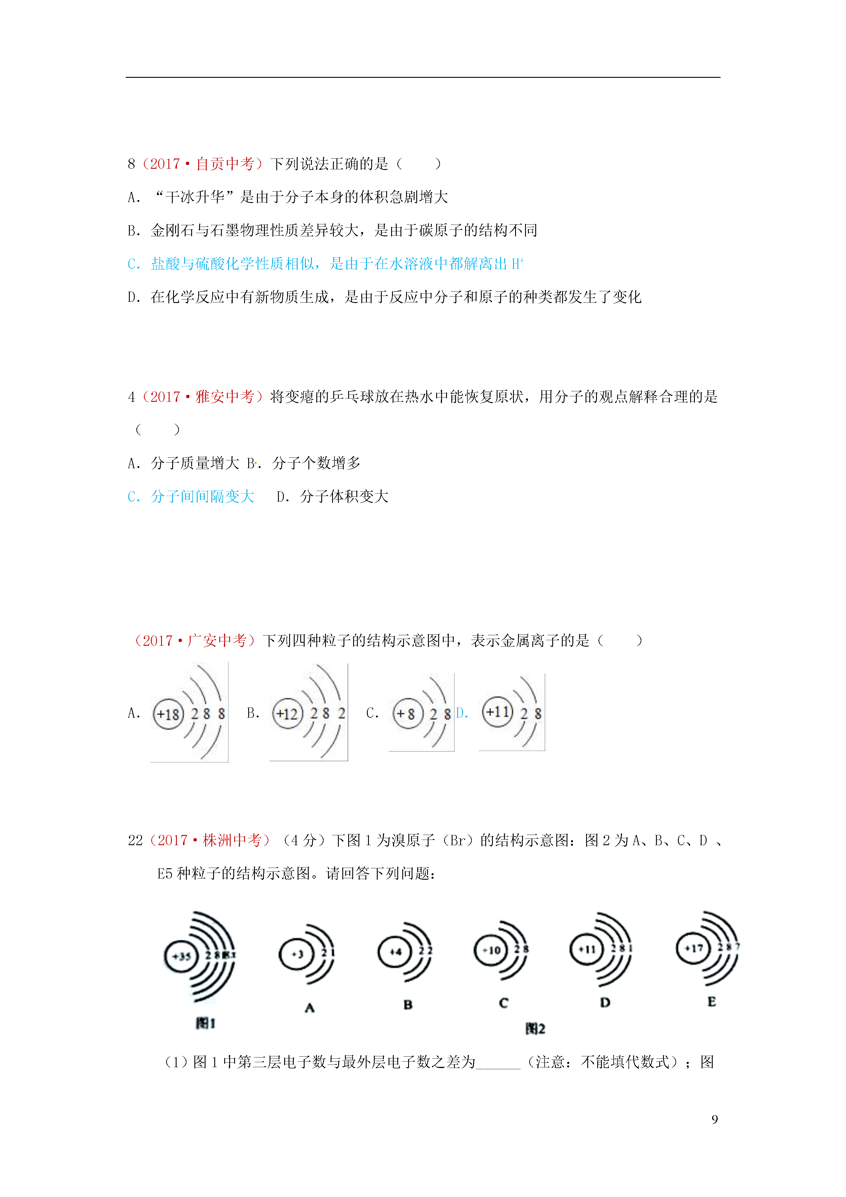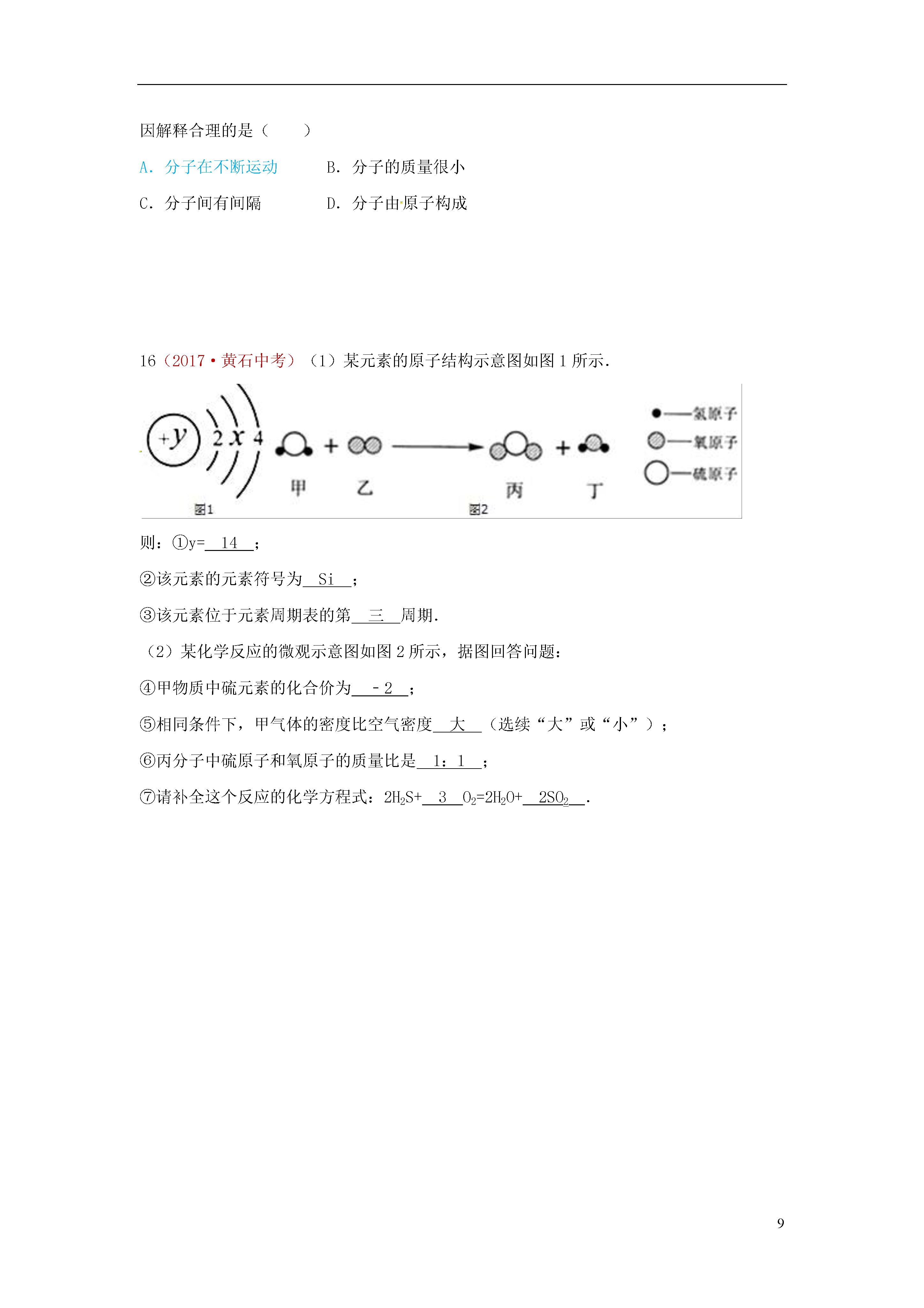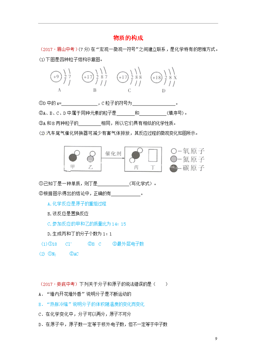 9物质的构成(2017·眉山中考)(7分)在“宏观一微观一符号”之间建立联系是化学特有的思维方式。(1)下图是四种粒子结构示意图。①D中的x=C粒子的符号为。②A、B、C、D中属于同种元素的粒子是和(填序号)。③A和B两种粒子的相同所以它们具有相似的化学性质。(2)汽车尾气催化转换器可减少有害气体排放其反应过程的微观变化如图所示。①己知丁是一种单质则丁是