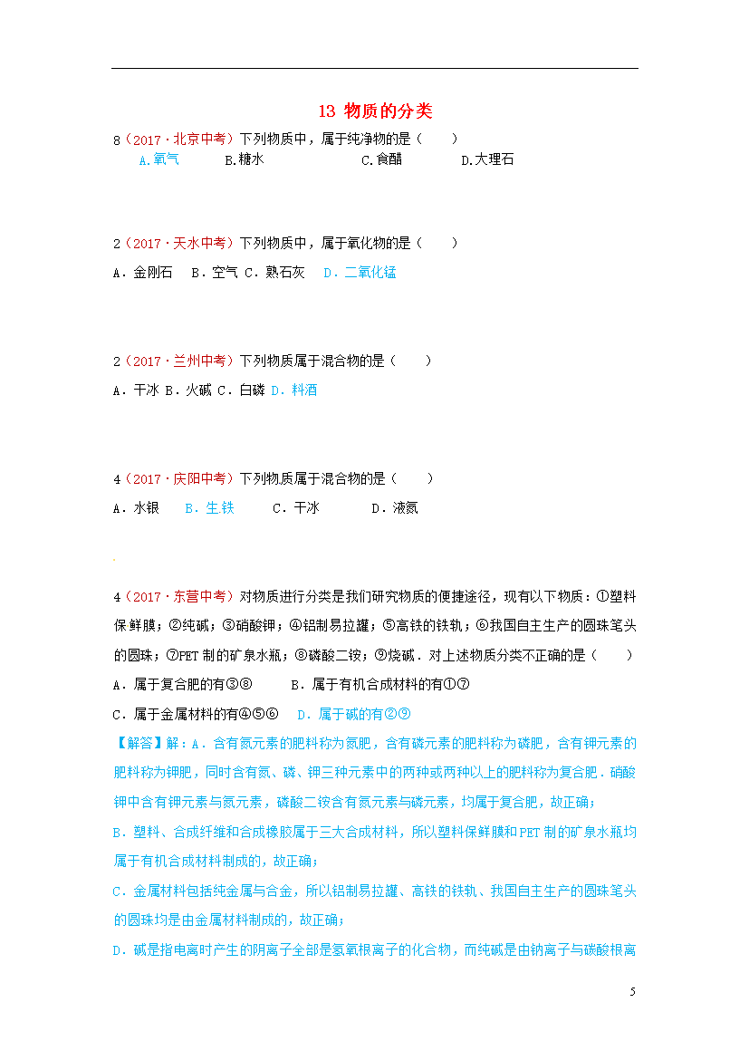 试题-河北-2018_河北省保定市2018届中考化学复习汇编 13 物质的分类.doc