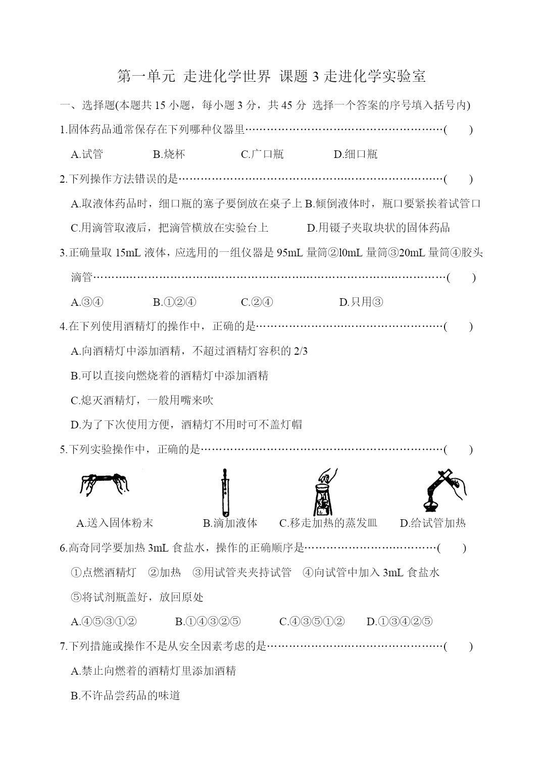第一单元走进化学世界课题3走进化学实验室一、选择题(本题共15小题,每小题3分,共45分选择一个答案的序号填入括号内)1.固体药品通常保存在下列哪种仪器里………………………………………………()A.试管B.烧杯C.广口瓶D.细口瓶2.下列操作方法错误的是………………………………………………………………()A.取液体药品时,细口瓶的塞子要倒放在桌子上B.倾倒液体时,瓶口要紧挨着试管口C.用滴管取液后,把滴管横放在实验台上D.用镊子夹取块状的固体药品3.正确量取15mL液体,应选用的一组仪器是95mL量筒②l