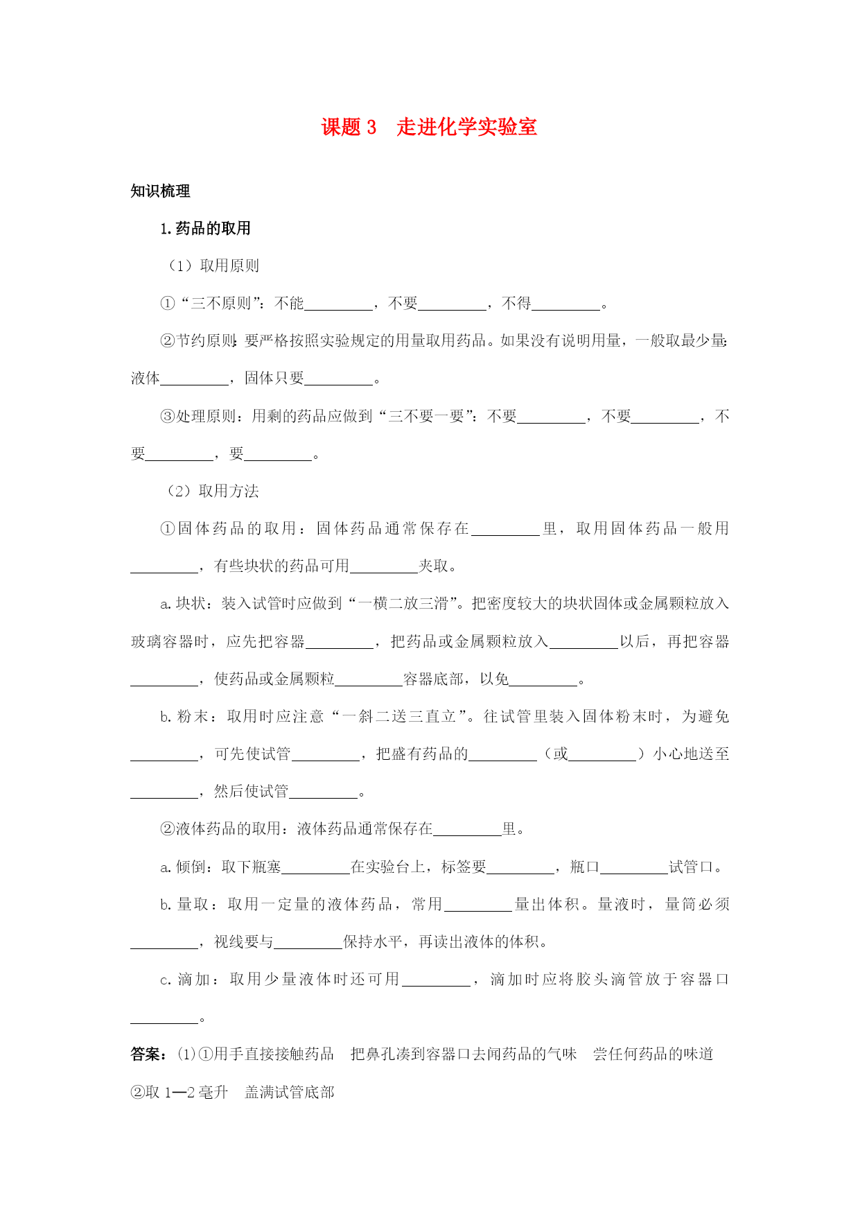 课题3走进化学实验室知识梳理1.药品的取用(1)取用原则①“三不原则”:不能_________,不要_________,不得_________。②节约原则:要严格按照实验规定的用量取用药品。如果没有说明用量,一般取最少量:液体_________,固体只要_________。③处理原则:用剩的药品应做到“三不要一要”:不要_________,不要_________,不要_________,要_________。(2)取用方法①固体药品的取用:固体药品通常保存在_________里,取用固体药品一般用____