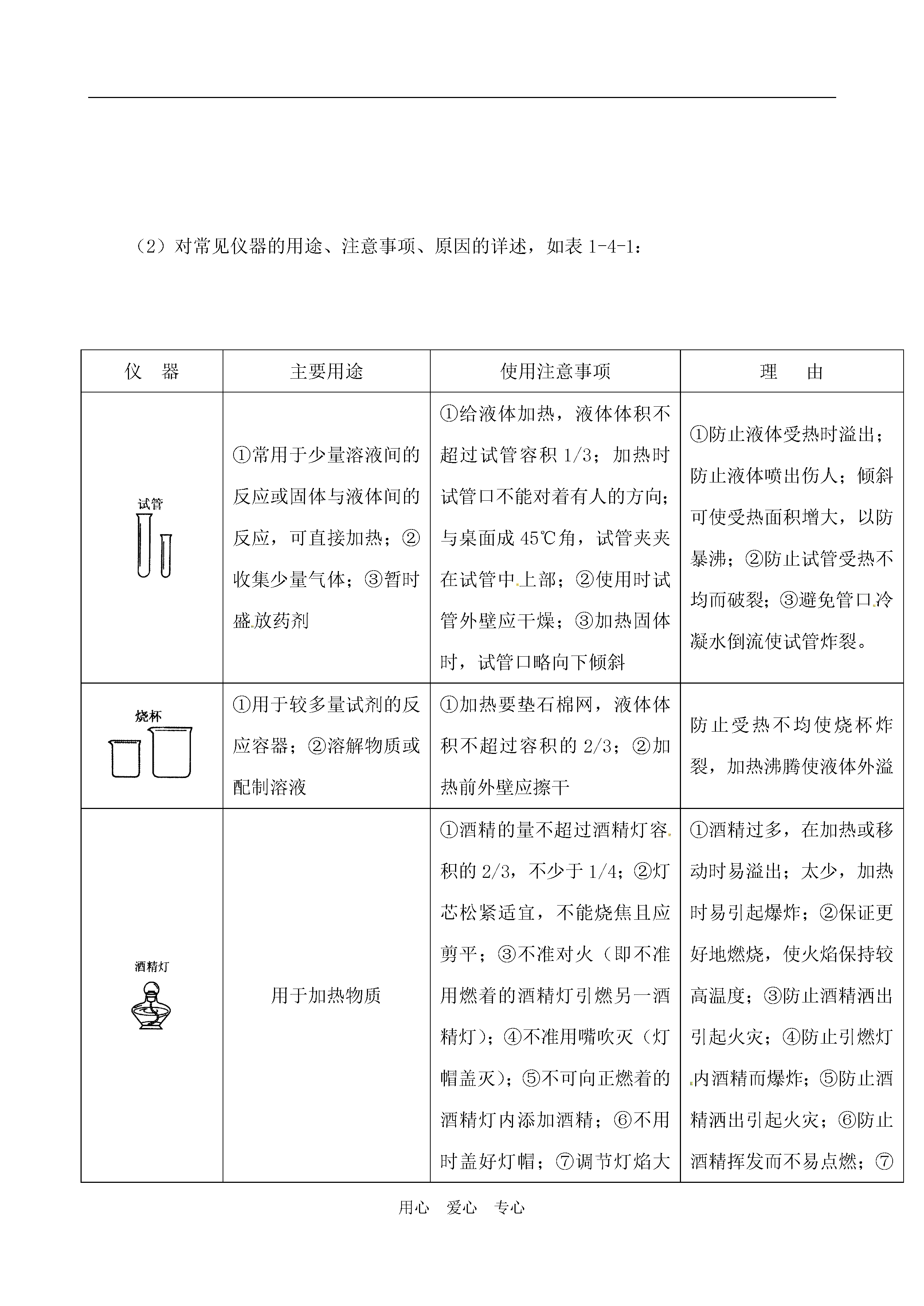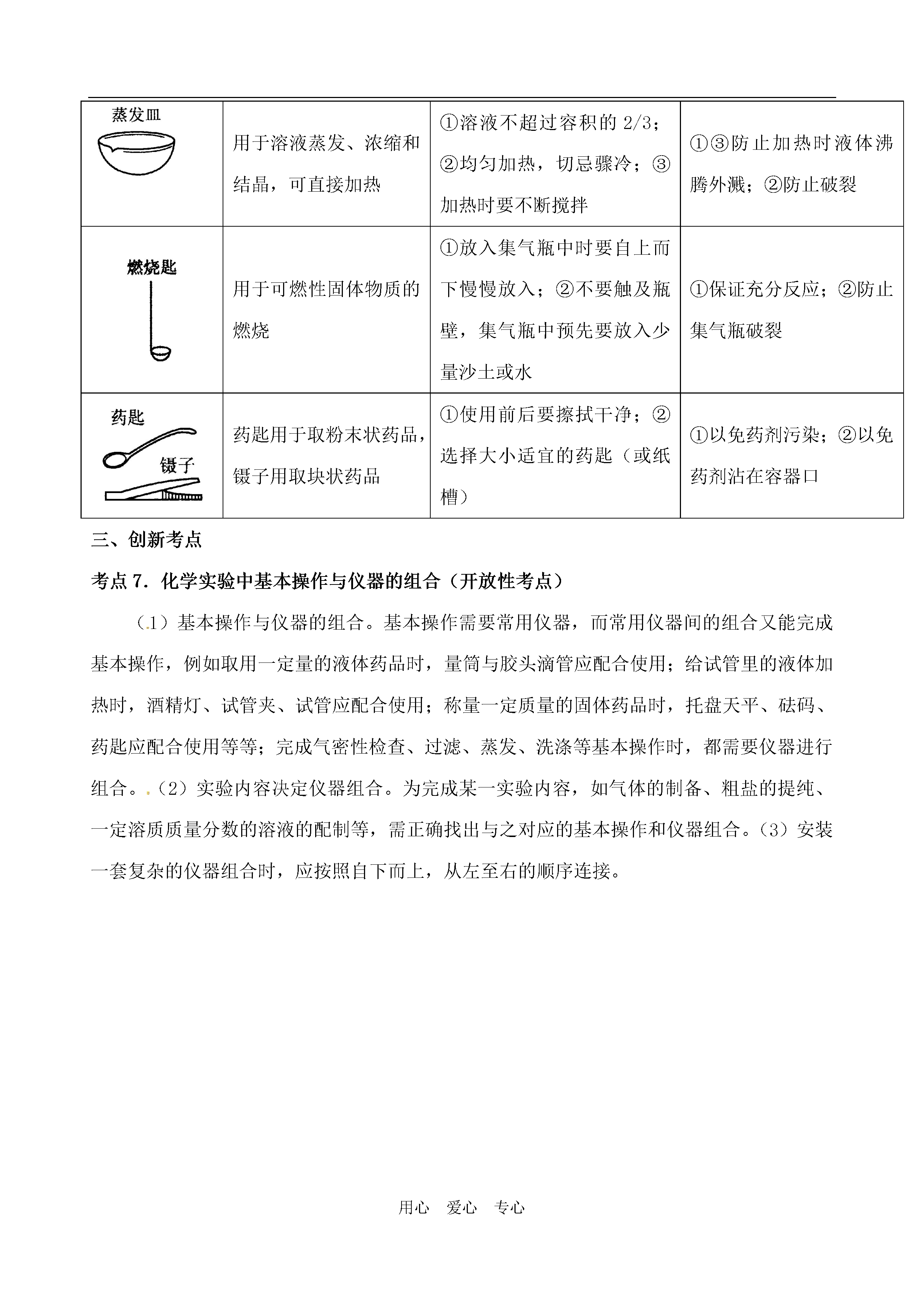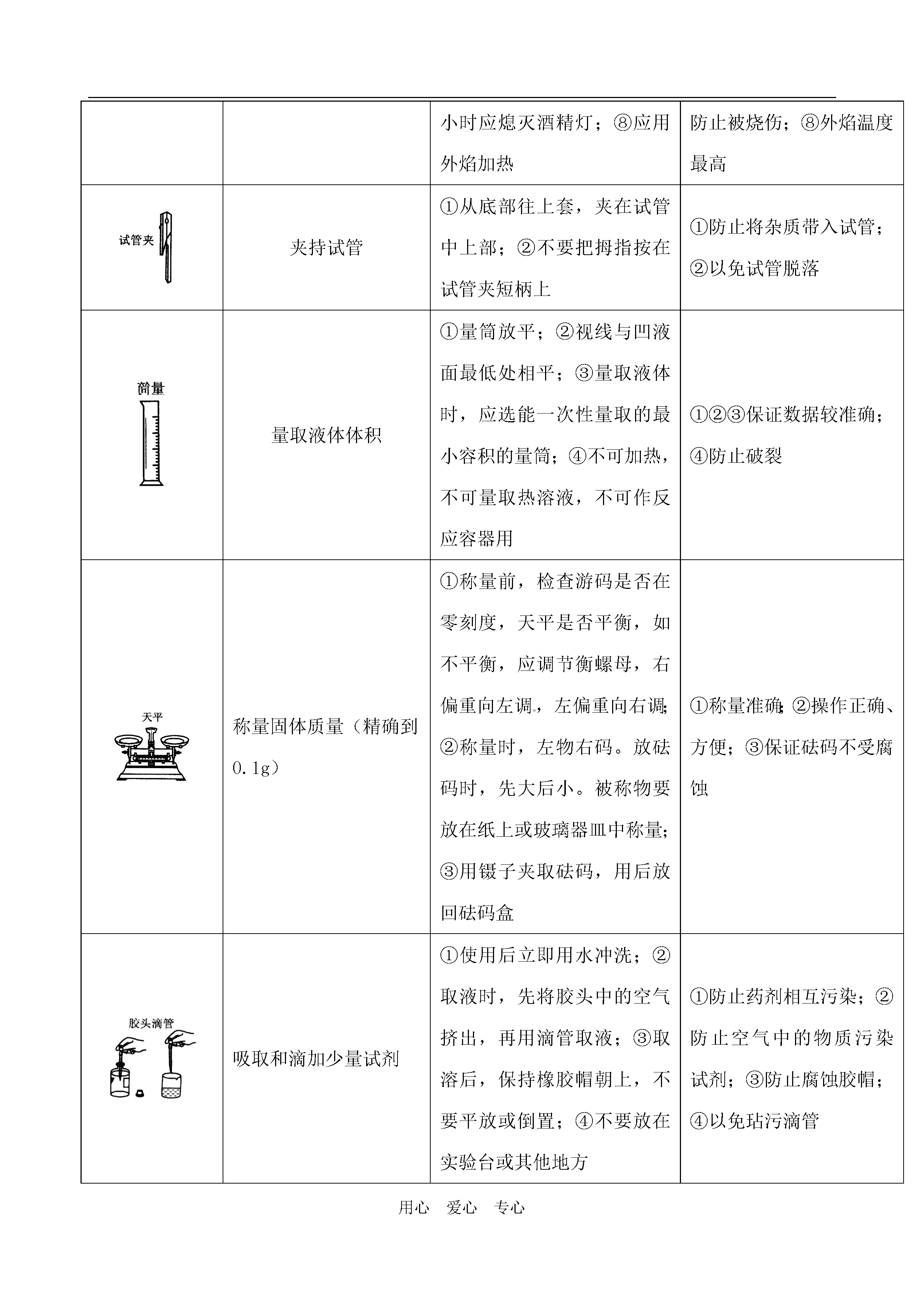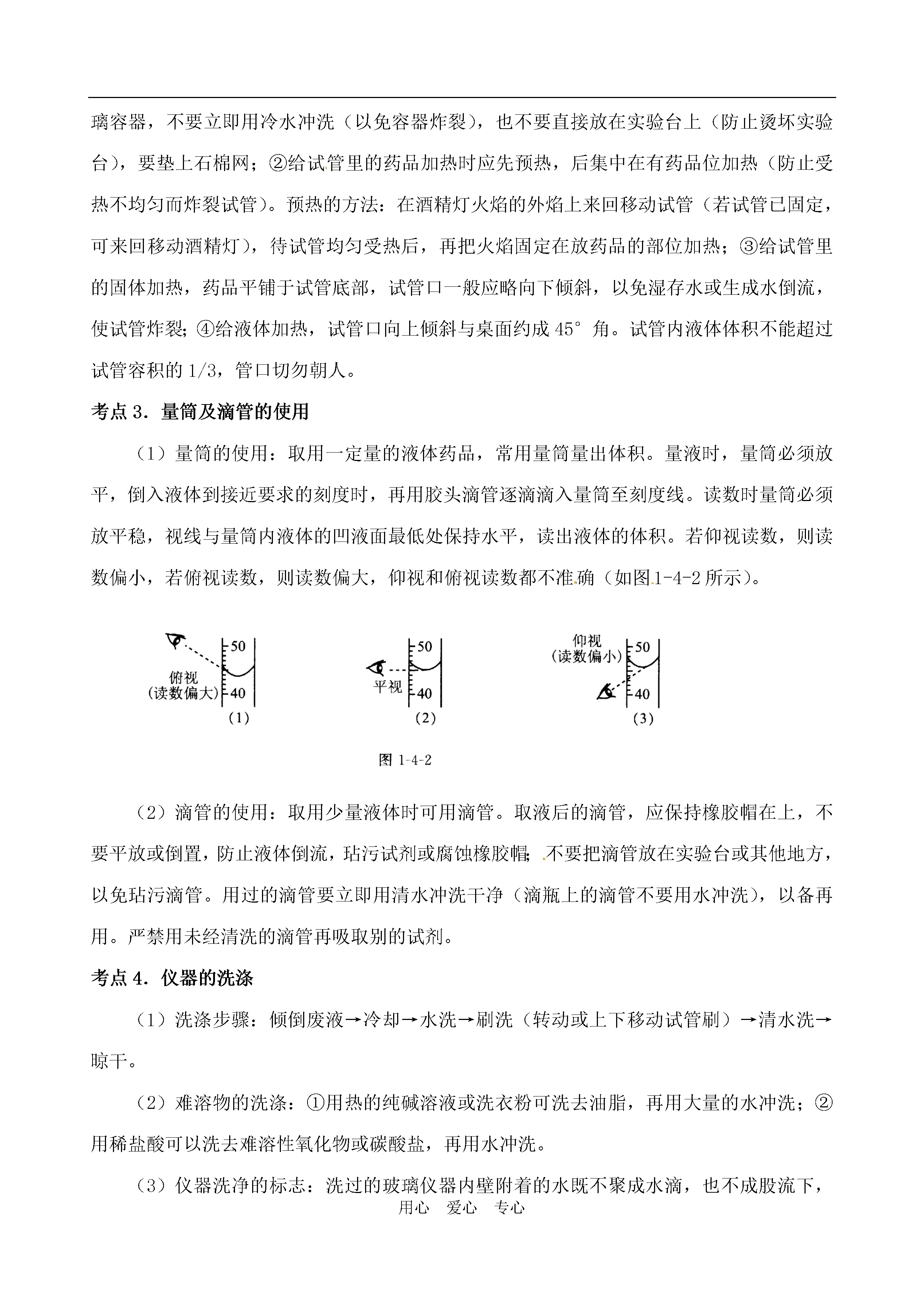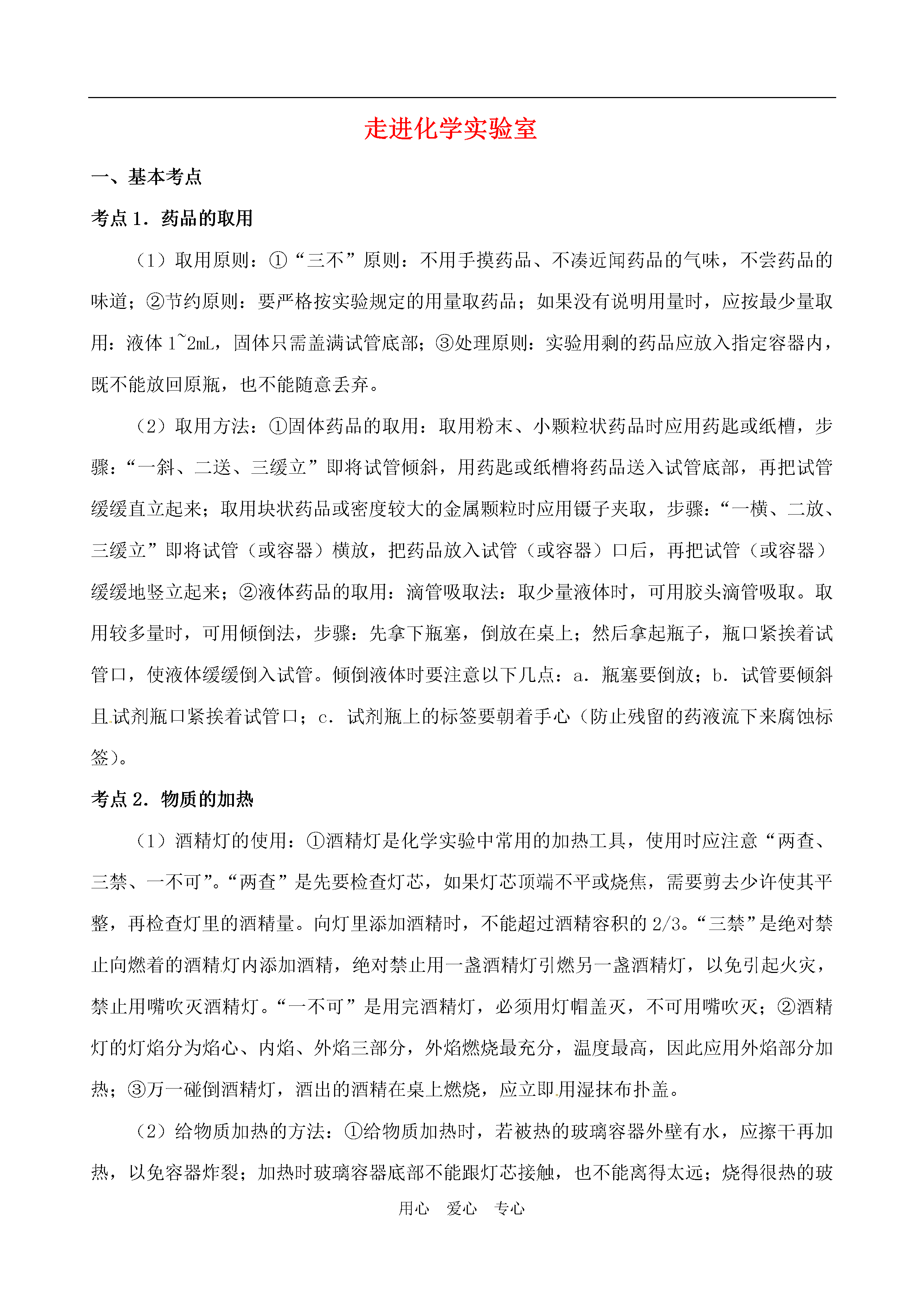 用心爱心专心走进化学实验室一、基本考点考点1.药品的取用(1)取用原则:①“三不”原则:不用手摸药品、不凑近闻药品的气味,不尝药品的味道;②节约原则:要严格按实验规定的用量取药品;如果没有说明用量时,应按最少量取用:液体1~2mL,固体只需盖满试管底部;③处理原则:实验用剩的药品应放入指定容器内,既不能放回原瓶,也不能随意丢弃。(2)取用方法:①固体药品的取用:取用粉末、小颗粒状药品时应用药匙或纸槽,步骤:“一斜、二送、三缓立”即将试管倾斜,用药匙或纸槽将药品送入试管底部,再把试管缓