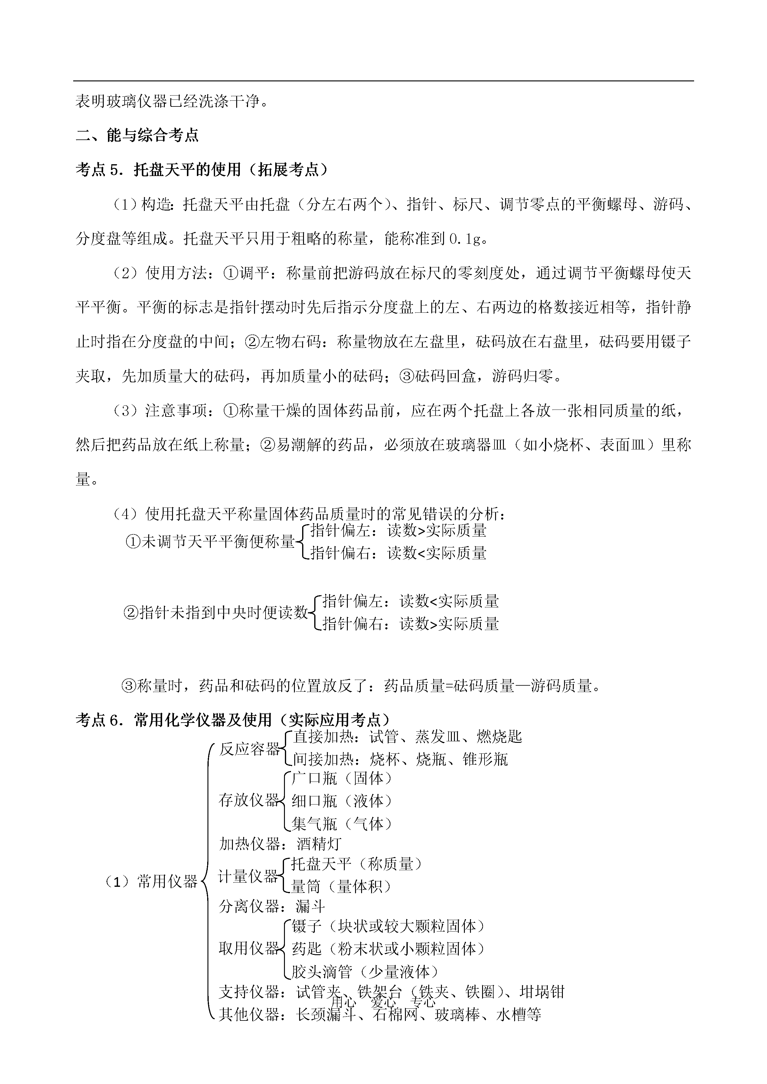 走进化学实验室一、基本考点考点1.药品的取用(1)取用原则:①“三不”原则:不用手摸药品、不凑近闻药品的气味,不尝药品的味道;②节约原则:要严格按实验规定的用量取药品;如果没有说明用量时,应按最少量取用:液体1~2mL,固体只需盖满试管底部;③处理原则:实验用剩的药品应放入指定容器内,既不能放回原瓶,也不能随意丢弃.(2)取用方法:①固体药品的取用:取用粉末、小颗粒状药品时应用药匙或纸槽,步骤:“一斜、二送、三缓立”即将试管倾斜,用药匙或纸槽将药品送入试管底部,再把试管缓缓直