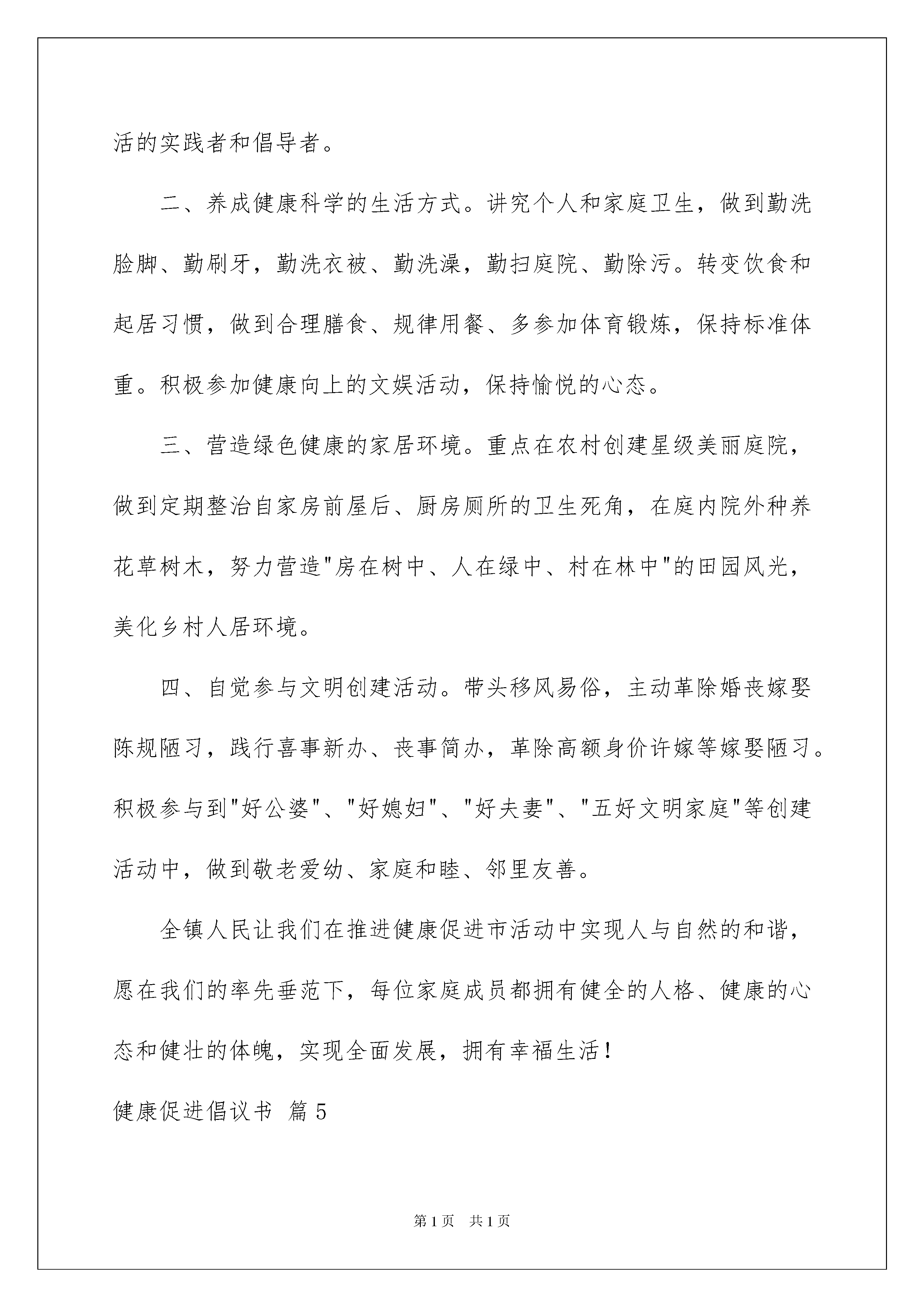 2022健康促进倡议书范文健康促进倡议书范文在生活中,倡议书对我们的作用越来越大,倡议书不是对某个人或某一小集体而发的,它的受众往往是广大群众,或是部门的所有人,或是一个地区的所有人,甚至是全国人民。那么问题来了,到底应如何写一份恰当的倡议书呢?下面是我帮大家整理的健康促进倡议书范文,希望能够帮助到大家。健康促进倡议书1尊敬的各位领导、各位来宾:我们