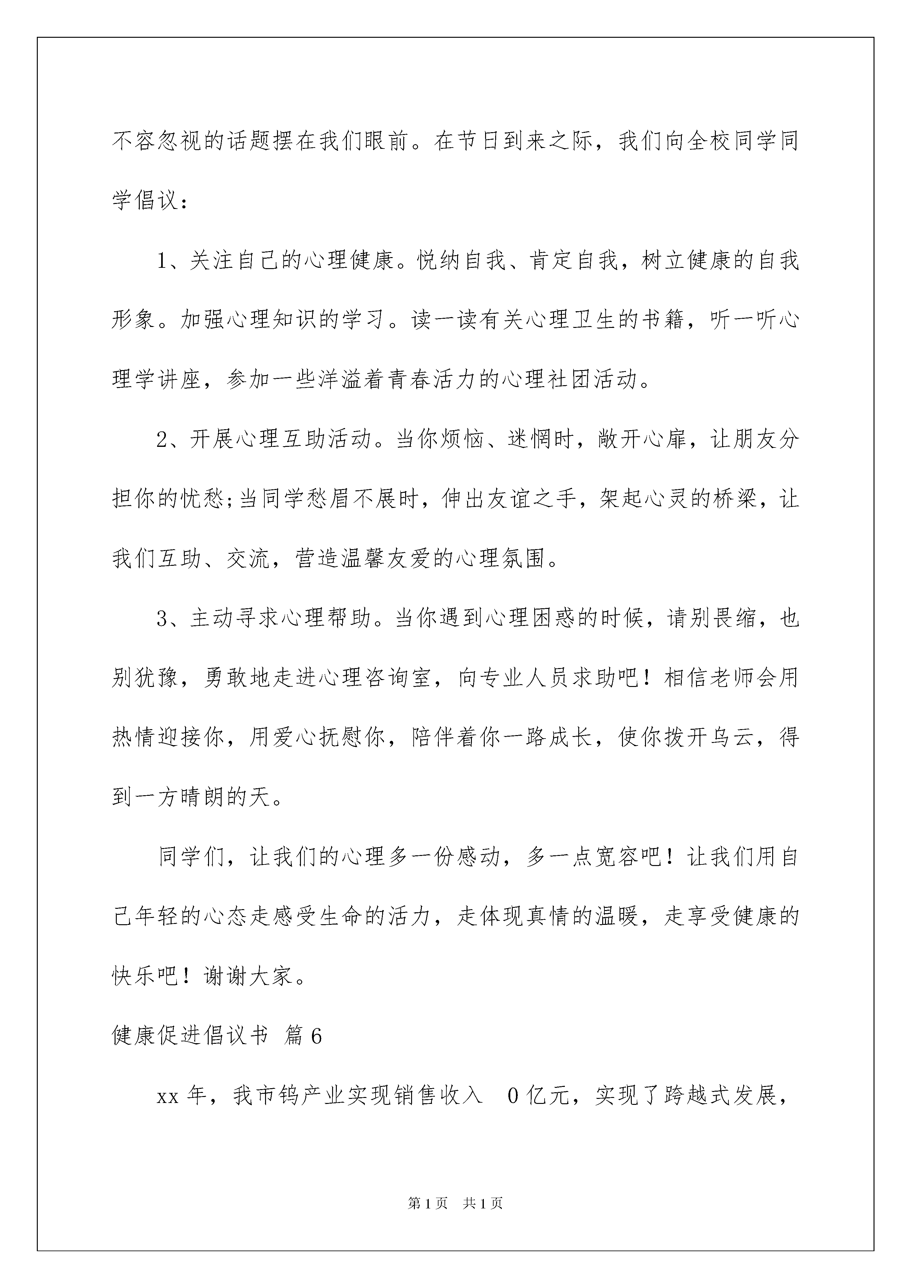 2022健康促进倡议书范文汇总10篇健康促进倡议书范文汇总10篇在不断进步的社会中,用到倡议书的地方越来越多,不同的倡议书内容同样也是不同的。你所见过的倡议书是什么样的呢?以下是我帮大家整理的健康促进倡议书10篇,希望对大家有所帮助。健康促进倡议书篇120xx年,我市钨产业实现销售收入110亿元,实现了跨越式发展,赣州钨业界正在呈现一派生机勃勃的繁荣
