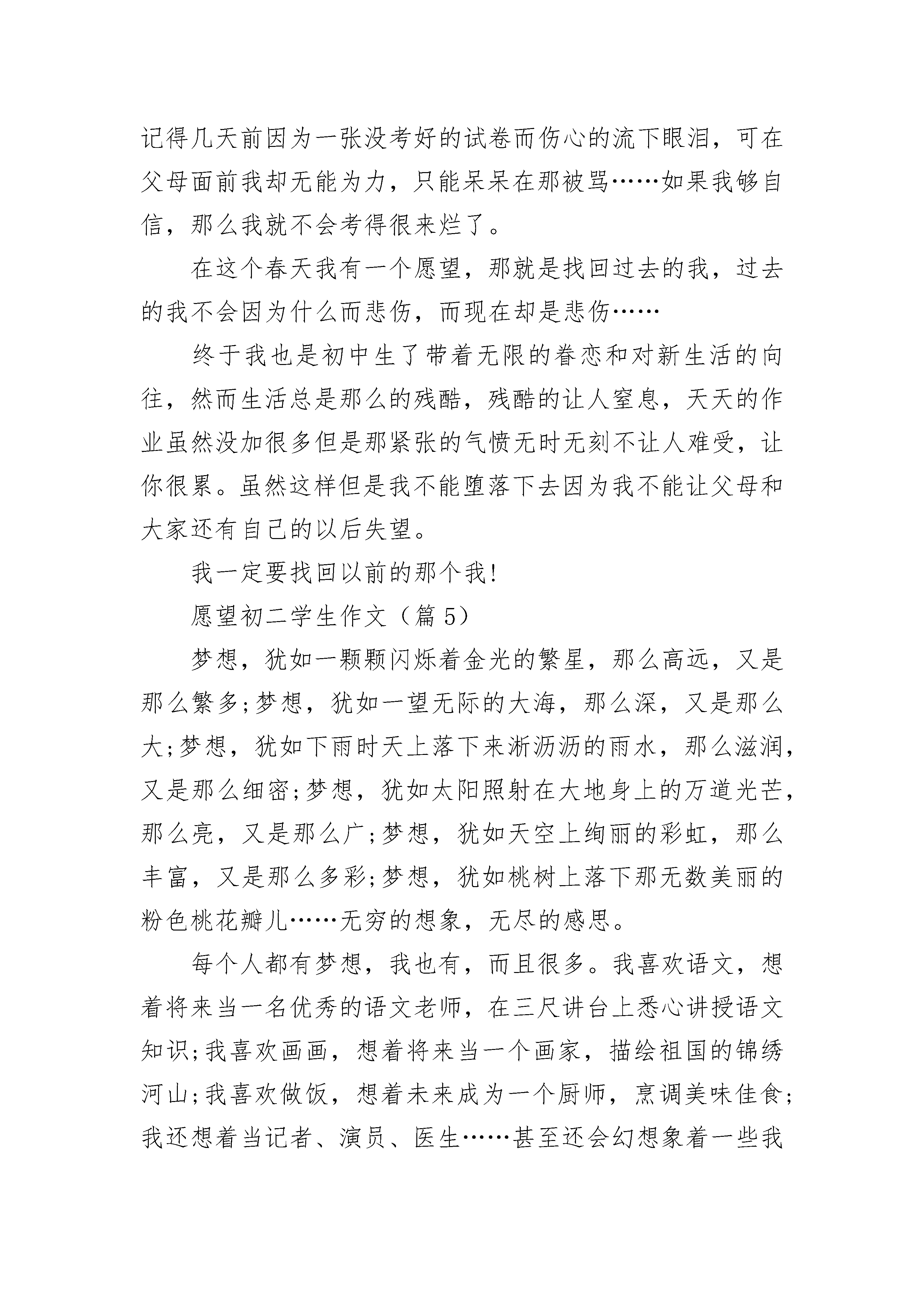 初二学生的愿望作文初二学生的愿望作文在平平淡淡的日常中,大家都写过作文吧,作文是一种言语活动,具有高度的综合性和创造性。如何写一篇有思想、有文采的作文呢?以下是小编收集整理的初二学生的愿望作文,欢迎大家借鉴与参考,希望对大家有所帮助。“许愿纸打结了,是时候起逞了。”在静谧的夜晚,聆听着杨青倩歌唱的那首《长大》,总感觉那疲倦的心会得到安抚,心中的烦恼也会随着歌声飞走。时间年复一年的流逝,从最初的`号啕大哭的宝贝,然后是乘巧怜利的小女孩,再到现在的亭亭玉立的少女。时光像旋转木马一样不停的奔跑、旋转。猛然间,我