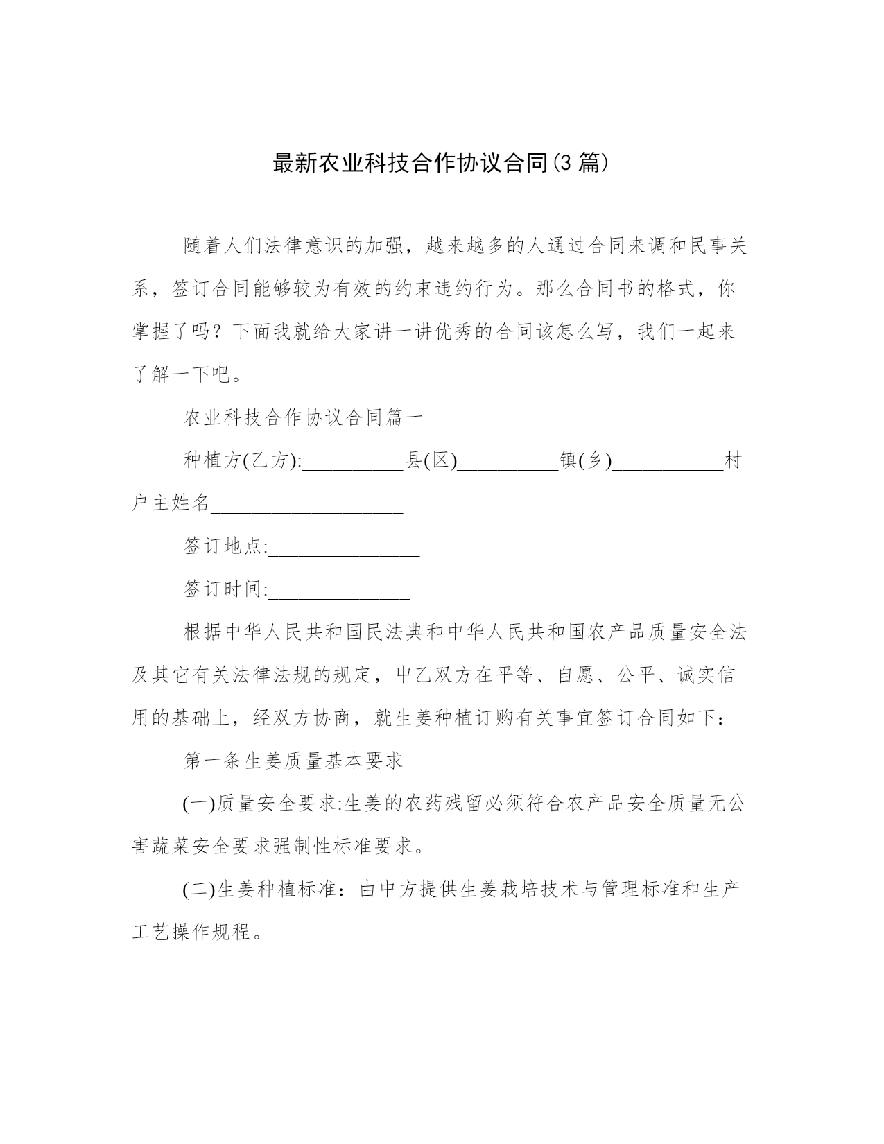 最新农业科技合作协议合同(3篇)随着人们法律意识的加强,越来越多的人通过合同来调和民事关系,签订合同能够较为有效的约束违约行为。那么合同书的格式,你掌握了吗?下面我就给大家讲一讲优秀的合同该怎么写,我们一起来了解一下吧。农业科技合作协议合同篇一种植方(乙方):__________县(区)__________镇(乡)___________村户主姓名___________________签订地点:_______________签订时间:______________根据中华人民共和国民法典和中华人民共和国农产品