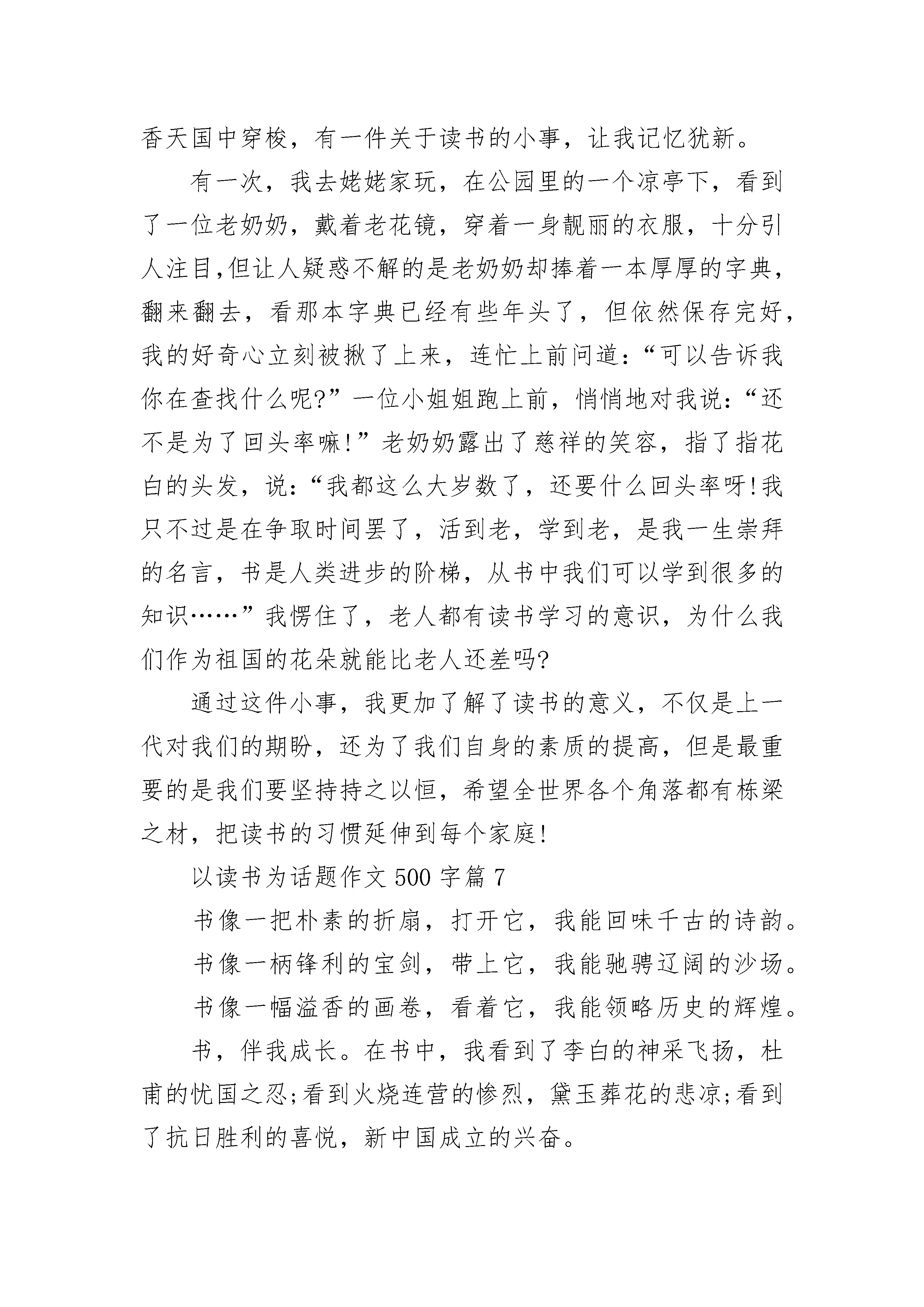 关于以读书为话题的作文生活中,大家都经常接触到以读书为话题的作文,话题作文是规定了表达的中心内容,而不限制取材范围和表达方式的作文形式。下面是小编为大家精心整理的关于以读书为话题的作文,希望对大家有所帮助。关于以读书为话题的作文(篇1)在它的字里行间中,我了解到了她梦中的少女可望而不可即,读出了他内心的思念,寂寞和伤感。对此,我还品读过大量的古代诗集,从中我体会到了范仲淹“先天下之忧而忧,后天下之乐而乐”的爱国情怀,陶渊明“采菊东篱下,悠然见南山”的悠闲自在,白居易“座中泣下谁最多,江州司马青衫湿”的伤感