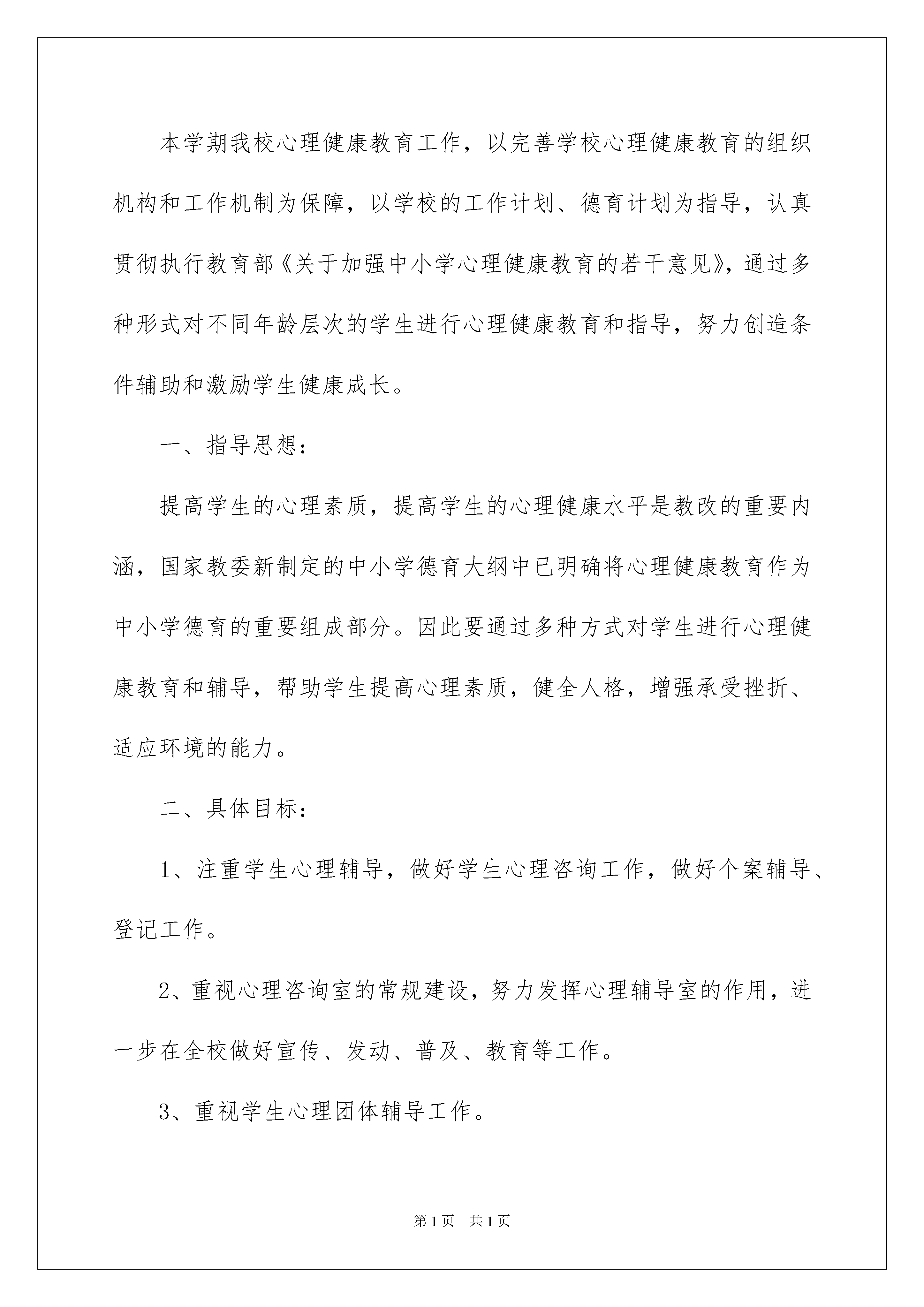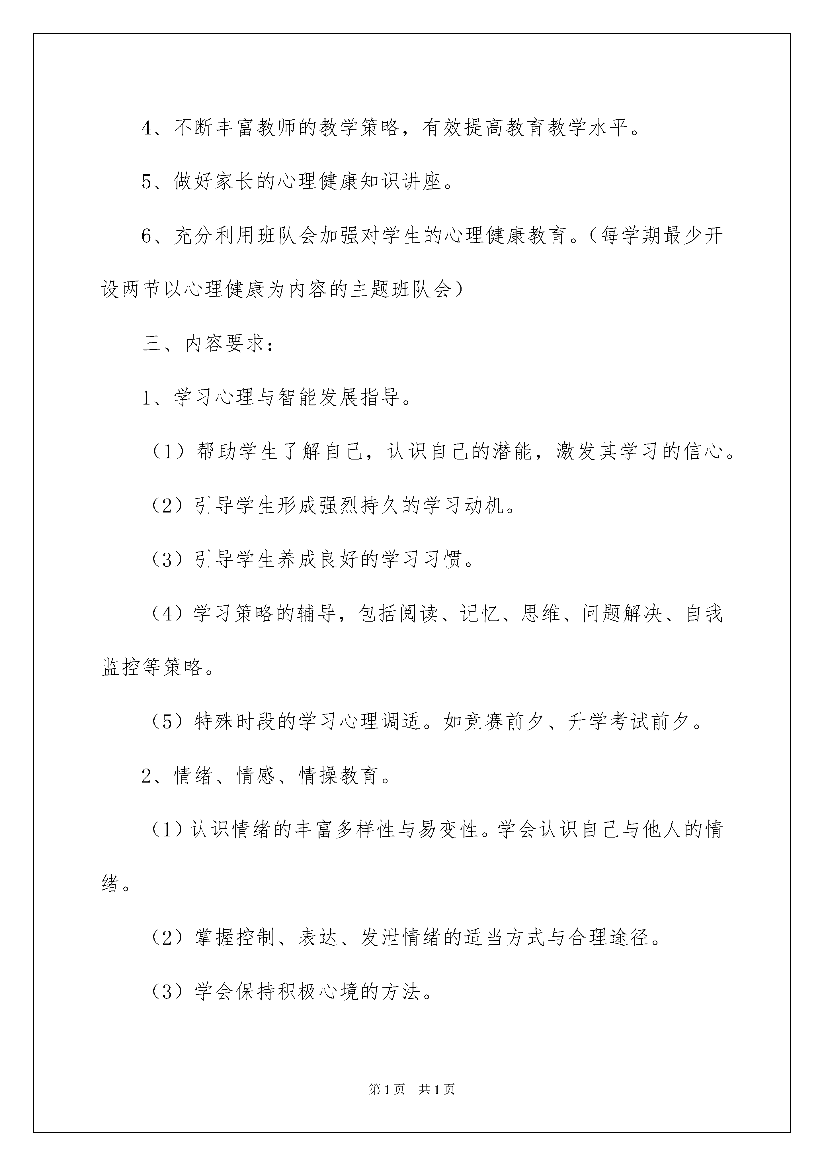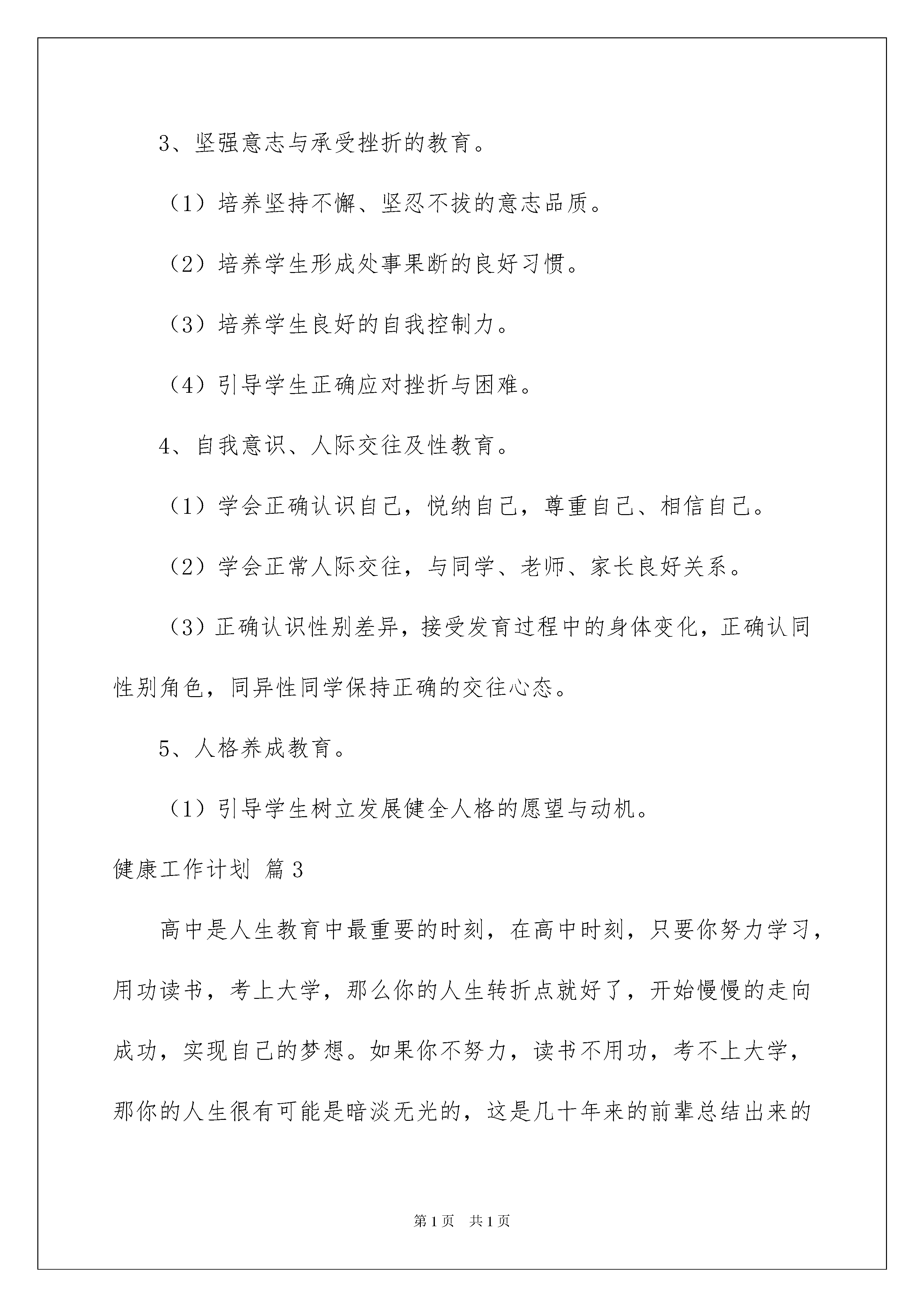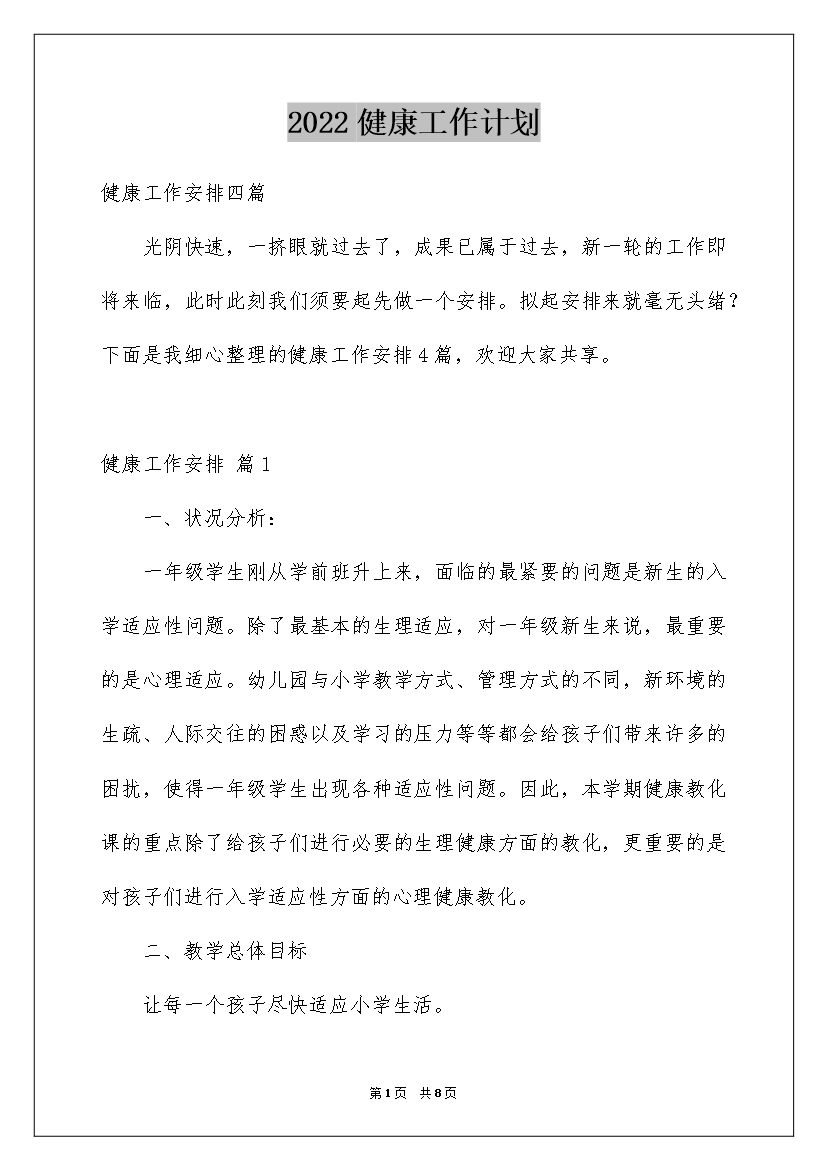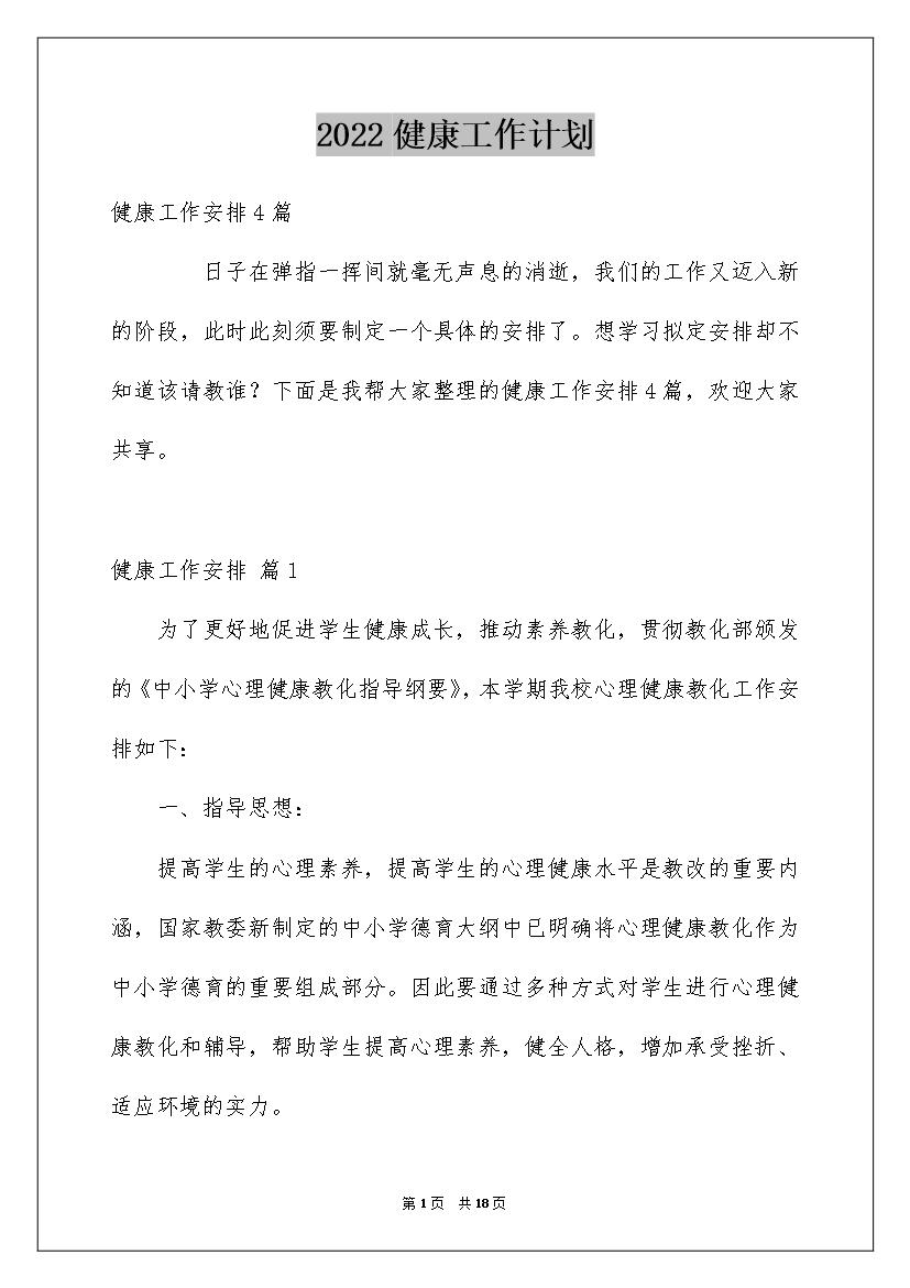 2022健康工作计划健康工作安排4篇日子在弹指一挥间就毫无声息的消逝,我们的工作又迈入新的阶段,此时此刻须要制定一个具体的安排了。想学习拟定安排却不知道该请教谁?下面是我帮大家整理的健康工作安排4篇,欢迎大家共享。健康工作安排篇1为了更好地促进学生健康成长,推动素养教化,贯彻教化部颁发的《中小学心理健康教化指导纲要》,本学期我校心理健康教化工作安排