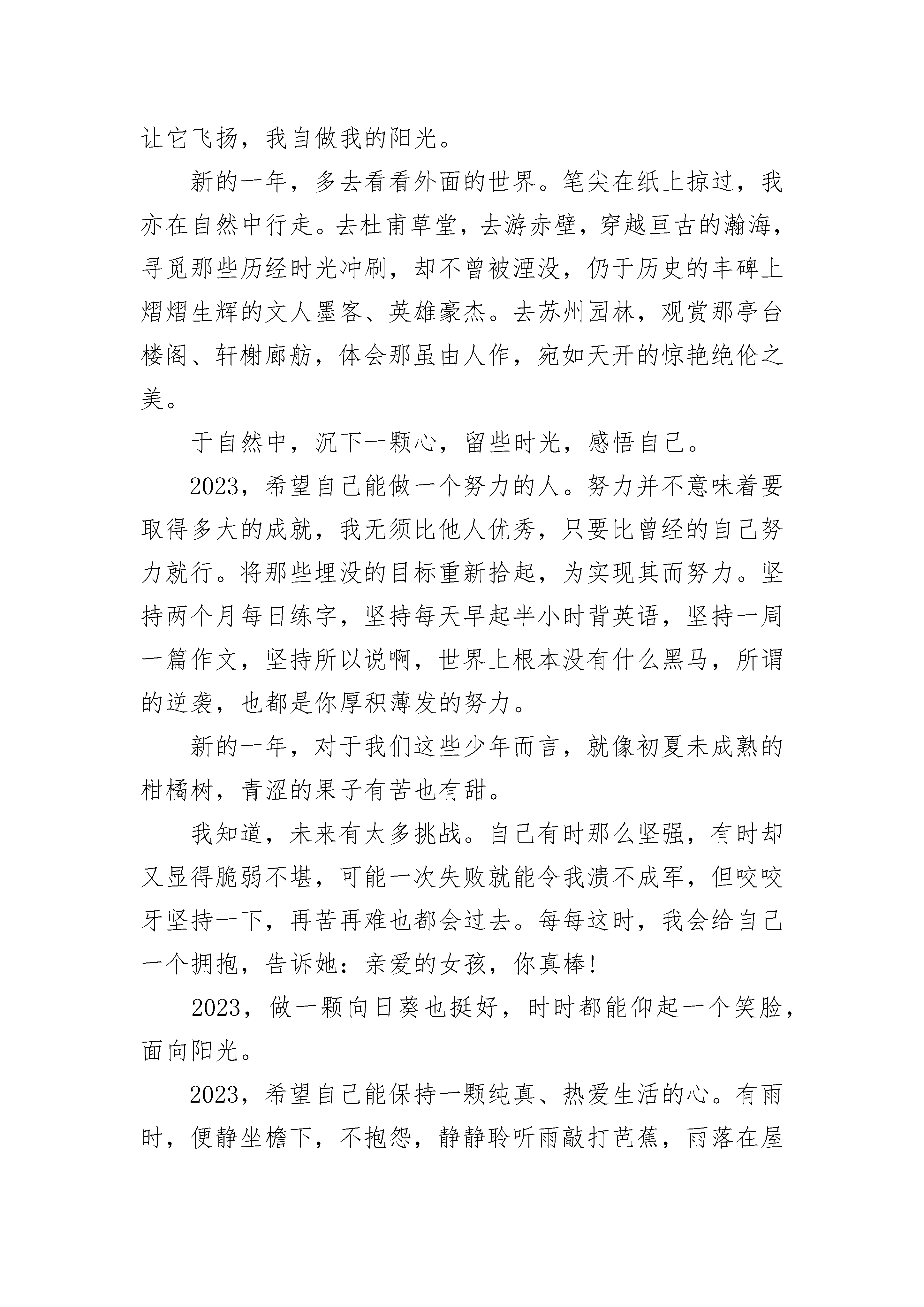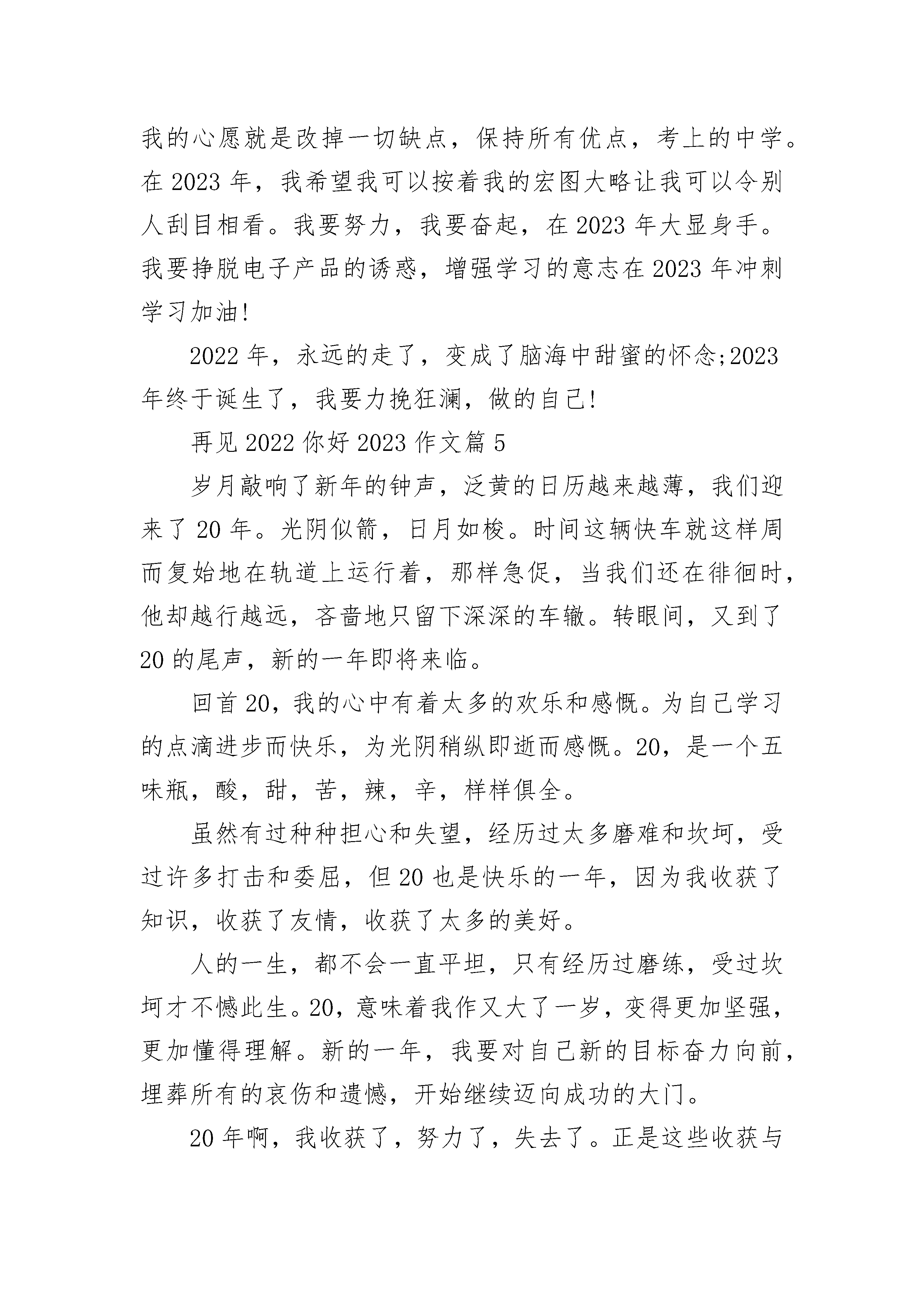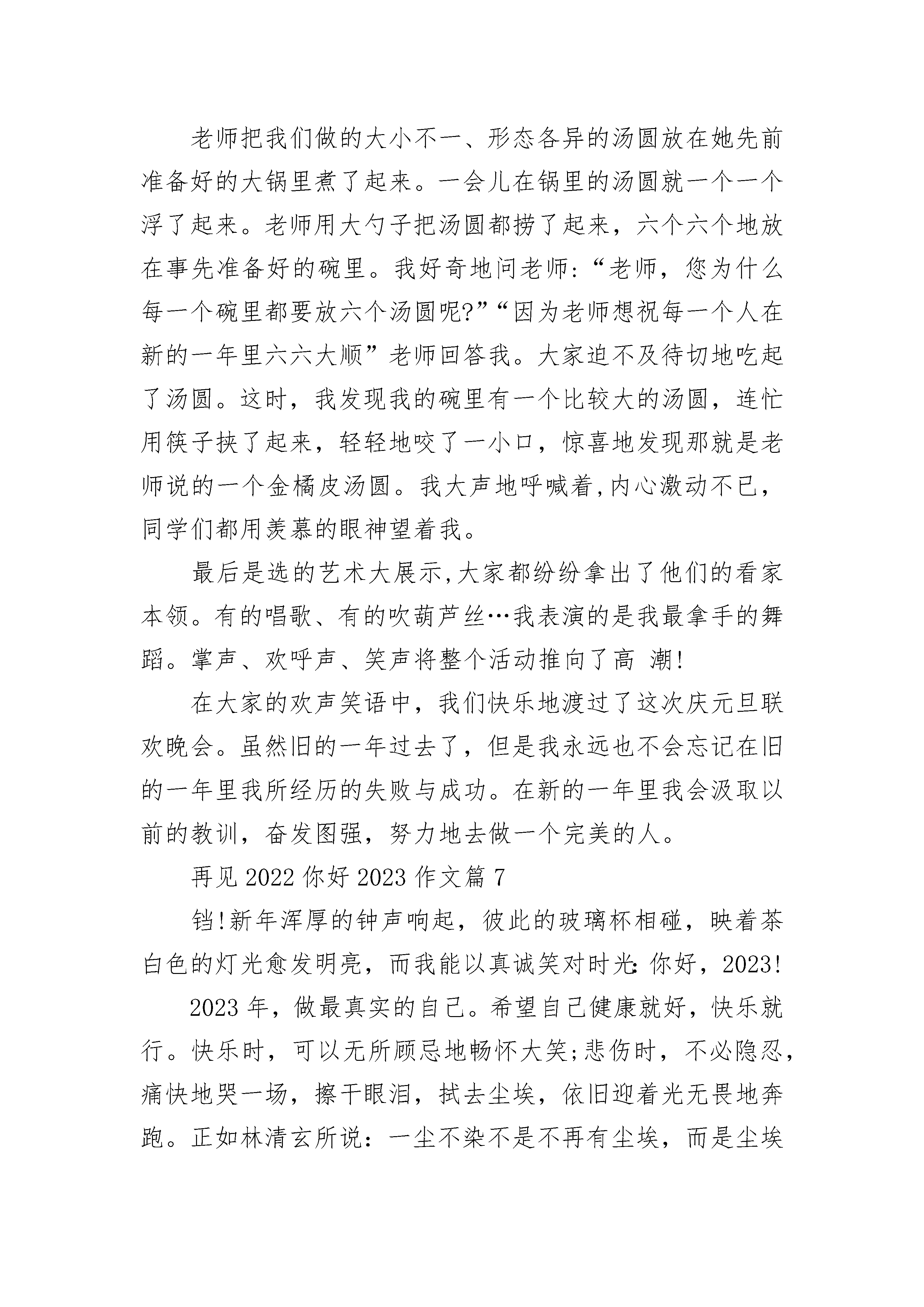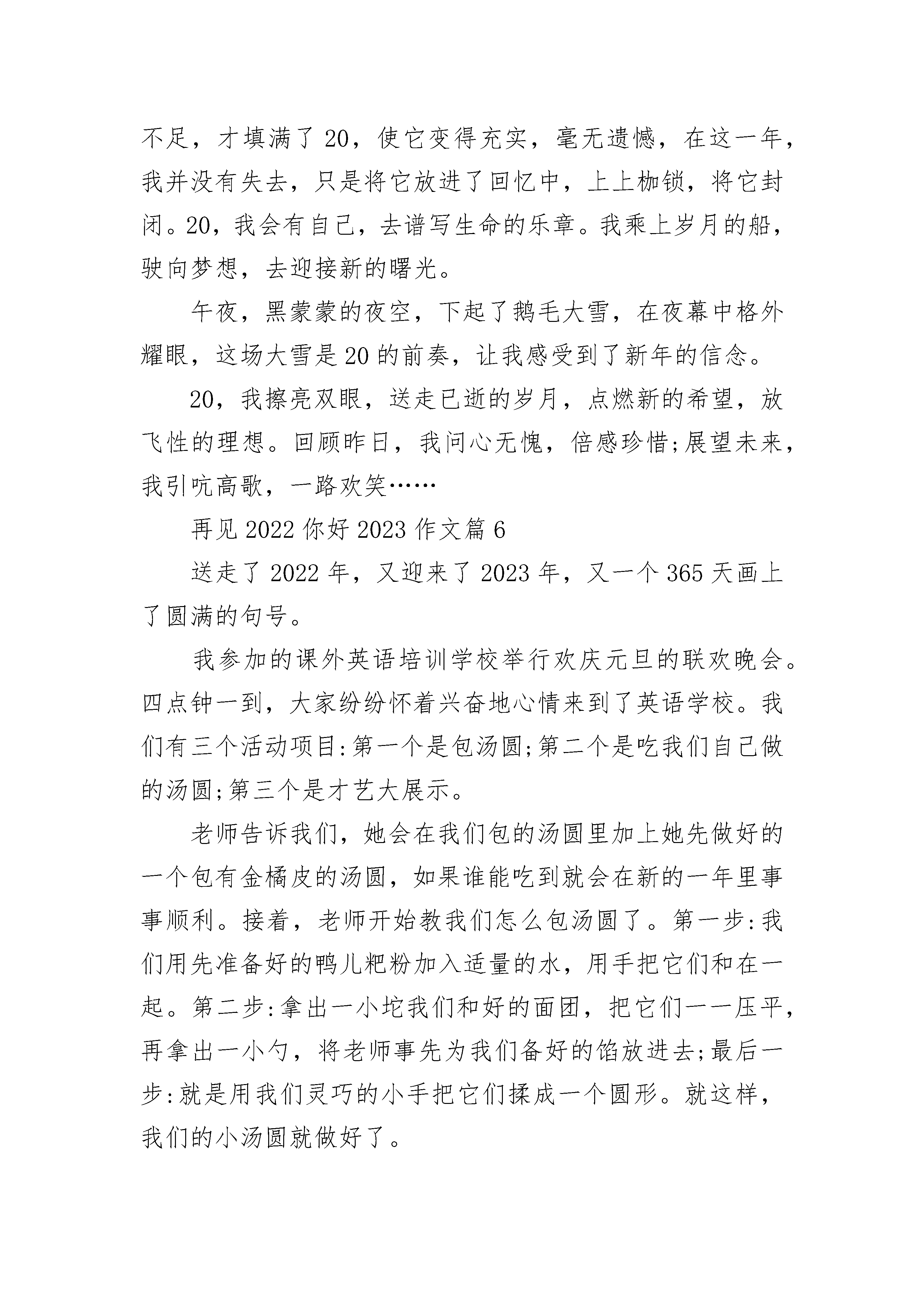关于再见2022你好2023作文精选关于再见2022你好2023作文精选5篇从零重新开始。为了新年的愿望,不可以输在起跑线上,所谓笨鸟先飞,先苦后甜。下面是小编为你准备的关于再见2022你好2023作文精选,快来借鉴一下并自己写一篇与我们分享吧!关于再见2022你好2023作文精选篇1岁月匆匆又一年,又一个元旦来临了。带着甜甜的笑容,迈着轻轻的脚步,踏上飞速行驶的时光列车,走进了又一个新年。置身于玻璃般晶莹如意的时空,陶醉在那么温馨美丽的暖暖冬日的天空,全身心地感受着新年青春的气息。让我们引吭高歌,让我们