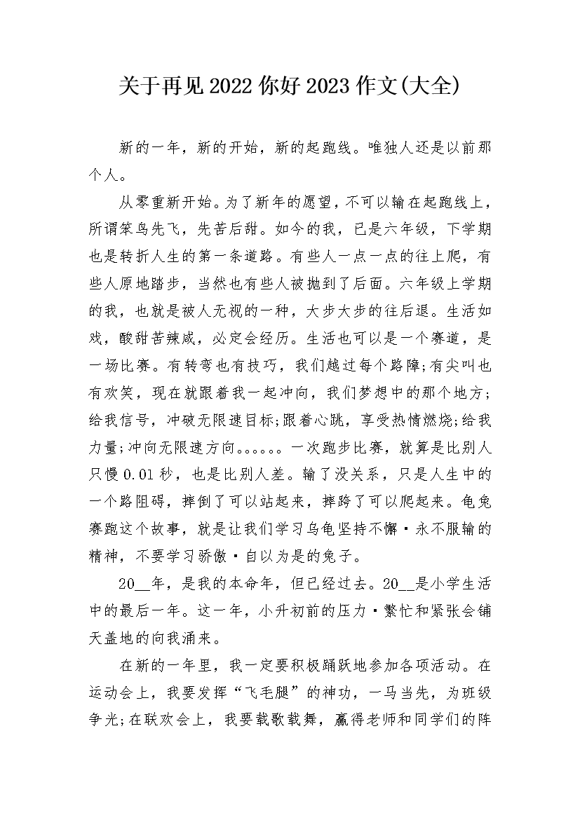关于再见2022你好2023作文(大全)新的一年,新的开始,新的起跑线。唯独人还是以前那个人。从零重新开始。为了新年的愿望,不可以输在起跑线上,所谓笨鸟先飞,先苦后甜。如今的我,已是六年级,下学期也是转折人生的第一条道路。有些人一点一点的往上爬,有些人原地踏步,当然也有些人被抛到了后面。六年级上学期的我,也就是被人无视的一种,大步大步的往后退。生活如戏,酸甜苦辣咸,必定会经历。生活也可以是一个赛道,是一场比赛。有转弯也有技巧,我们越过每个路障;有尖叫也有欢笑,现在就跟着我一起冲向,我们梦想中的那个地方