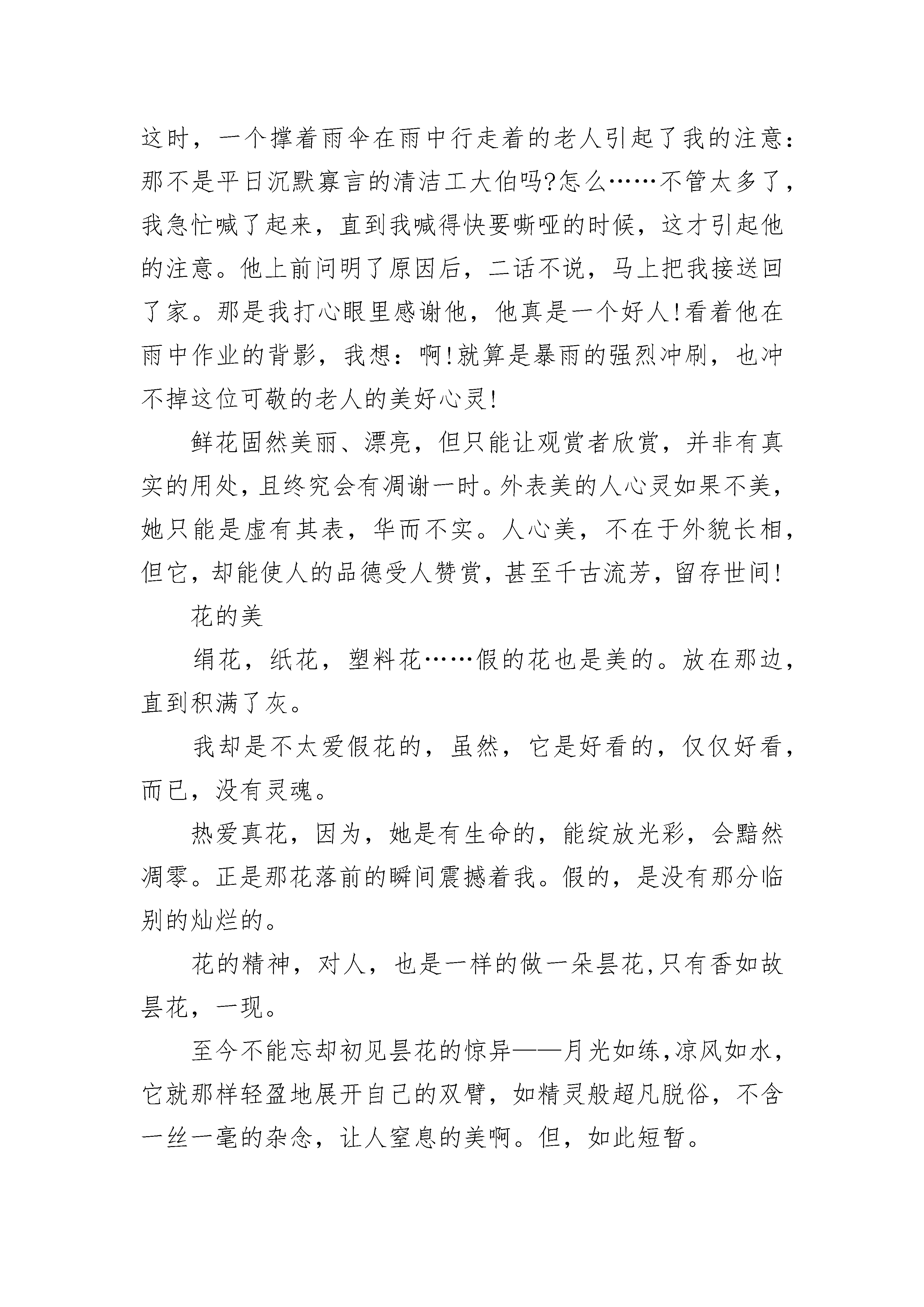 关于平凡之美话题作文什么才是真正的美丽?在词典中,美丽是好看、漂亮的意思。在自然中,开屏的孔雀、盛开的玫瑰是美丽的,但所有的事物都是这样的吗?直到遇到了她,我才明白什么是真正的美丽。约摸是去年年底,我坐公交车去朋友家,虽然车上人不多,但我还是很不幸,没有一个位置。一上车,我的眼球便被一个漂亮的时尚女孩给吸引了,她穿着时尚又不怪异、打扮很前卫又不失风度,颇有一点高雅,再加上她天生长得就很漂亮,坐姿优雅,闭上眼听音乐时的美丽几乎是无与伦比的。车内的乘客都时不时地会偷瞧她几眼,当然我也不例外。与她相比,她座位后