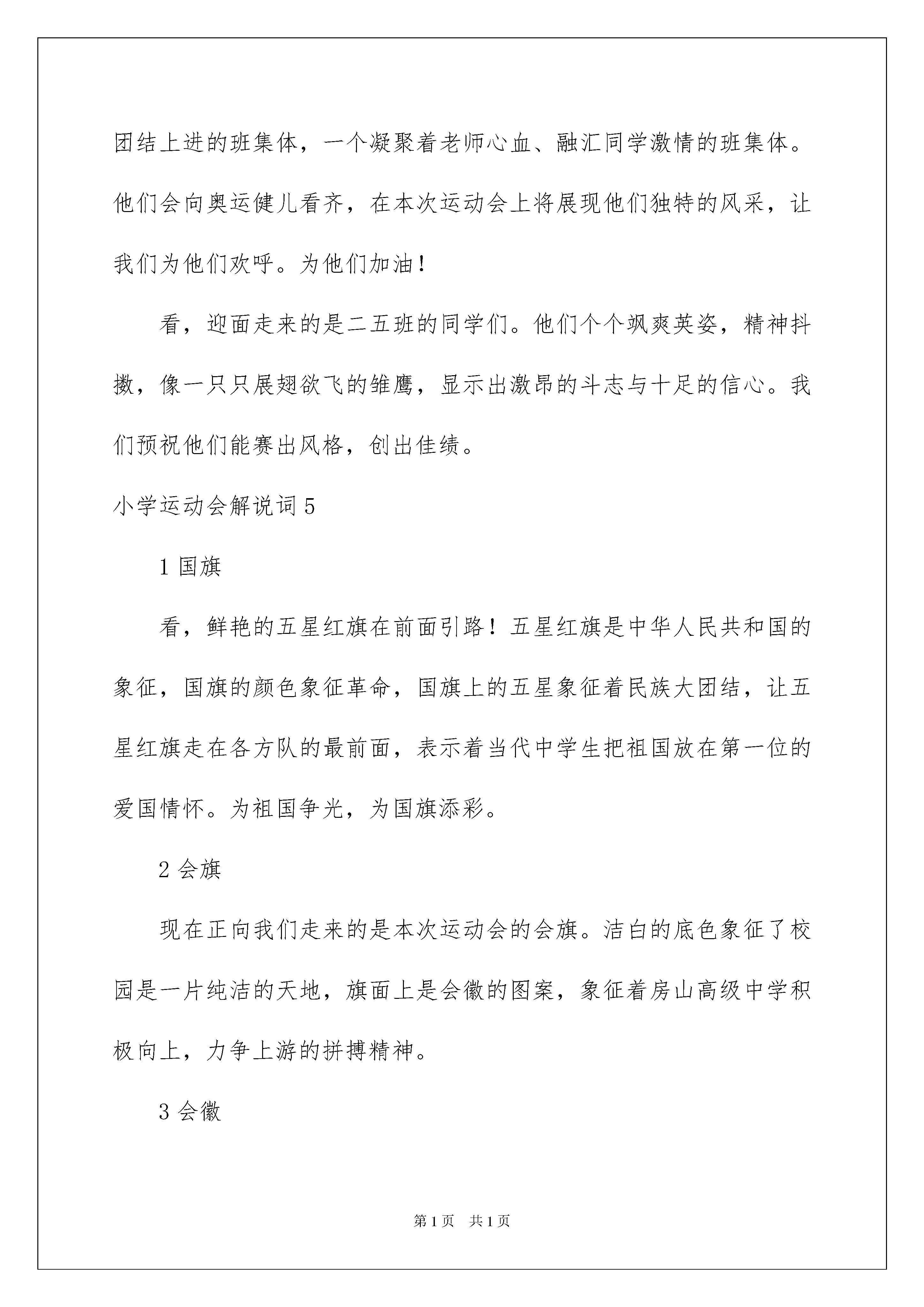 2022小学运动会解说词小学运动会解说词现如今,我们使用上解说词的情况与日俱增,解说词有解释、深化、概括的作用。如何写一份恰当的解说词呢?下面是我为大家整理的小学运动会解说词,欢迎大家借鉴与参考,希望对大家有所帮助。小学运动会解说词11、二年(1)班小朋友,活泼可爱,就像一只只小雏鹰,将要展翅飞翔在蓝天上。他们正准备着:不断陶冶道德品质,努力学习文化知识,积极参加体育锻炼。现在,他们虽然比较稚嫩,但还是健康、有朝气地向大家走来。2、现在走来的是2年(2)班代表队,他们是校园中的小精灵,活泼可爱是他们最大的特点,团结拼搏是他们争取好成绩的源泉。虽然他们年纪小可志气大。大哥哥、大姐姐,请看2年(2)班的精彩表演吧。小学运动会解说词2伴着鲜明的动感,奏响青春的活力,踏着欢快的节拍,由昌邑市实验中学600名学生组成的韵律操方队向我们走来,他们为我们带来的是韵律操《放飞梦想舞动青春》。这是一群青春飞扬的中学生,青春的豪迈在他们地眉宇间闪现,青春的活力在他们的步伐中流淌;这是一群激情四射的中学生,自信与奋进在他们胸中涌动,梦想与憧憬在他们的指间跳跃。听,欢快地节奏催人奋进,跳跃的音符荡人心弦;看,智慧的火花在节奏中迸发,奋进的激情在音符中闪现;瞧,他们热情奔放,用执着放飞信念与理想,他们动作舒展,以努力书写着明天与希望。他们正在通过各种队形的变化来把运动的旋律飞扬,把青春的活力吟唱。他们展现了当代青年人热情洋溢、激情似火的情怀,他们积极向上,他们奋发图强。他们,不愧是祖国未来的未来;他们,不愧是祖国的栋梁!现在为大家展示的队形,四周镶嵌四个三角形,环绕着正中造型优雅的Y字型,像张开双臂拥抱“教育之春”的巨人,寓意着昌邑的教育事业永远积极进取,青春常在!现在为大家展示的队形,犹如一轮春生的朝阳,象征着昌邑市的教育事业像光芒四射的太阳,让青春放射光芒,以激情舞动韵律,让我们大家一起憧憬未来,放飞希望!看,绚丽的彩虹从场上升起,同时也自我们每个人的心中升起。这缤纷的彩虹既是实验中学学生生活的真实写照,也是对我们昌邑教育累累硕果的肯定,更是对教育事业美好明天的诚挚祝福!愿这霞光万道的彩虹,不但永远漂浮在天际,更能永远驻留在人们的心海。青春的活力让我们深深回味,回味生命的美丽和青春的豪放;青春的美丽让我们激情澎湃,澎湃中涌动着创造的冲动和梦想!最后,让我们代表实验中学全体师生,预祝运动会圆满成功。小学运动会解说词3一(1)班代表队:迎面走来的是一(1)班代表队,这是一支奋发拼搏的队伍,这是一个勇于开拓的班集体。他们团结,他们奋进,他们有美好的梦想和追求。我们坚信,他们的明天会更美好!一(2)班代表队:迎面走来的是一(2)班的小朋友他们个个脸上洋溢着灿烂的笑容。阳光、雨露沐浴着他们茁壮成长,老师的谆谆教导指引着他们前进的方向。看他们的步伐多么坚定,今天一(2)班要在运动会上展现他们全班师生的风采,大家为他们加油吧!一(3)班代表队:瞧!踩着整齐的步伐,雄赳赳,气昂昂地向主席台走来的是一(4)班代表队,虽然只有一年级,但个个人小志气高,为了能在这次运动会上为班级争光,大家都心往一处想,劲往一处使,不怕苦不怕累地积极锻炼,他们的口号是:“健康才有朝气!”让我们期待他们在运动场上出色的表演吧!二(1)班代表队:瞧!二(1)班代表队正意气风发、精神抖擞的向我们走来,整齐的步伐踏着他们的坚定,灿烂的微笑写着他们的热情。“强身健体,立志成材!”他们将用拼搏的汗水挥洒赛场,用激动的泪水拥抱胜利。二(2)班代表队:迎面走来了一支朝气蓬勃的代表队,他们英姿飒爽,步伐坚定,他们的脸上绽放着灿烂的笑容。“运动精神,激情无限”。他们坚信:二(2)班,不简单!二(3)班代表队:现在进入运动场的是二(3)班代表队,看!他们迈着整齐的步伐,个个精神抖擞,喜气洋洋,从他们那从容、兴奋的神情可以看出他们的信心十足,一定能在这次运动会中取得好成绩,用行动来证明他们是一个团结、拼搏、进取的集体!三(1)班代表队:仰着自信的笑脸,携着胜利的梦想,三(1)班代表队向我们走来了。他们是搏击苍穹的雄鹰,他们是展翅翱翔的大雁。他们顽强,他们坚定,奥运精神,永驻我心!三(2)班代表队:迎面而来的队伍是三(2)班代表队。这是一支纪律严明、团结协作、积极向上的队伍,瞧他们朝气蓬勃,精神抖擞,愿他们能在本次运动会中挥动激情,放飞梦想!三(3)班代表队:踏着整齐的步伐迎面向主席台走来的是三(3)班代表队,瞧,他们的笑容多么灿烂,一个个雄赳赳,气昂昂,多神气,在龙湾小学这片广阔的天空下,如雏鹰展翅,飞向更美好的未来!四(1)班代表队:现在面向我们走来的是