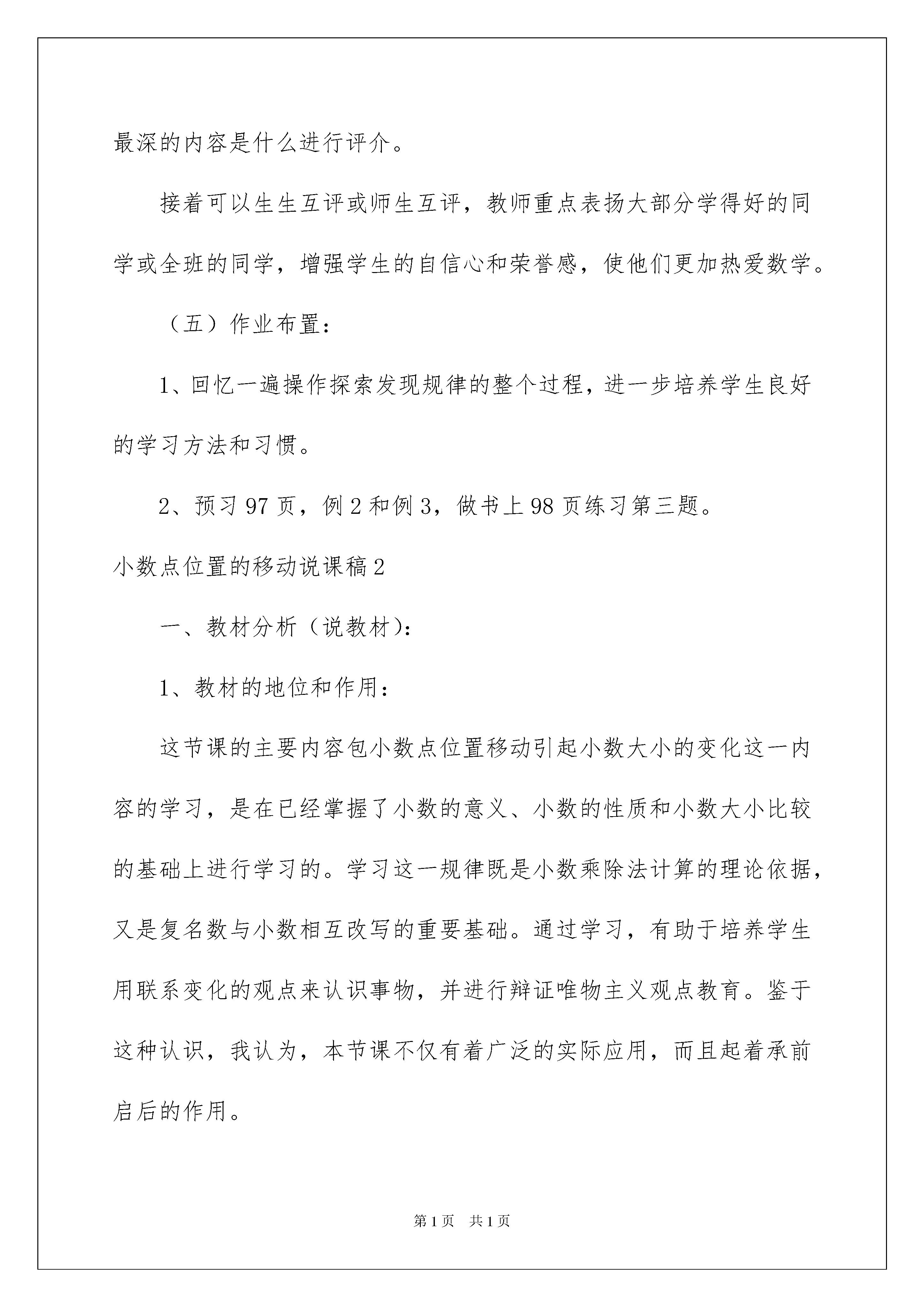 2022小数点位置的移动说课稿小数点位置的移动说课稿作为一名辛苦耕耘的教育工作者,常常要写一份优秀的说课稿,说课稿有助于顺利而有效地开展教学活动。那么你有了解过说课稿吗?下面是我整理的小数点位置的移动说课稿,仅供参考,希望能够帮助到大家。小数点位置的移动说课稿1一、说教材:1、说课内容:九年义务教育六年制小学数学第八册“小数点位置移动引起小数