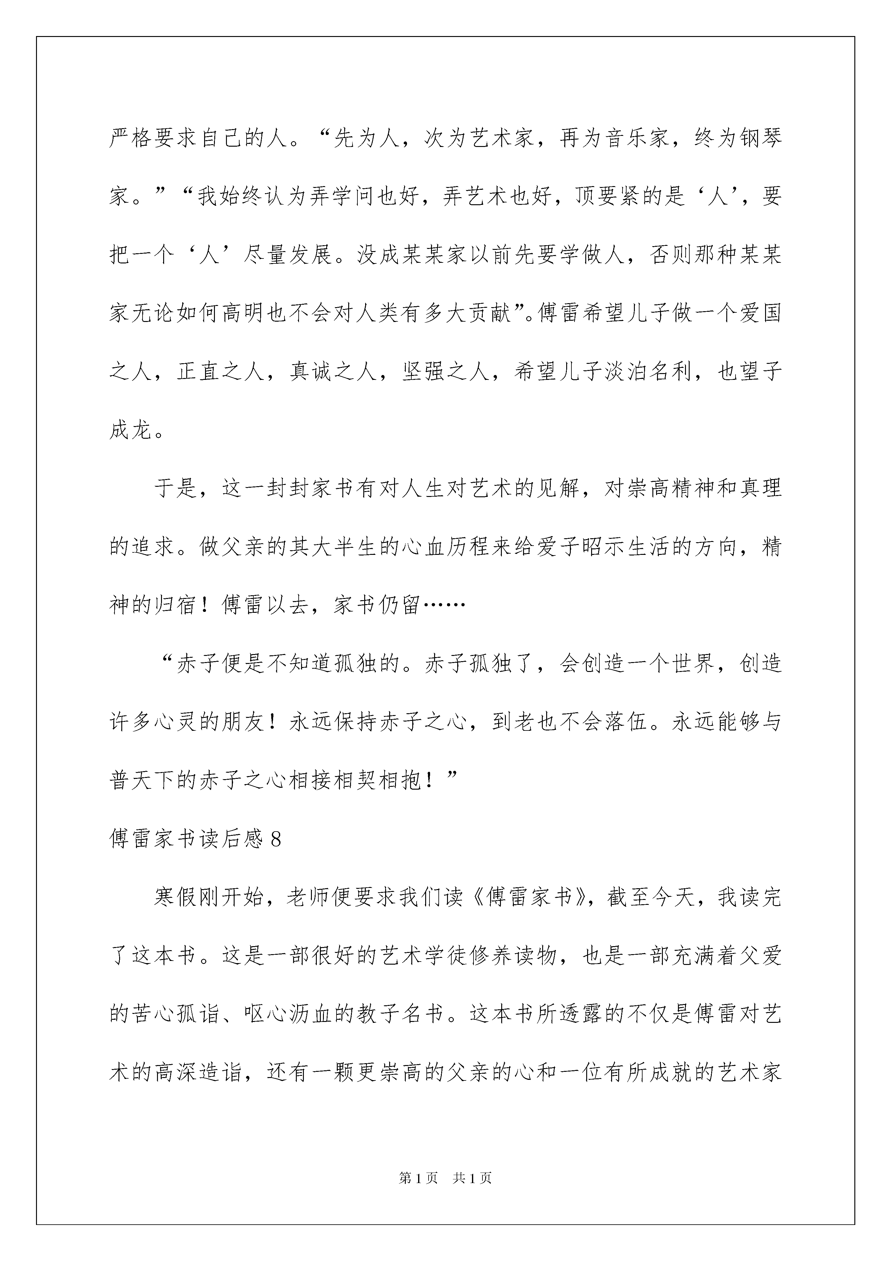 傅雷家书读后感_傅雷家书读后感傅雷家书读后感_傅雷家书读后感1傅雷不愧是好父亲,能以如此的心态和耐心来教育孩子。傅雷究竟是如何有这种力量呢这种伟大的父爱能够说影响了傅聪的一生,为傅聪走向未来做出了铺垫,打下了坚实的基础。因此,傅雷所写的这些书信也就是十分重要的,给傅聪上了一堂人生课,让他知道如何在这个世界上生活。这真是教育子女的一本好书,同时也就应是作子女的了解父母的一本好书。子女能够透过这本书了解自己的父母,父母能够透过这本书了解自己的子女,傅雷在信中所写的每字每句已经成为经典,永垂不朽的经典。傅雷作为