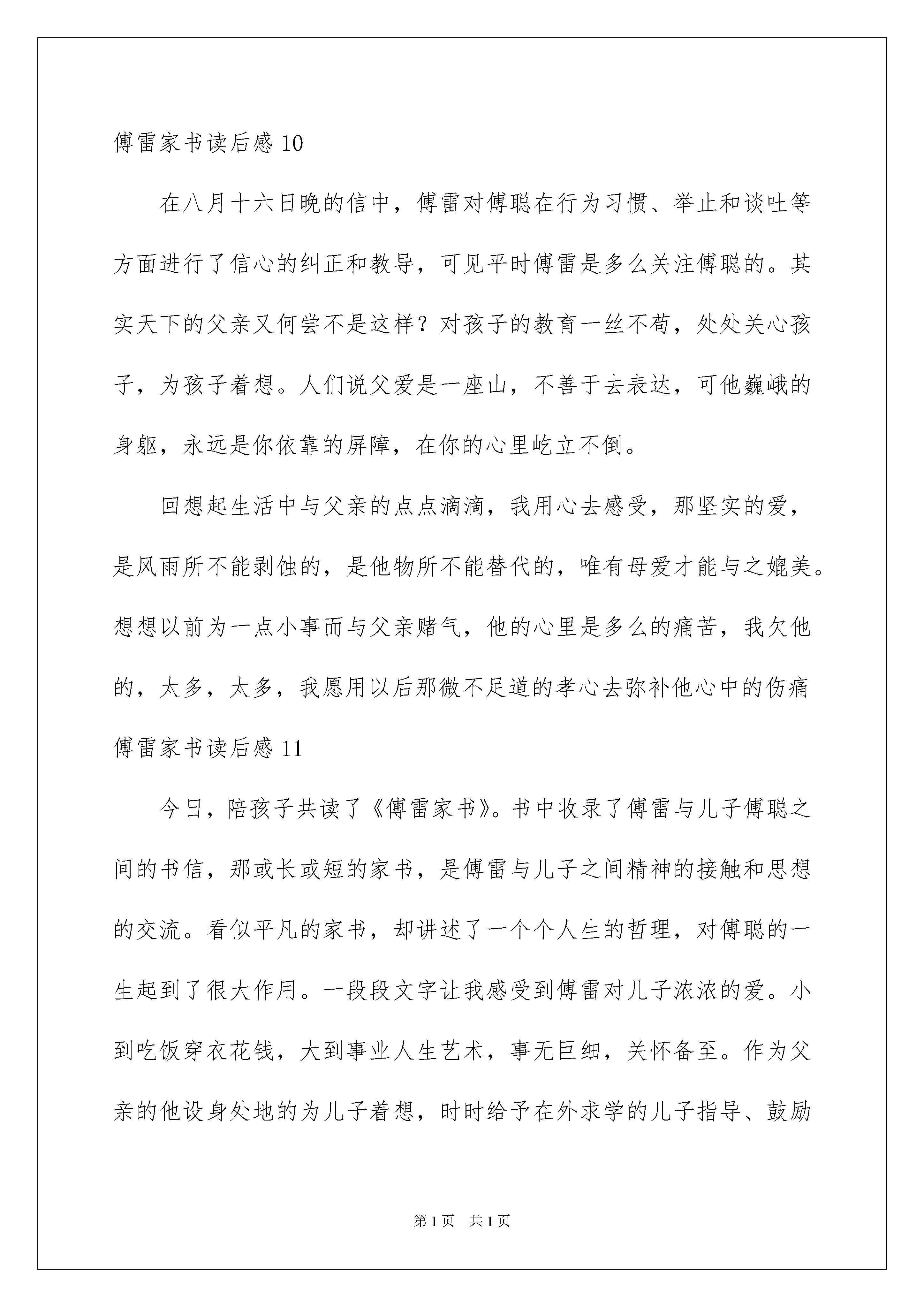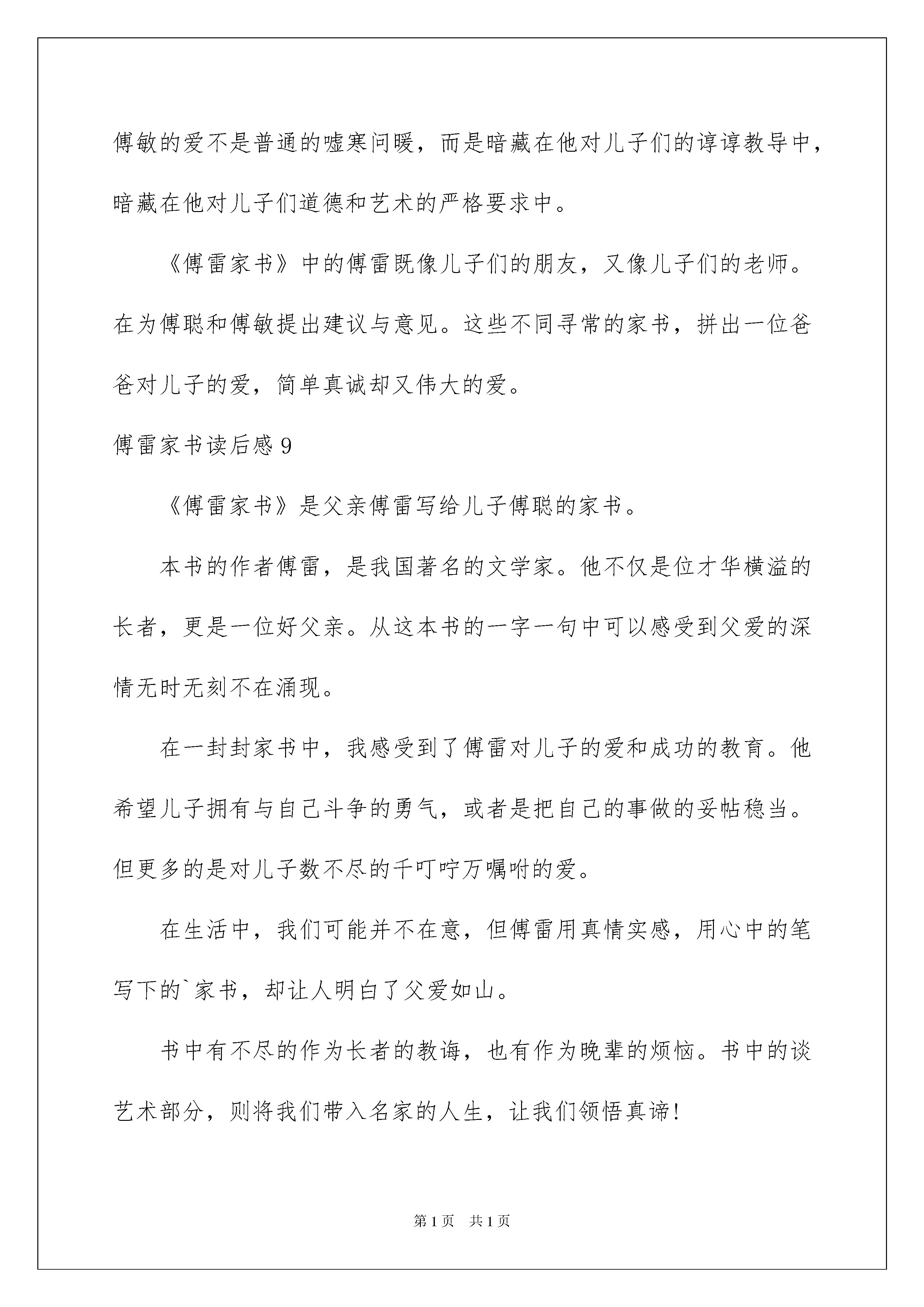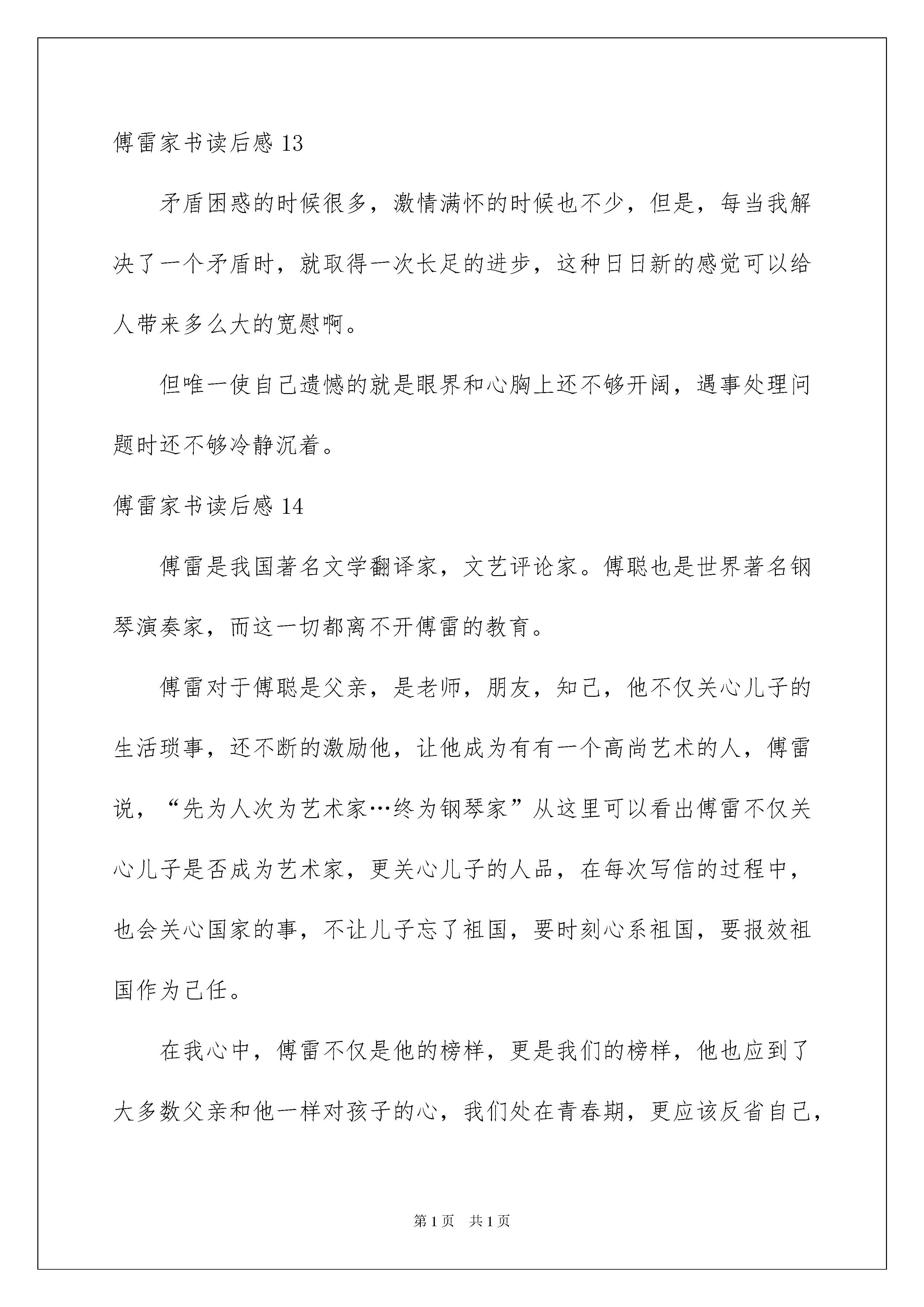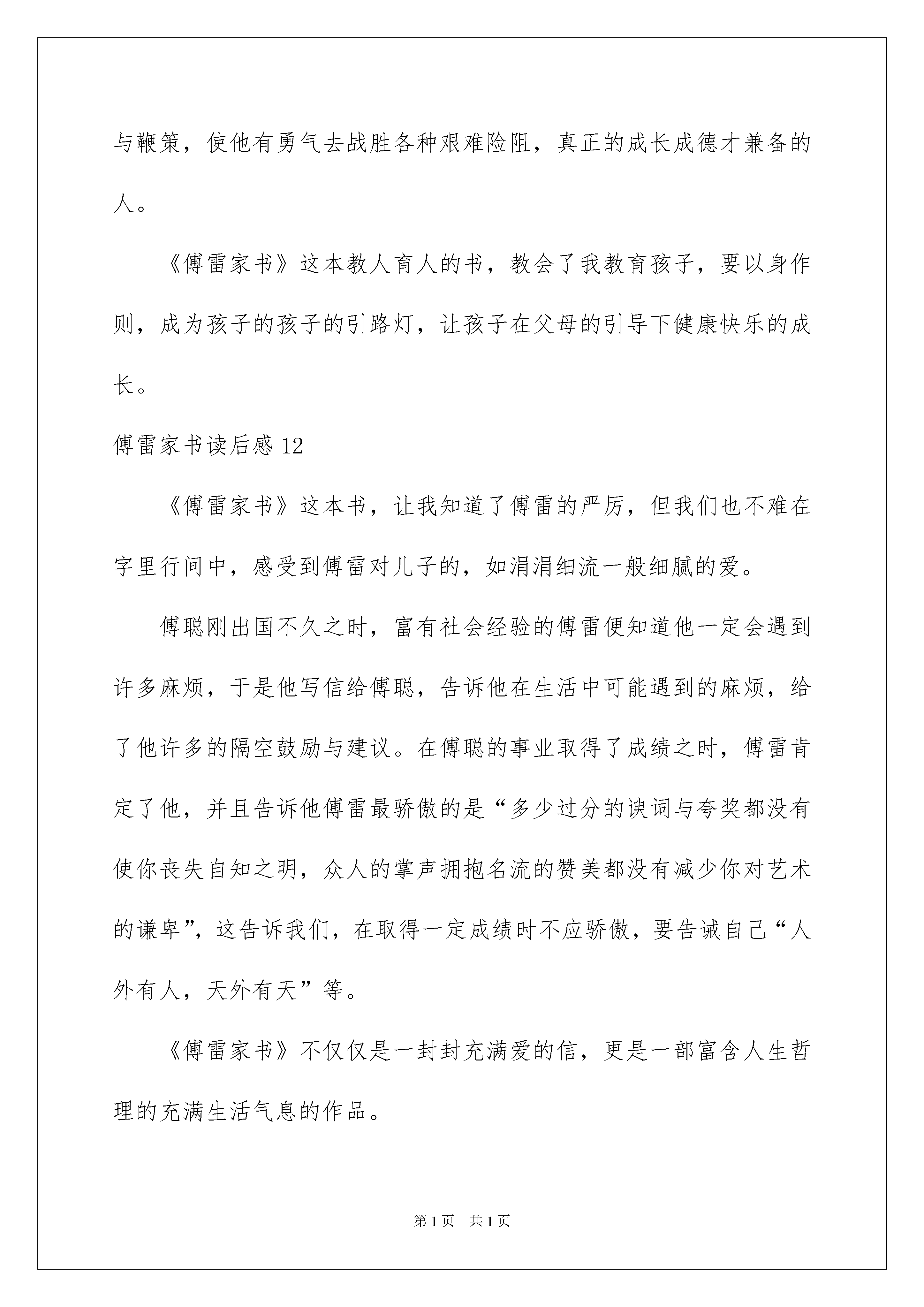 傅雷家书读后感_傅雷家书读后感傅雷家书读后感_傅雷家书读后感1傅雷不愧是好父亲,能以如此的心态和耐心来教育孩子。傅雷究竟是如何有这种力量呢这种伟大的父爱能够说影响了傅聪的一生,为傅聪走向未来做出了铺垫,打下了坚实的基础。因此,傅雷所写的这些书信也就是十分重要的,给傅聪上了一堂人生课,让他知道如何在这个世界上生活。这真是教育子女的一本好书,同时也就应是作子女的了解父母的一本好书。子女能够透过这本书了解自己的父母,父母能够透过这本书了解自己的子女,傅雷在信中所写的每字每句已经成为经典,永垂不朽的经典。傅雷作为