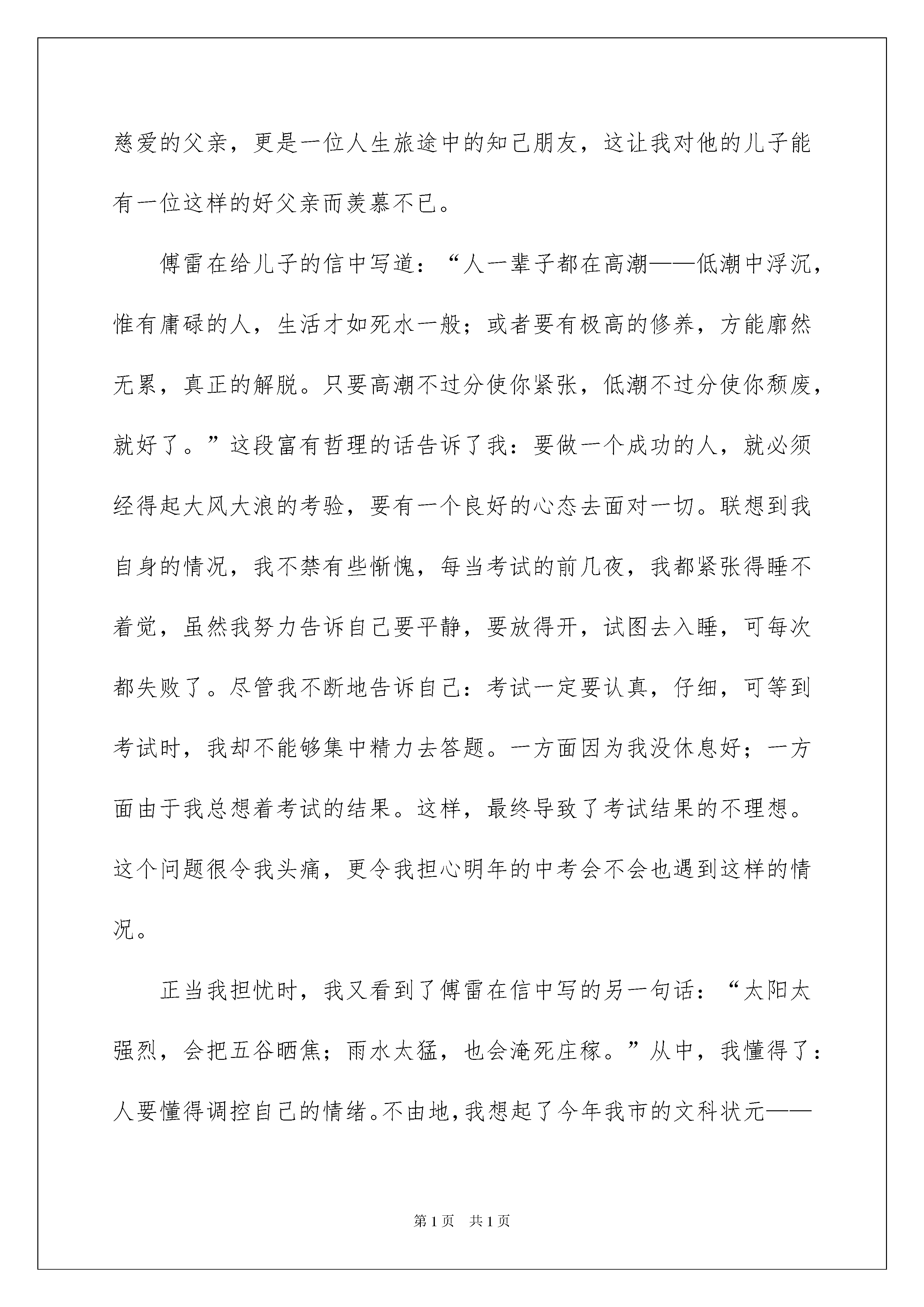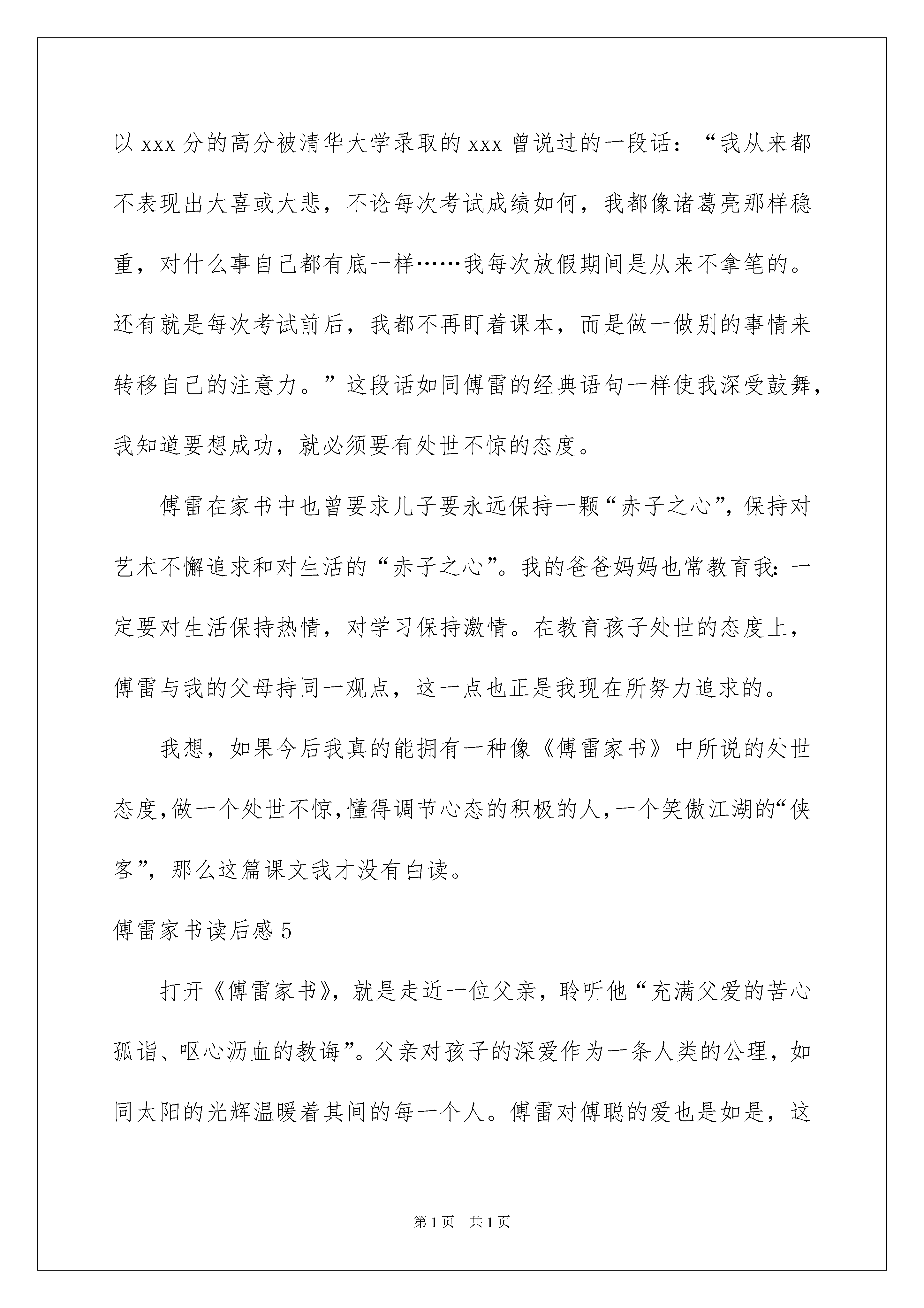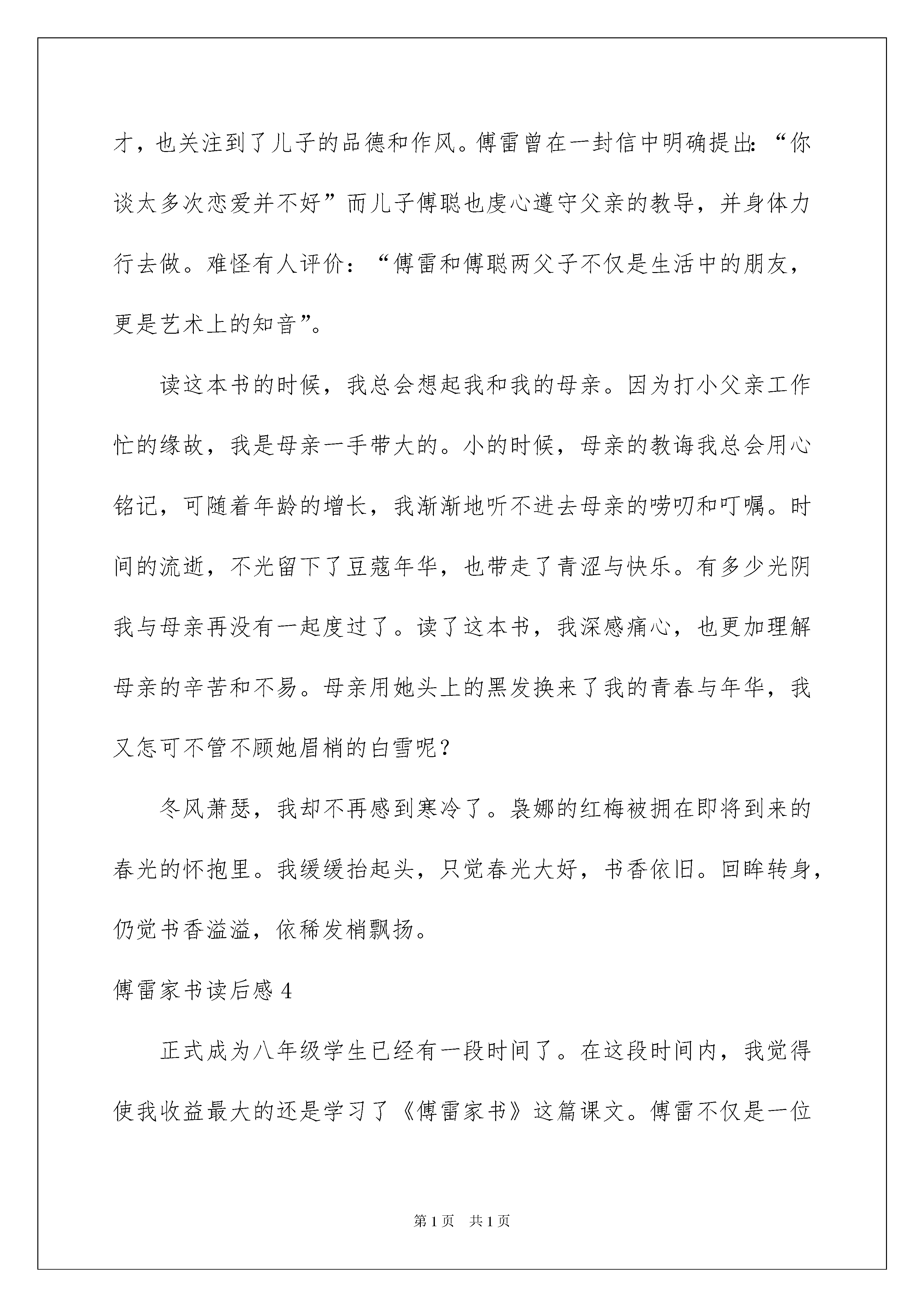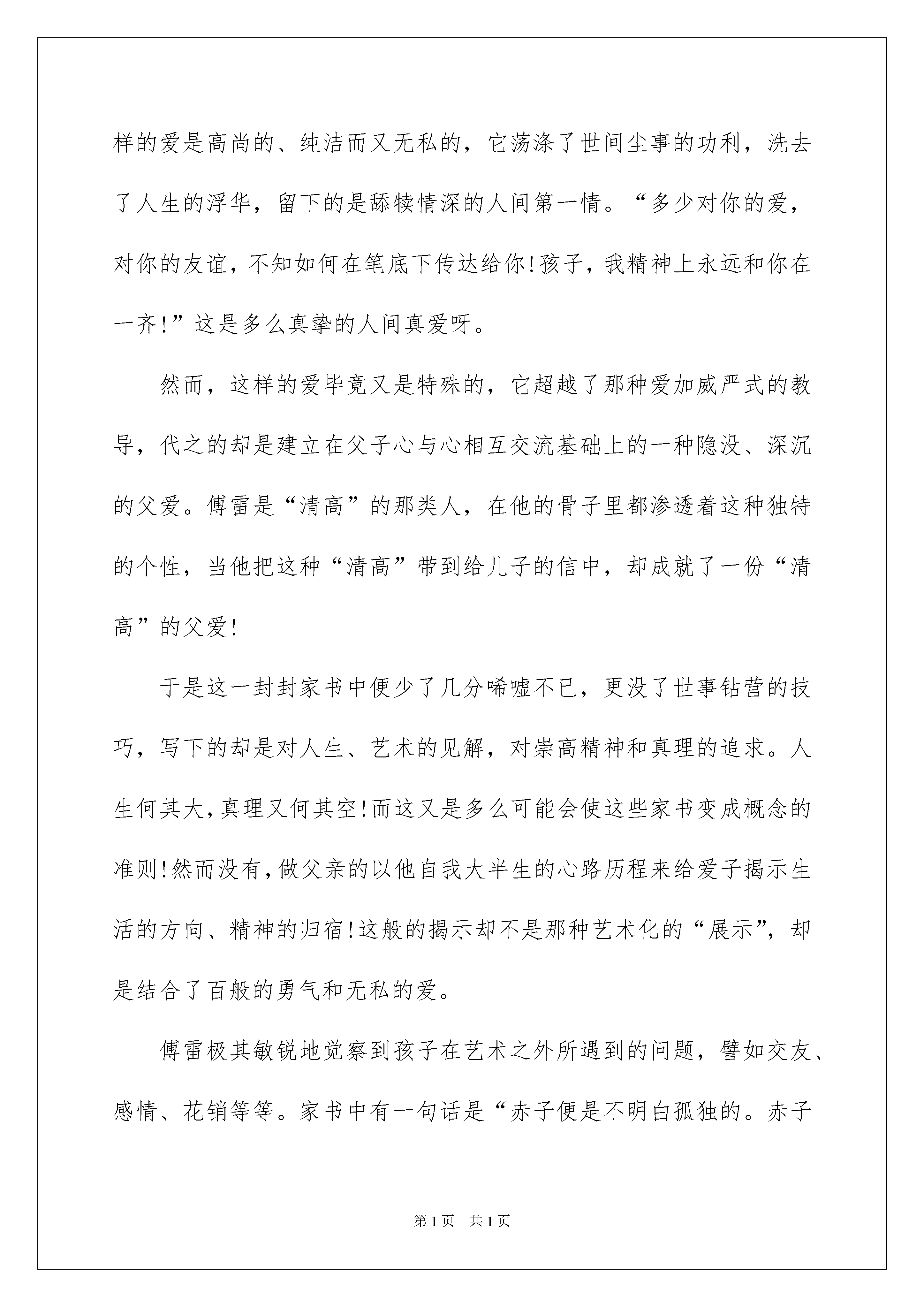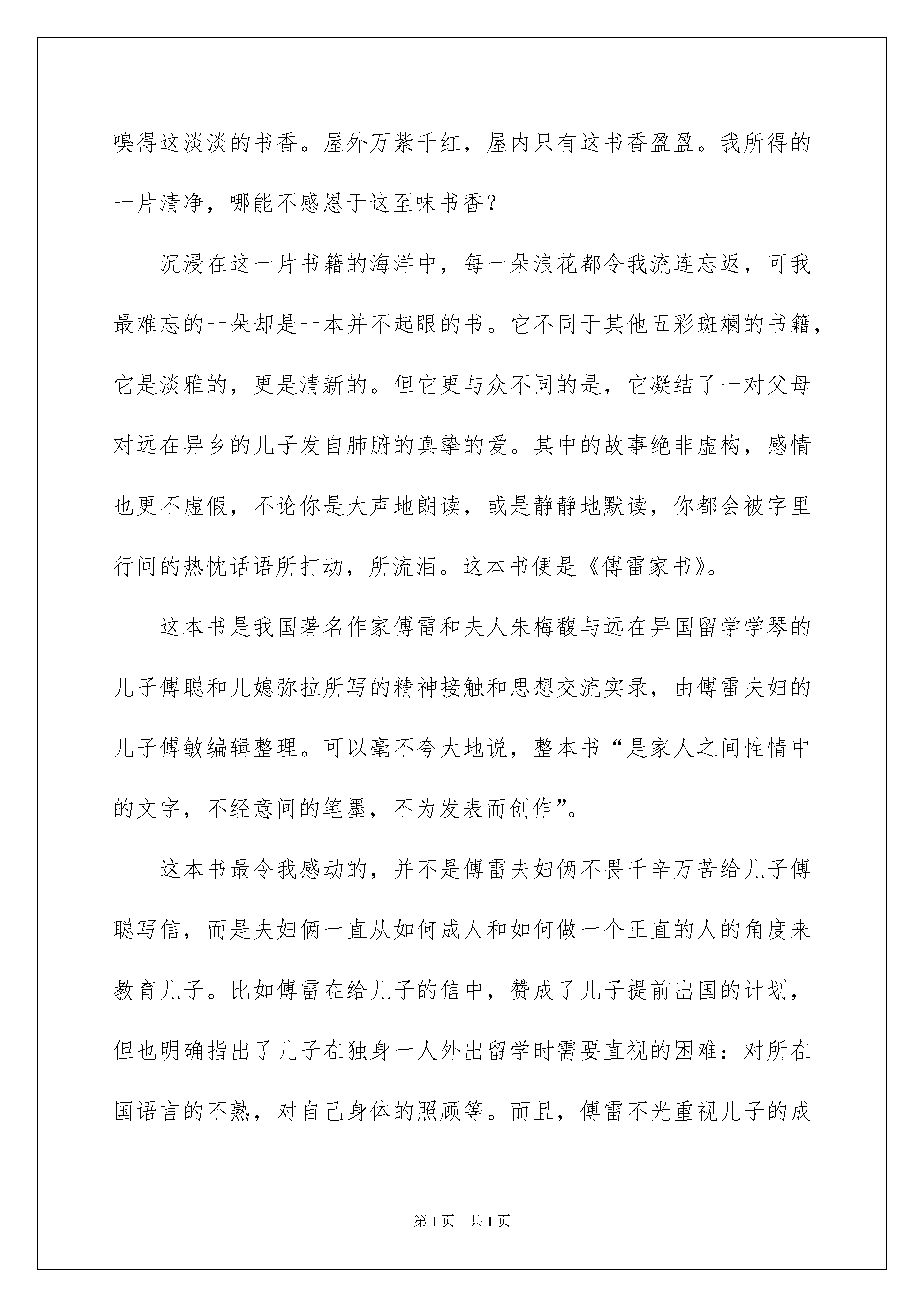 傅雷家书读后感_傅雷家书读后感傅雷家书读后感_傅雷家书读后感1傅雷不愧是好父亲,能以如此的心态和耐心来教育孩子。傅雷究竟是如何有这种力量呢这种伟大的父爱能够说影响了傅聪的一生,为傅聪走向未来做出了铺垫,打下了坚实的基础。因此,傅雷所写的这些书信也就是十分重要的,给傅聪上了一堂人生课,让他知道如何在这个世界上生活。这真是教育子女的一本好书,同时也就应是作子女的了解父母的一本好书。子女能够透过这本书了解自己的父母,父母能够透过这本书了解自己的子女,傅雷在信中所写的每字每句已经成为经典,永垂不朽的经典。傅雷作为