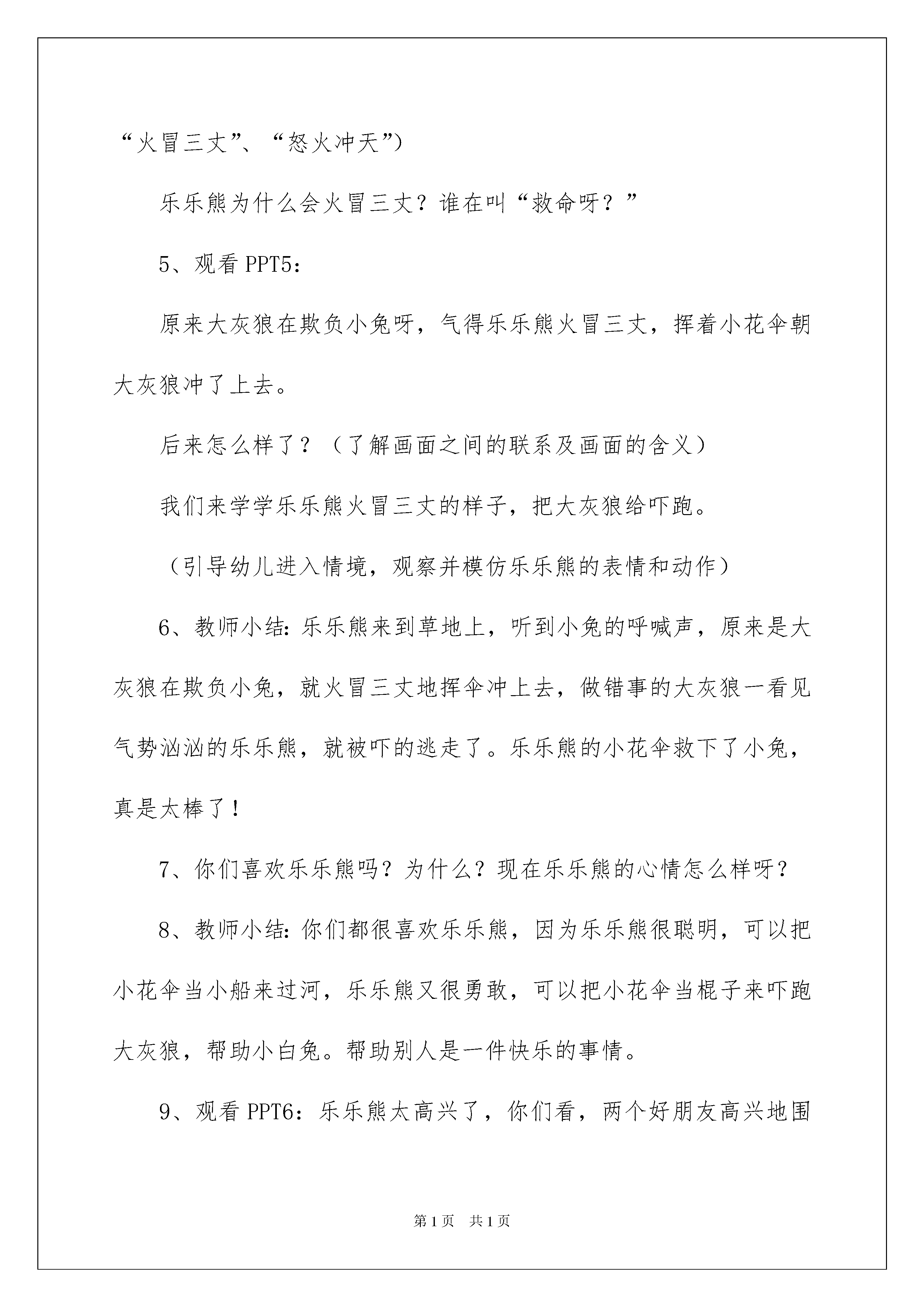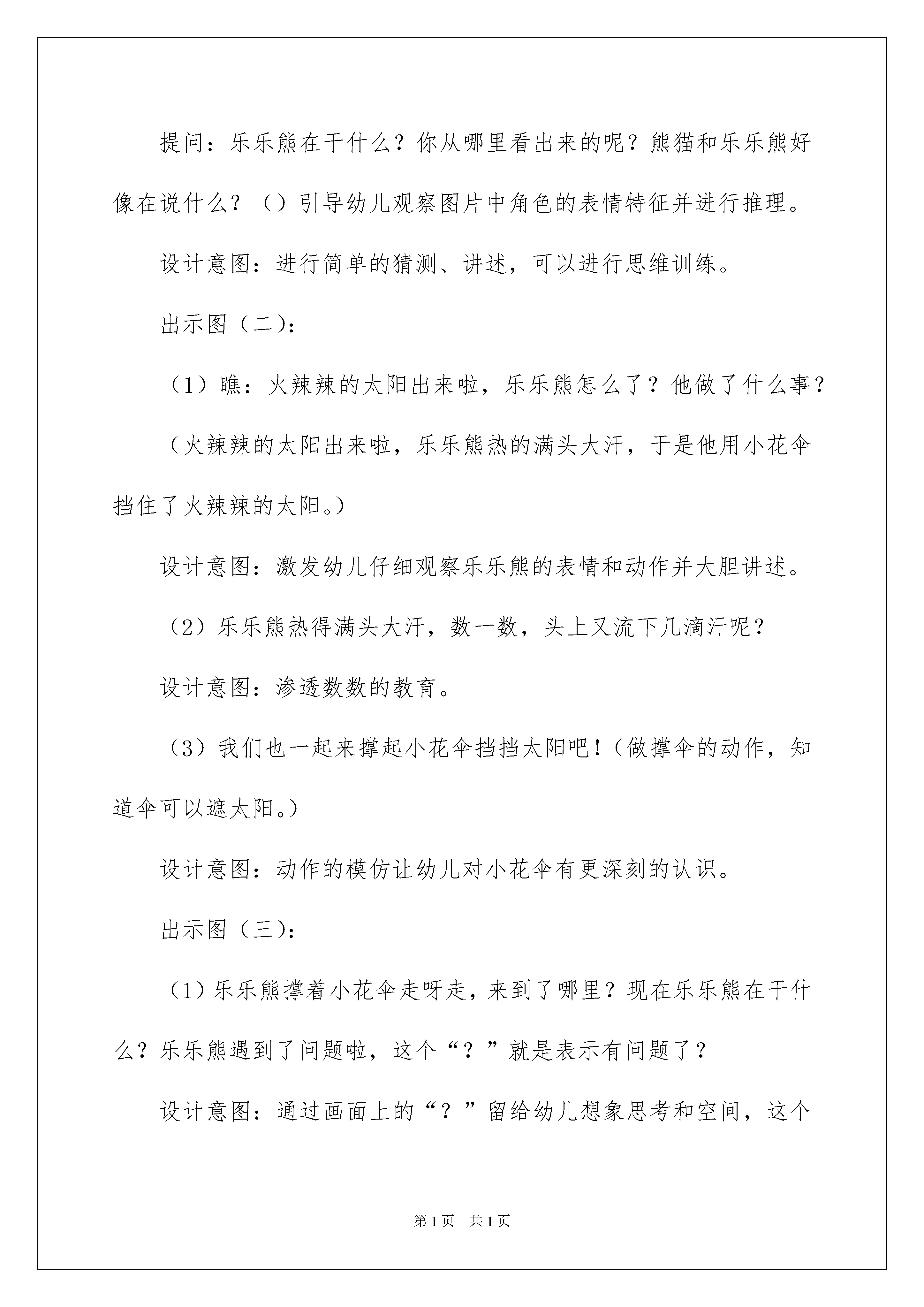 小班语言《乐乐熊》教案作为一位不辞辛劳的人民教师,通常需要用到教案来辅助教学,借助教案可以提高教学质量,收到预期的教学效果。我们该怎么去写教案呢?下面是小编精心整理的小班语言《乐乐熊》教案,希望对大家有所帮助。小班语言《乐乐熊》教案1设计思路:小班孩子自我中心、依赖性较强,遇到一点问题就会哭。绘本中的乐乐熊具有一定的教育价值,它聪明、可爱、勇敢,爱于助人,是孩子们学习的一个典范。这个绘本中的故事生动有趣,人物形象逼真,情节跌宕起伏,能激起小班孩子的阅读兴趣。小班班孩子在日常生活中喜欢听故事,喜欢模仿故事中