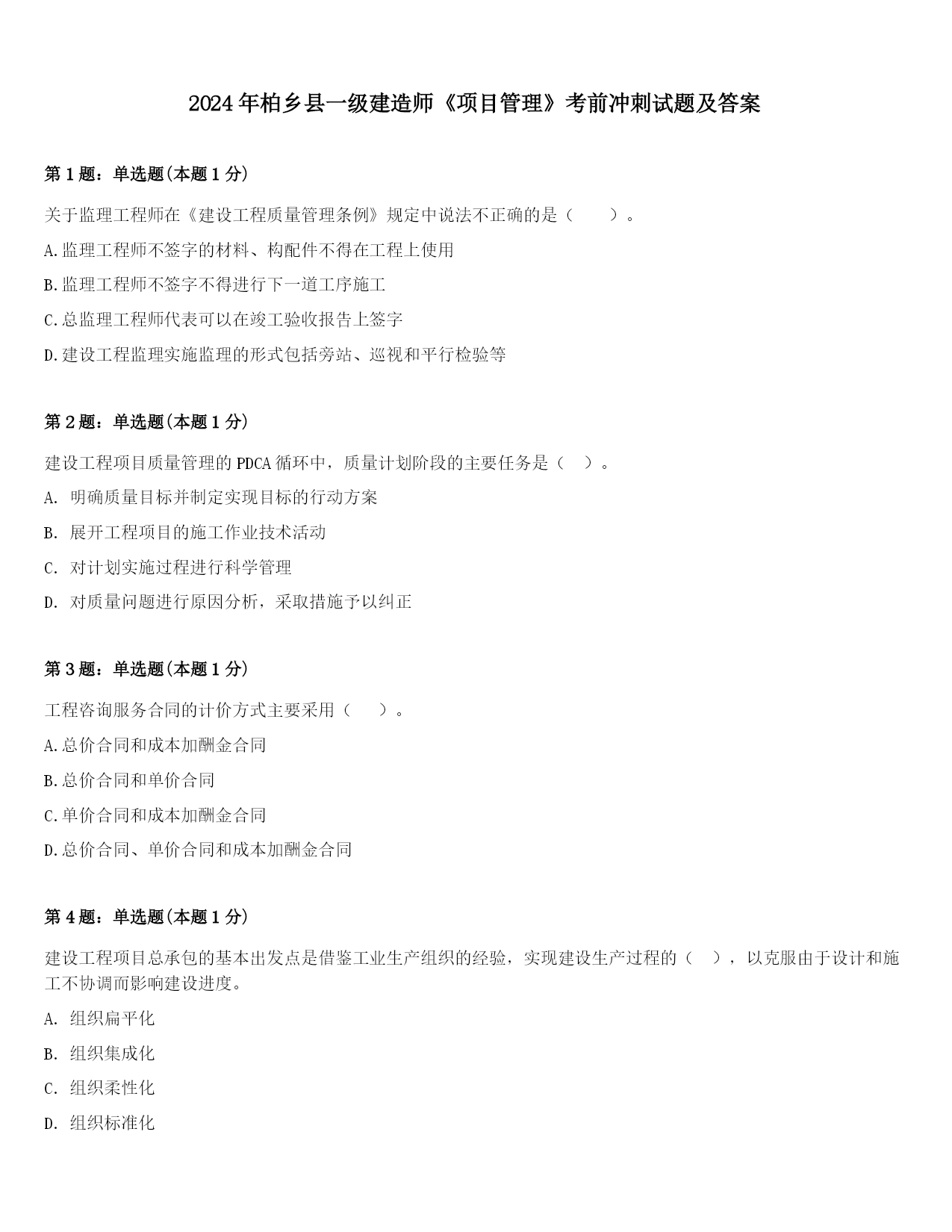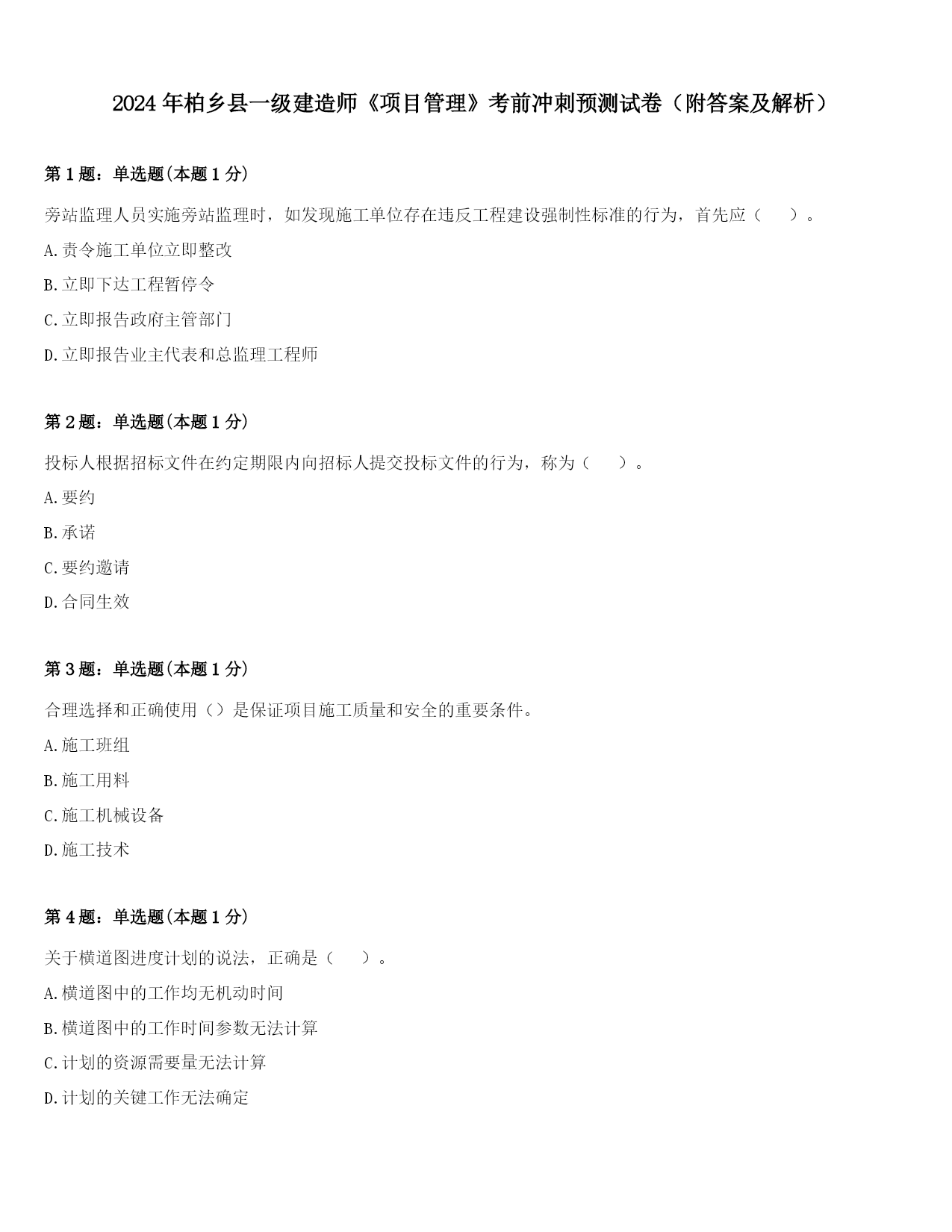 2024年柏乡县一级建造师《项目管理》考前冲刺试题及答案.docx