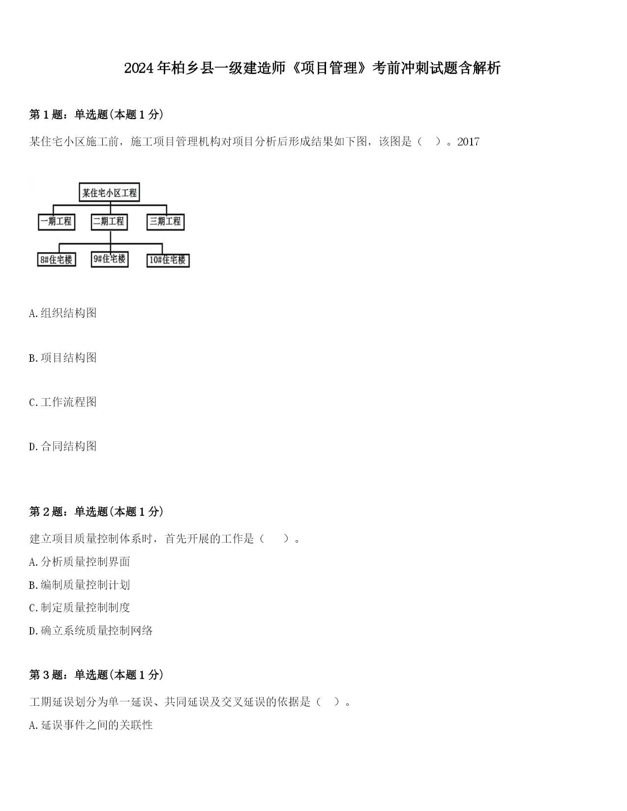 2024年柏乡县一级建造师《项目管理》考前冲刺试题含解析第1题:单选题(本题1分)某住宅小区施工前,施工项目管理机构对项目分析后形成结果如下图,该图是()。2017A.组织结构图B.项目结构图C.工作流程图D.合同结构图第2题:单选题(本题1分)建立项目质量控制体系时,首先开展的工作是()。A.分析质量控制界面B.编制质量控制计划C.制定质量控制制度D.确立系统质量控制网络第3题:单选题(本题1分)工期延误划分为单一延误、共同延误及交叉延误的依据是()。A.延误事件之间的关联性B.延误的原因C.索赔要求和