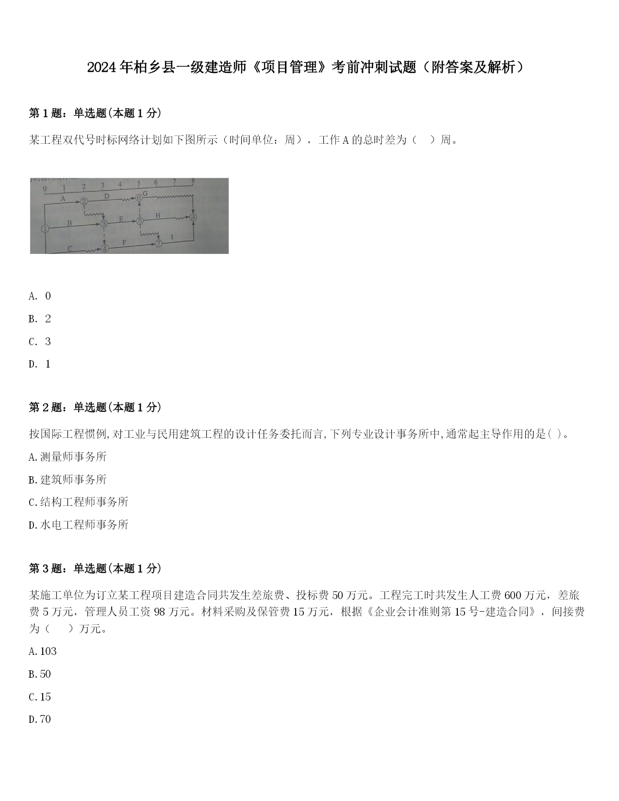 2024年柏乡县一级建造师《项目管理》考前冲刺试题(附答案及解析)第1题:单选题(本题1分)某工程双代号时标网络计划如下图所示(时间单位:周),工作A的总时差为()周。A.0B.2C.3D.1第2题:单选题(本题1分)按国际工程惯例,对工业与民用建筑工程的设计任务委托而言,下列专业设计事务所中,通常起主导作用的是()。A.测量师事务所B.建筑师事务所C.结构工程师事务所D.水电工程师事务所第3题:单选题(本题1分)某施工单位为订立某工程项目建造合同共发生差旅费、投标费50万元。工程完工时共发生人工费600