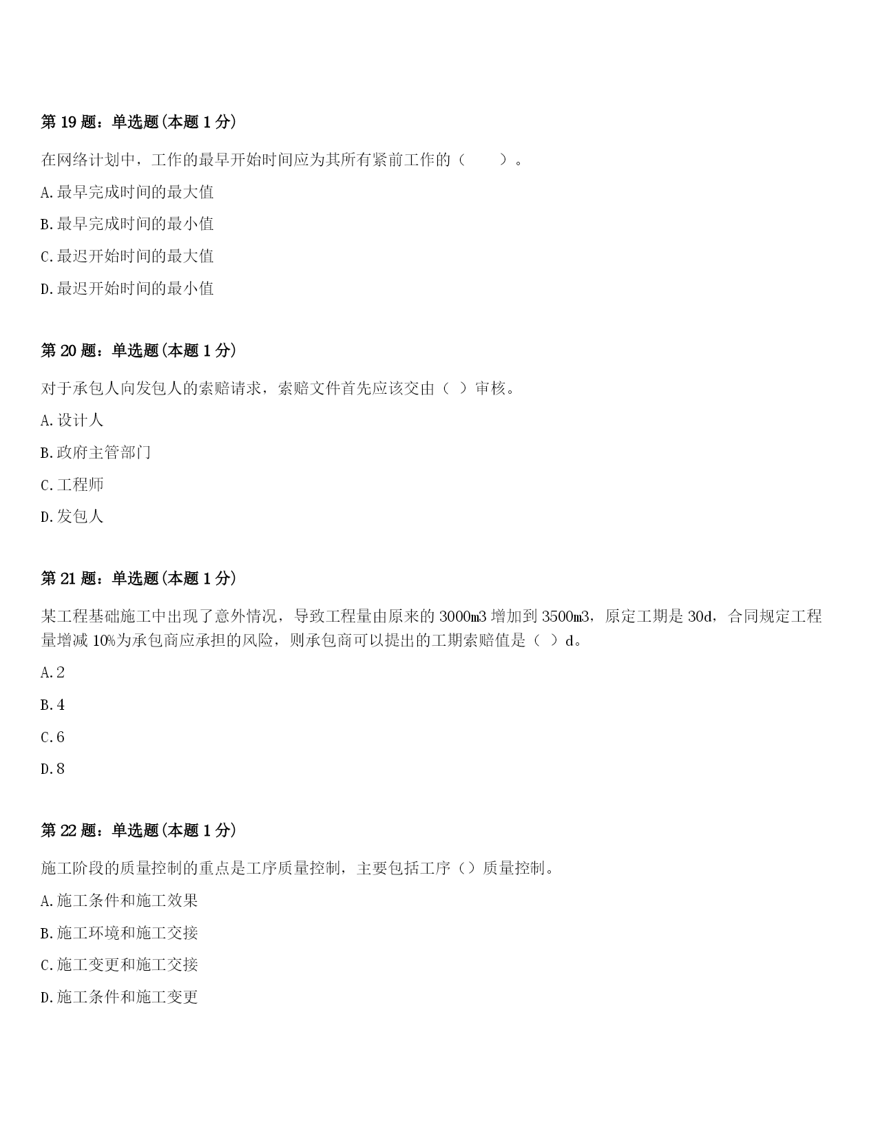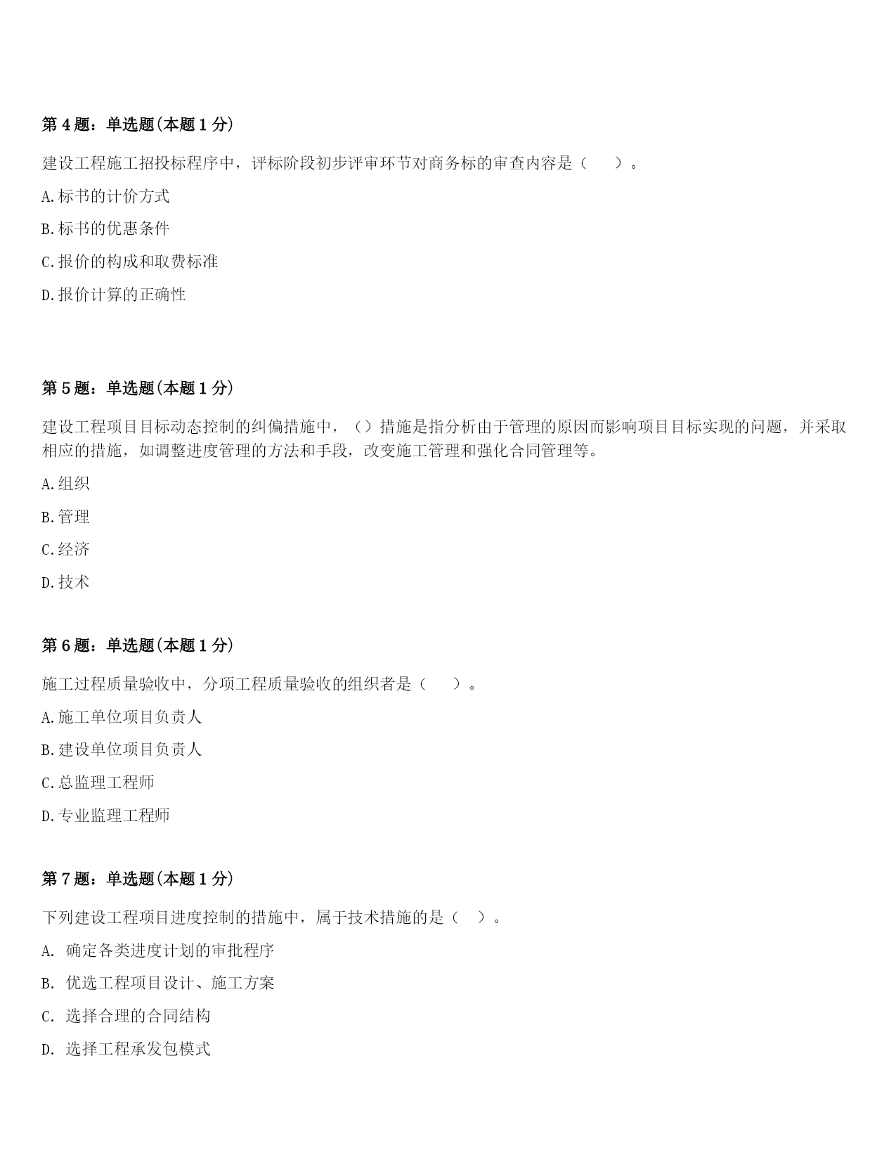 2024年柏乡县一级建造师《项目管理》考前冲刺试题及答案第1题:单选题(本题1分)关于监理工程师在《建设工程质量管理条例》规定中说法不正确的是()。A.监理工程师不签字的材料、构配件不得在工程上使用B.监理工程师不签字不得进行下一道工序施工C.总监理工程师代表可以在竣工验收报告上签字D.建设工程监理实施监理的形式包括旁站、巡视和平行检验等第2题:单选题(本题1分)建设工程项目质量管理的PDCA循环中,质量计划阶段的主要任务是()。A.明确质量目标并制定实现目标的行动方案B.展开工程项目的施工作业技术活动C