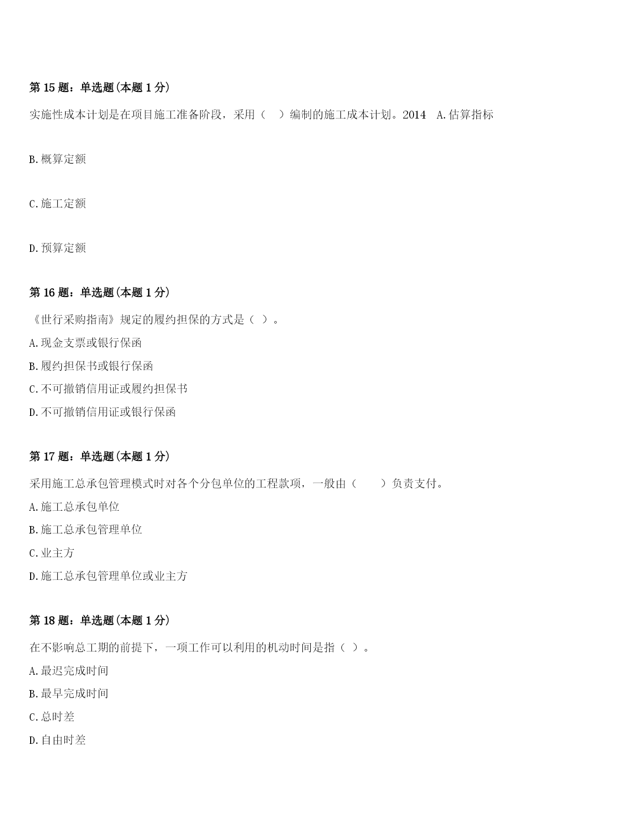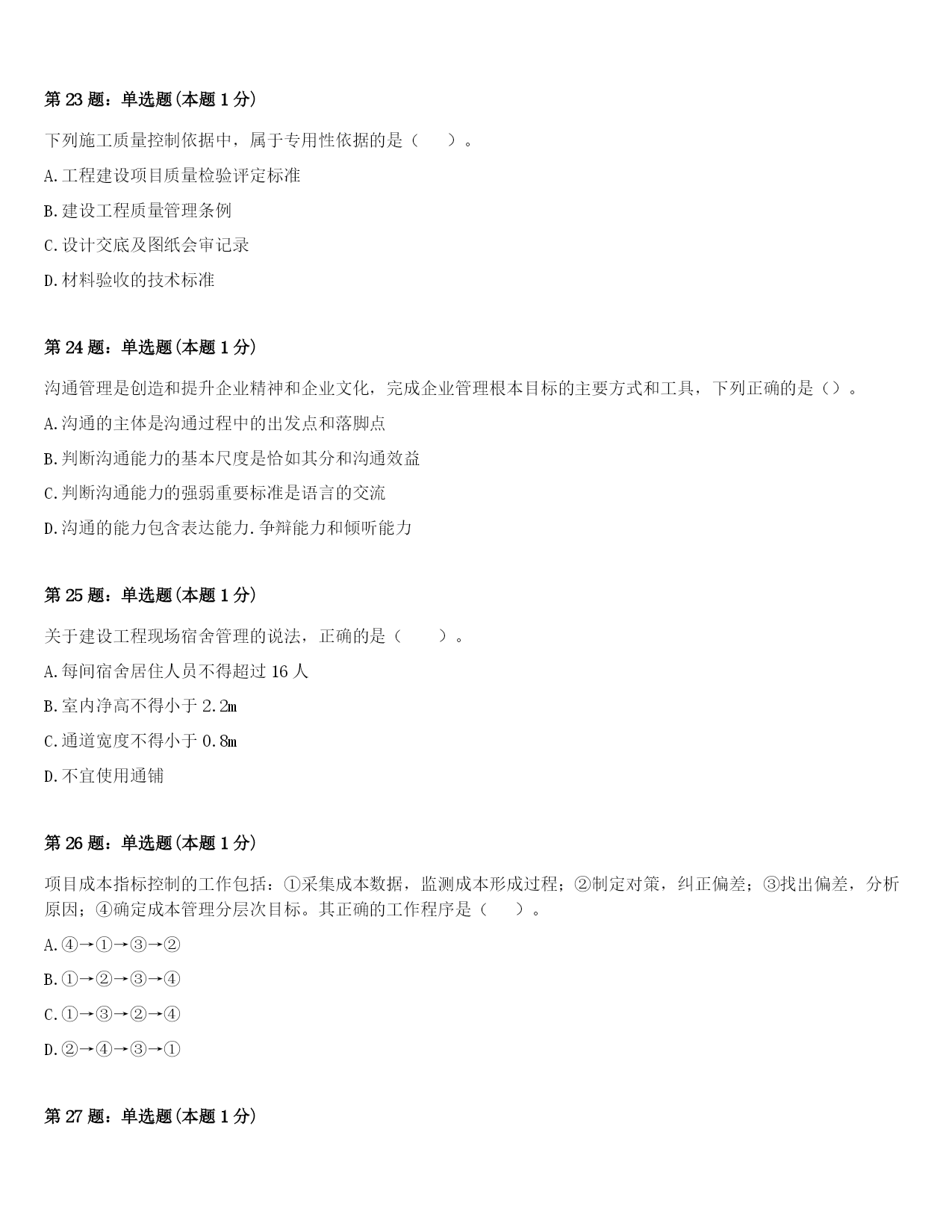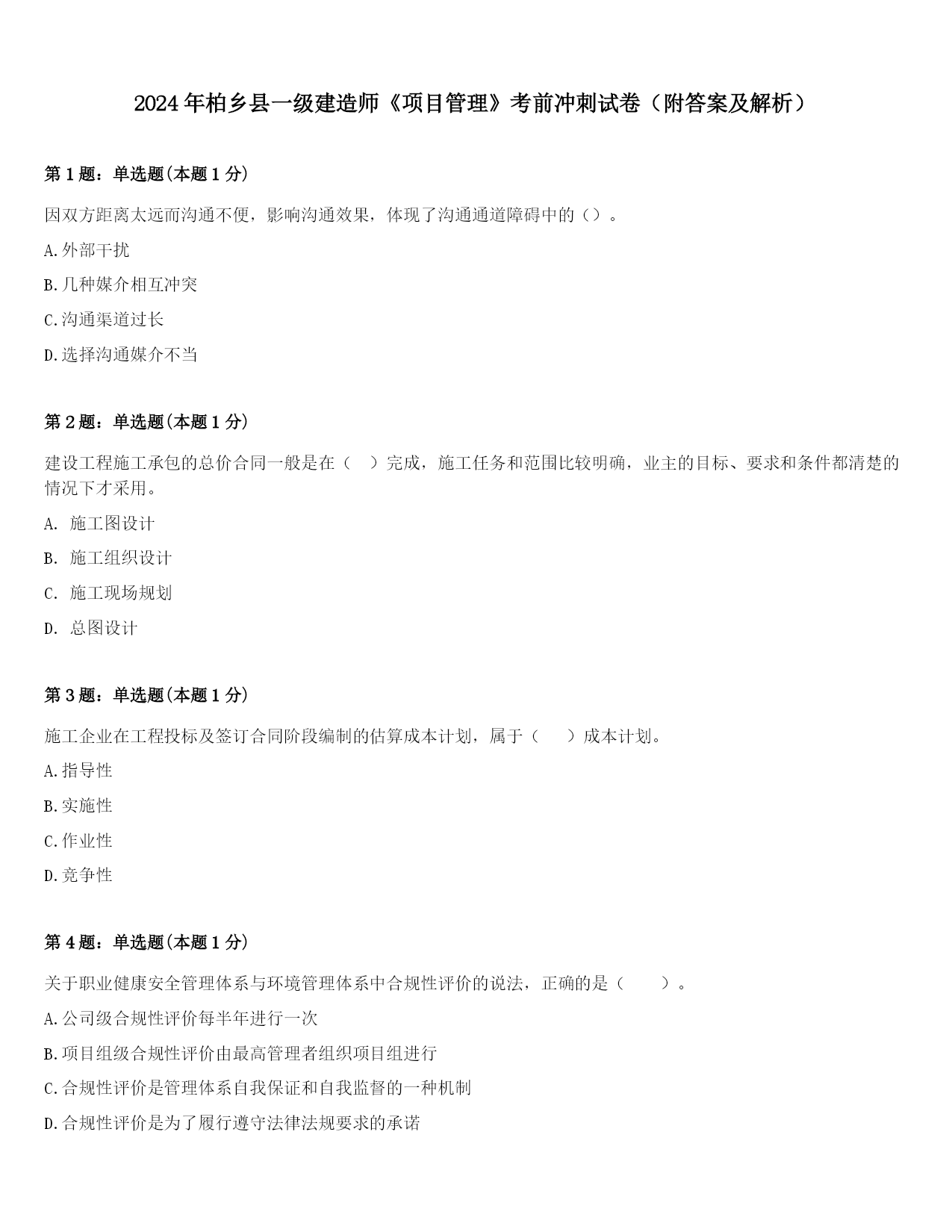 2024年柏乡县一级建造师《项目管理》考前冲刺试卷(附答案及解析)第1题:单选题(本题1分)因双方距离太远而沟通不便,影响沟通效果,体现了沟通通道障碍中的()。A.外部干扰B.几种媒介相互冲突C.沟通渠道过长D.选择沟通媒介不当第2题:单选题(本题1分)建设工程施工承包的总价合同一般是在()完成,施工任务和范围比较明确,业主的目标、要求和条件都清楚的情况下才采用。A.施工图设计B.施工组织设计C.施工现场规划D.总图设计第3题:单选题(本题1分)施工企业在工程投标及签订合同阶段编制的估算成本计划,属于()