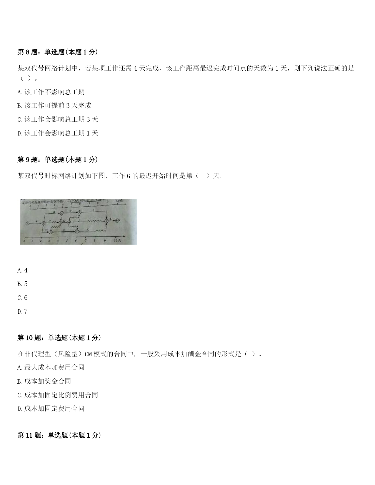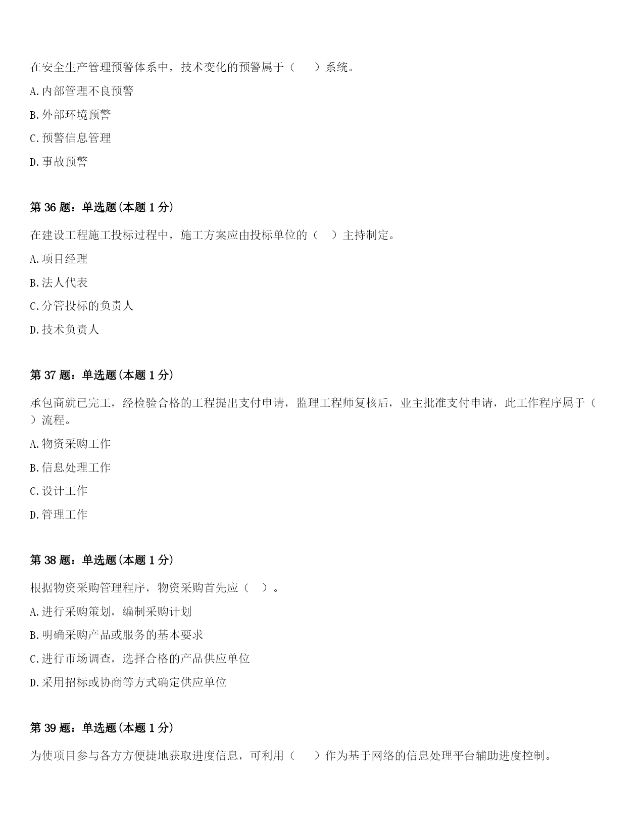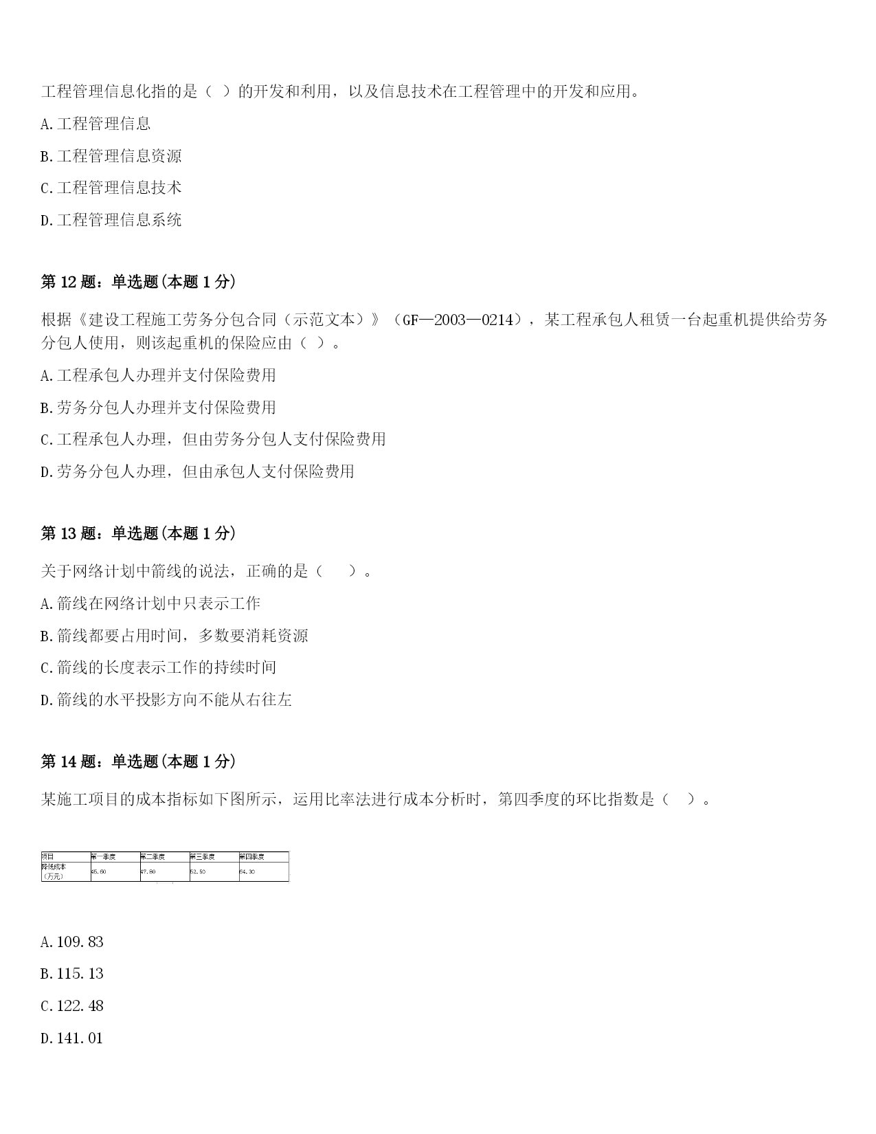 2024年柏乡县一级建造师《项目管理》考前冲刺试卷(附答案及解析)第1题:单选题(本题1分)因双方距离太远而沟通不便,影响沟通效果,体现了沟通通道障碍中的()。A.外部干扰B.几种媒介相互冲突C.沟通渠道过长D.选择沟通媒介不当第2题:单选题(本题1分)建设工程施工承包的总价合同一般是在()完成,施工任务和范围比较明确,业主的目标、要求和条件都清楚的情况下才采用。A.施工图设计B.施工组织设计C.施工现场规划D.总图设计第3题:单选题(本题1分)施工企业在工程投标及签订合同阶段编制的估算成本计划,属于()