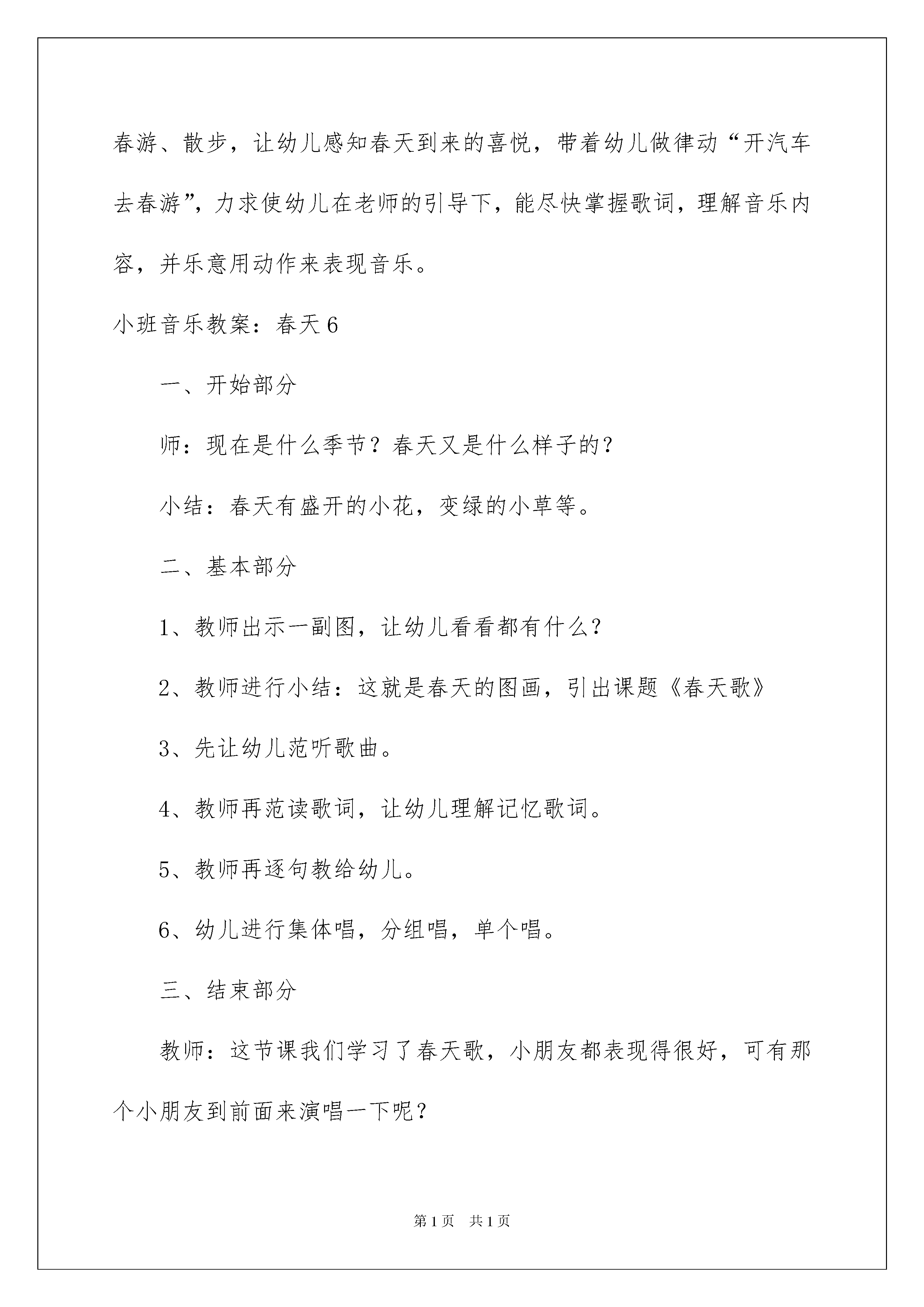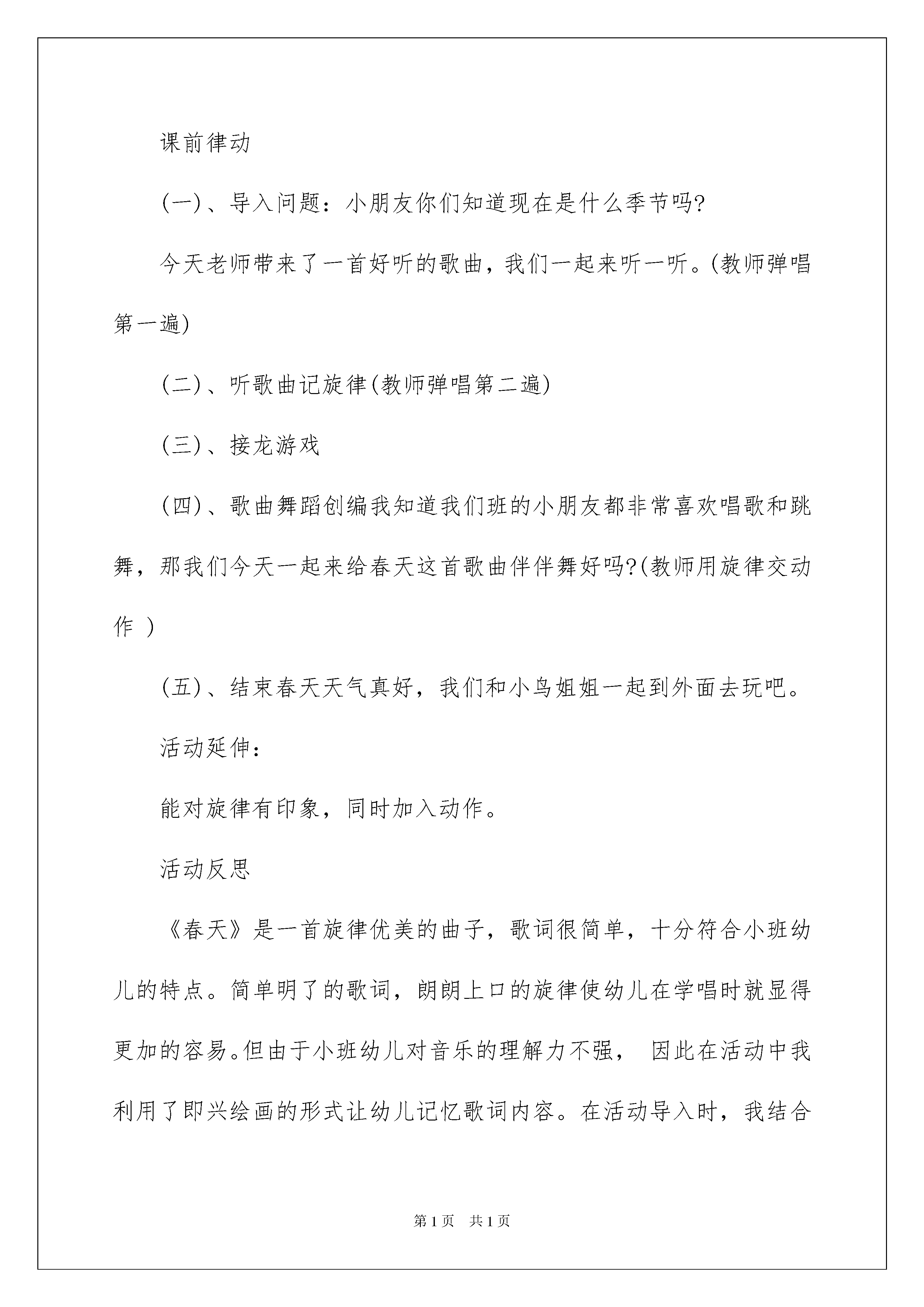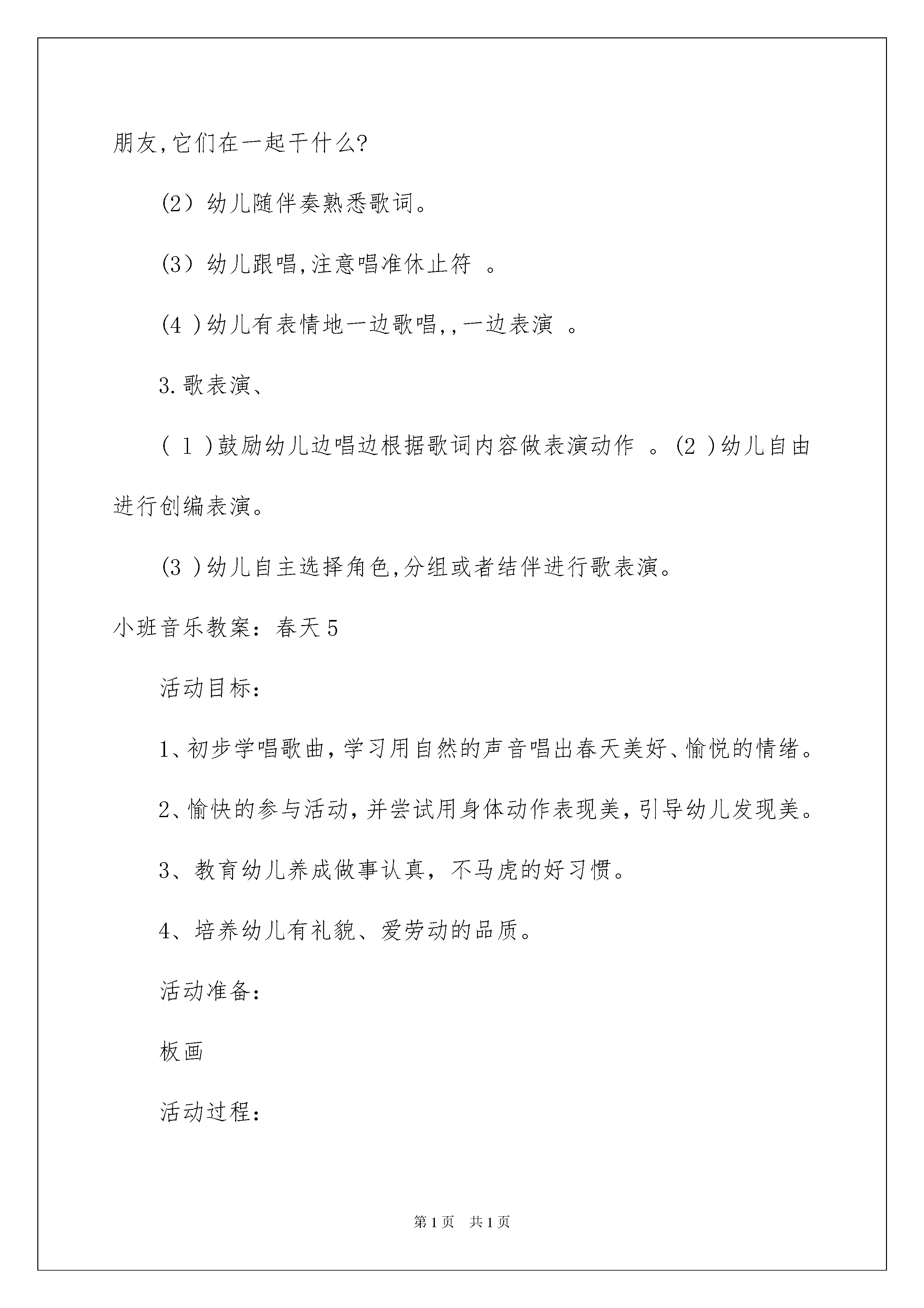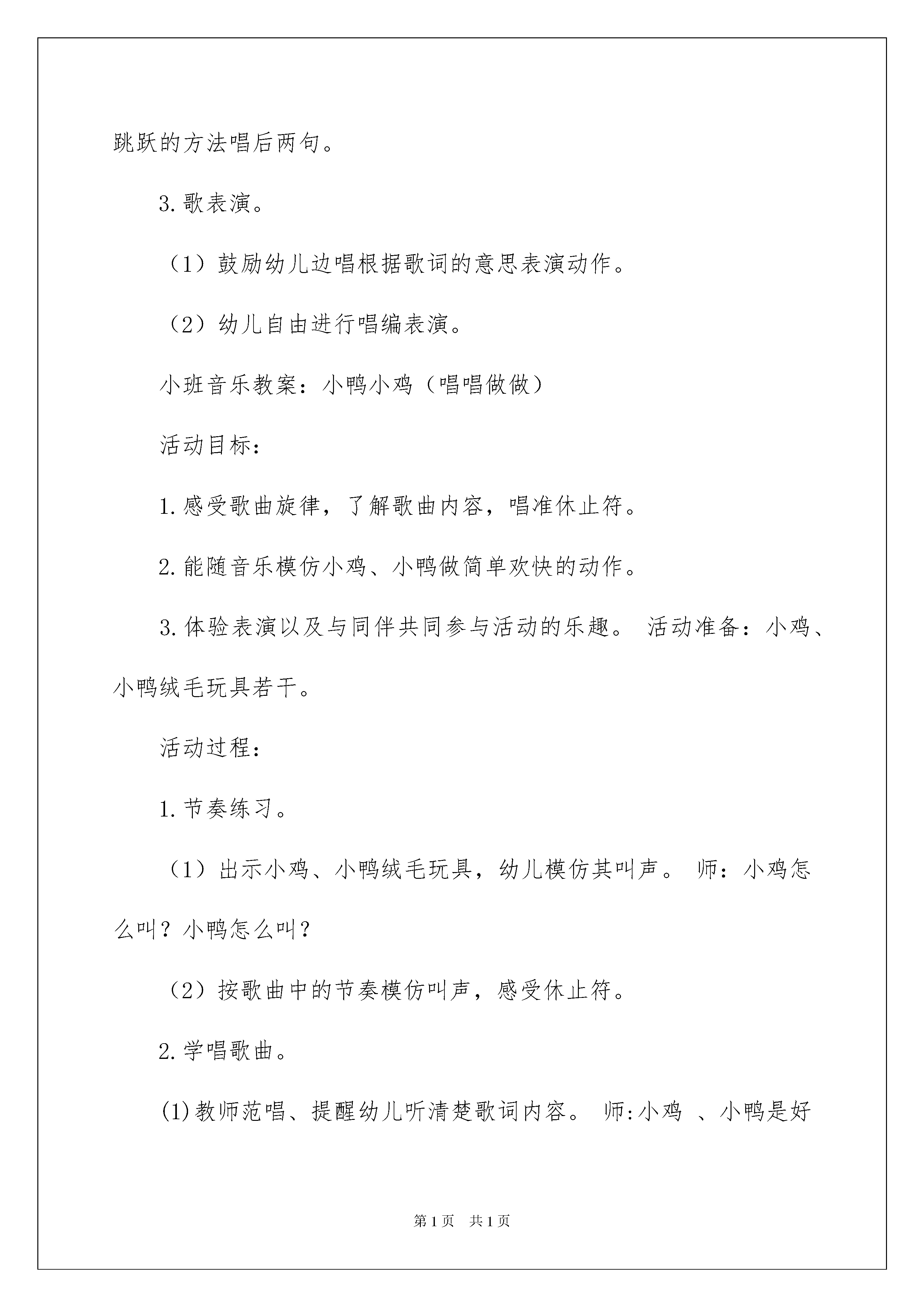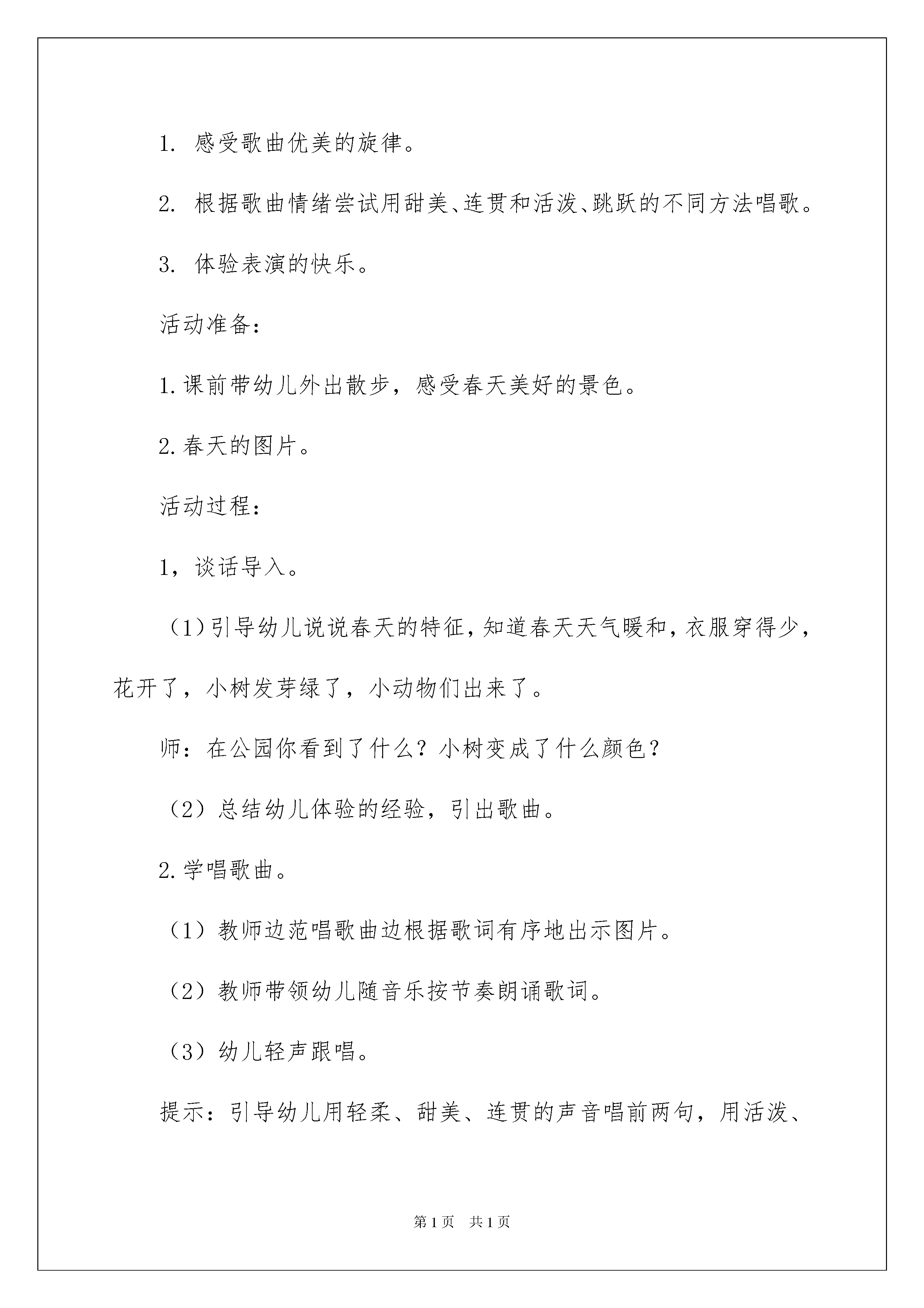 2022小班音乐教案:春天小班音乐教案:春天在教学工作者实际的教学活动中,时常要开展教案准备工作,教案是教学活动的依据,有着重要的地位。怎样写教案才更能起到其作用呢?下面是我为大家整理的小班音乐教案:春天,希望能够帮助到大家。小班音乐教案:春天1(听听动动)1、师:春天有那么多美丽的景色,今天,老师想和同学们一起在音乐中走到美丽的郊外,去感受一下春天的气息。(播放钢琴曲《郊外去》,师生随音乐做走、跑、跳的动作。)2、分别听赏《郊外去》的快、慢音乐片段,让同学做出相应的动作。3、师:我们来到了美丽的郊外,到处是树木、花草,漂亮极了!瞧,还有几之小野蜂在花丛中飞来飞去。我们一起来听听小野蜂的音乐……(播放小提琴曲《野蜂飞舞》,师生随音乐做野蜂飞舞的律动。)4、师:你听到这段《野蜂飞舞》的音乐,能想象到野蜂在做什么吗?(同学自由发言)5、“听听比比”——师:你们知道《野蜂飞舞》是用什么乐器演奏的吗?生:小提琴。(出示小提琴图)师:《郊外去》是用什么乐器的演奏的?生:钢琴。(出示钢琴图)(对比听赏两段音乐,边听边模仿钢琴、小提琴的演奏姿势。)同学在“听听动动”的音乐活动中,感受音乐的快慢对比、强弱对比。教师引导同学用动作、律动来表现音乐的情绪及快慢、强弱对比。小班音乐教案:春天2游戏目标:1、让幼儿感受春天的美丽,激发幼儿表演的欲望。2、幼儿扮演歌曲中不同的角色,学会四散表演的方法。3、感受音乐节奏,乐意参与音乐游戏活动,体验游戏的快乐。4、体验自主替换歌词的愉悦情绪。游戏准备:蝴蝶、小兔子头饰教师形象有趣的表演游戏过程:歌表演:春天1-2小节:小碎步,双手自三位向身体两侧落下。3-4小节:小碎步往左右移动两手做小花状经上举落下,半蹲。5-6小节:小碎步,双手在身前上下撩动。7-8小节:左右移动重心,手臂上举左右摆动。1-2小节:做蝴蝶飞,一拍一次。3-4小节:做蜜蜂飞。5-8小节:做小兔跳。教学反思:在这次教学活动中,难点在角色表演中解决了,又利用图谱教学让幼儿轻松的记住了歌词和二分音符,因为幼儿在教学活动中目标达到了所以幼儿能在活动中始终保持愉悦的情绪,饱满的精神和歌唱的兴趣,透过幼儿动听的歌声,准确的节奏,我们一起享受到了音乐赋予生活的情趣,我想这就是艺术活动最大的乐趣。小班音乐教案:春天3活动目标:⒈感受歌曲优美的旋律,在图谱的帮助下初步学唱歌曲。⒉尝试边唱边表演歌曲,体验歌唱活动的乐趣。活动准备:歌曲图谱活动过程:一、熟悉歌曲旋律⒈师:春天天气真好,好多小动物都出来玩了,看有谁呀?⒉出示蝴蝶。师“蝴蝶姑娘飞来了”,提问:蝴蝶姑娘怎么来的?带领幼儿边说歌词边学做蝴蝶在琴声伴奏中飞一飞。⒊出示蜜蜂:谁也来了?蜜蜂是怎么叫的呀?(边说歌词边做动作)⒋出示小白兔:看还有谁呢?(学一学)二、理解歌词,学唱歌曲⒈老师这里有一首好听的歌曲《春天》,唱的就是有关春天的美丽景物,我们一起欣赏一下吧!⒉教师演唱,幼儿欣赏。你们听了这首歌曲有什么感觉?⒊我们再来听一遍,请你仔细的听听歌曲里唱到了哪些春天美丽的景物。⒋你在歌曲中听到了什么?(根据幼儿回答出示相应图谱,重点引导幼儿理解前半部分歌词)⒋原来春天里有这么多美丽的景物,我们一起跟着琴声把这首歌唱出来吧!(在琴声伴奏下学唱歌曲2遍。)三、歌表演《春天》⒈老师看到有的小朋友在演唱时迫不及待的用动作表演,那我们一起来边唱边表演吧!幼儿和教师一起尝试边唱边表演歌曲。⒉第二遍表演。引导幼儿要一边用好听的声音唱出来,一边用用优美的动作表演。小班音乐教案:春天4活动目标:1.感受歌曲优美的旋律。2.根据歌曲情绪尝试用甜美、连贯和活泼、跳跃的不同方法唱歌。3.体验表演的快乐。活动准备:1.课前带幼儿外出散步,感受春天美好的景色。2.春天的图片。活动过程:1,谈话导入。(1)引导幼儿说说春天的特征,知道春天天气暖和,衣服穿得少,花开了,小树发芽绿了,小动物们出来了。师:在公园你看到了什么?小树变成了什么颜色?(2)总结幼儿体验的经验,引出歌曲。2.学唱歌曲。(1)教师边范唱歌曲边根据歌词有序地出示图片。(2)教师带领幼儿随音乐按节奏朗诵歌词。(3)幼儿轻声跟唱。提示:引导幼儿用轻柔、甜美、连贯的声音唱前两句,用活泼、跳跃的方法唱后两句。3.歌表演。(1)鼓励幼儿边唱根据歌词的意思表演动作。(2)幼儿自由进行唱编表演。小班音乐教案:小鸭小鸡(唱唱做做)活动目标:1.感受歌曲旋律,了解歌曲内容,唱准休止符。2.能随音乐模仿小鸡、小鸭做简单欢快的动作。3.体验表演以及与同伴共同参与活动的乐趣。活动准备:小鸡、小鸭绒毛玩具若干。活动过程:1.节奏练习。(1)出
