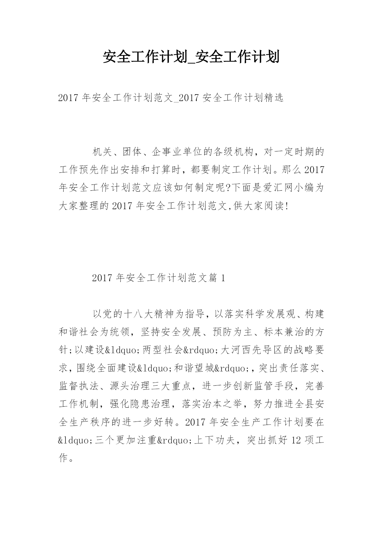 安全工作计划_安全工作计划2017年安全工作计划范文_2017安全工作计划精选机关、团体、企事业单位的各级机构,对一定时期的工作预先作出安排和打算时,都要制定工作计划。那么2017年安全工作计划范文应该如何制定呢?下面是爱汇网小编为大家整理的2017年安全工作计划范文,供大家阅读!2017年安全工作计划范文篇1以党的十八大精神为指导,以落实科学发展观、构建和谐社会为统领,坚持安全发展、预防为主、标本兼治的方针;以建设“两型社会”大河西先导区的战略要求,围绕全面建设“和谐