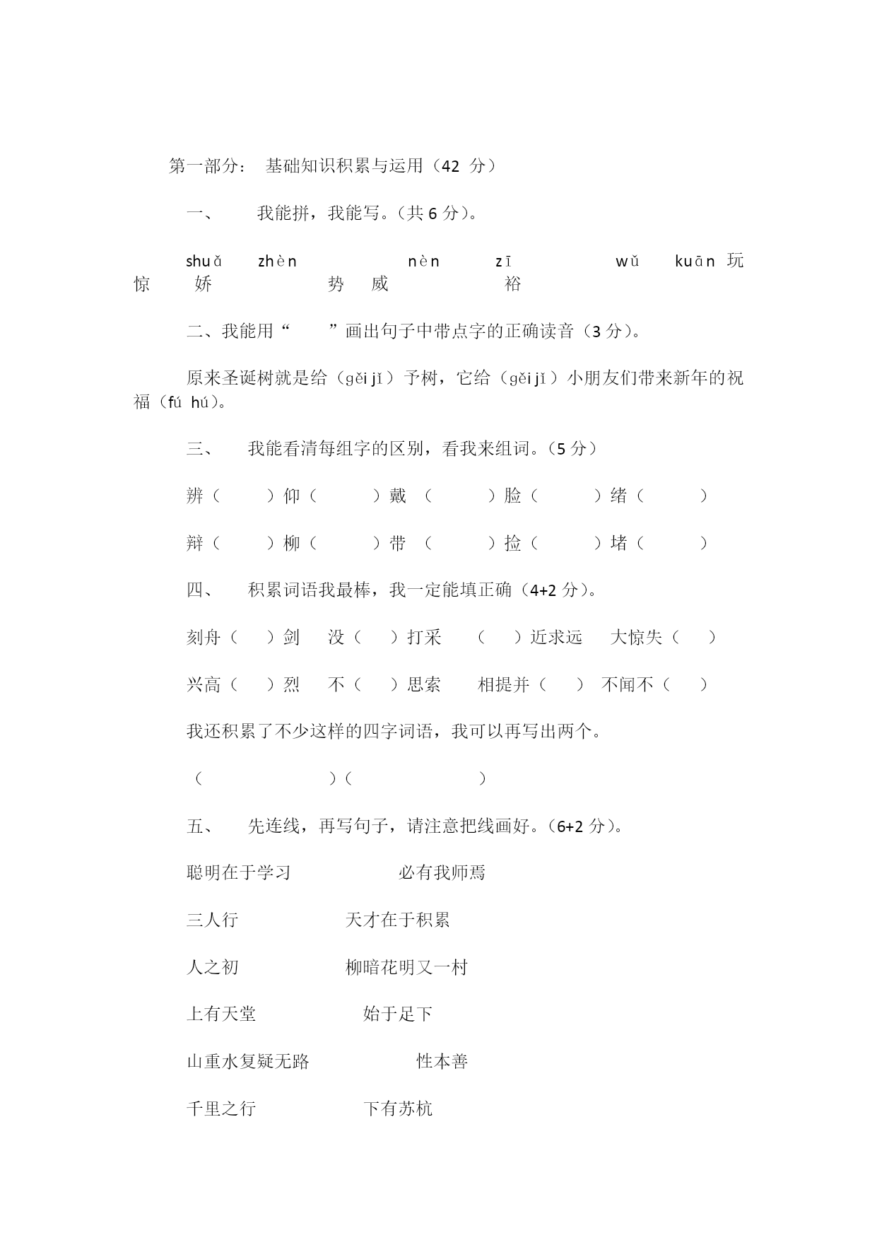 第一部分:基础知识积累与运用(42分)一、我能拼,我能写。(共6分)。shuǎzhènnènzīwǔkuān玩惊娇势威裕二、我能用“”画出句子中带点字的正确读音(3分)。原来圣诞树就是给(ɡěijǐ)予树,它给(ɡěijǐ)小朋友们带来新年的祝福(fúhú)。三、我能看清每组字的区别,看我来组词。(5分)辨()仰()戴()脸()绪()辩()柳()带()捡()堵()四、积累词语我最棒,我一定能填正确(4+2分)。刻舟()剑没()打采()近求远大惊失()兴高()烈不()思索相提并()不闻不()我还积累了不少这