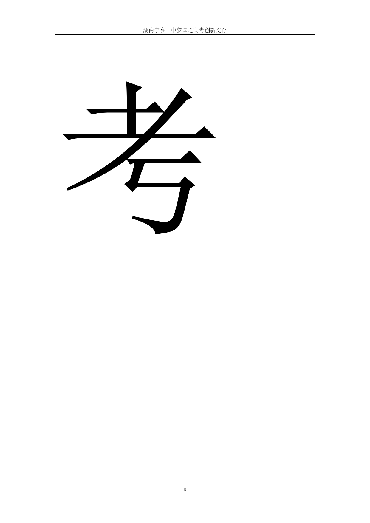 湖南宁乡一中黎国之高考创新文存科学备考,走进阳光灿烂的六月——写给高三学子湖南宁乡一中黎国之邮编410600职称:中教高级电话13574820168每年临近高考前几十天,全国不知有多少考生处于终日手忙脚乱,脑海一桶乱麻的状况。如果在你走进考场之前没有摆脱这种处境,那么,你的季节将会下雪。本文愿同你坦诚交流,共商良策,寻找应对高考的必胜之道,助你走进阳光灿烂的六月,胜利辉煌的六月!大家知道,高考是“国考”,是严肃认真的国家行为,必然依纲据本考基础,考能力,考心理素质,具有相当的稳定性和严