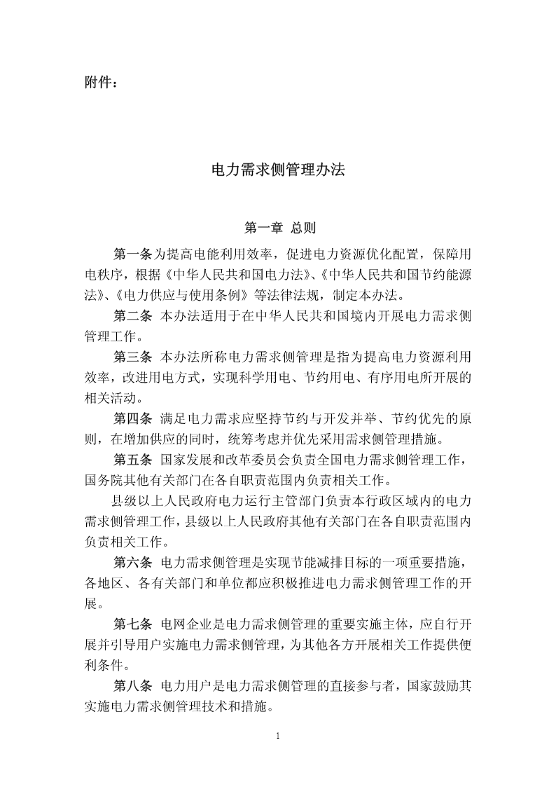 附件:电力需求侧管理办法第一章总则第一条为提高电能利用效率,促进电力资源优化配置,保障用电秩序,根据《中华人民共和国电力法》、《中华人民共和国节约能源法》、《电力供应与使用条例》等法律法规,制定本办法。第二条本办法适用于在中华人民共和国境内开展电力需求侧管理工作。第三条本办法所称电力需求侧管理是指为提高电力资源利用效率,改进用电方式,实现科学用电、节约用电、有序用电所开展的相关活动。第四条满足电力需求应坚持节约与开发并举、节约优先的原则,在增加供应的同时,统筹考虑并优先采用需求侧管理措施。第五条国家发展和