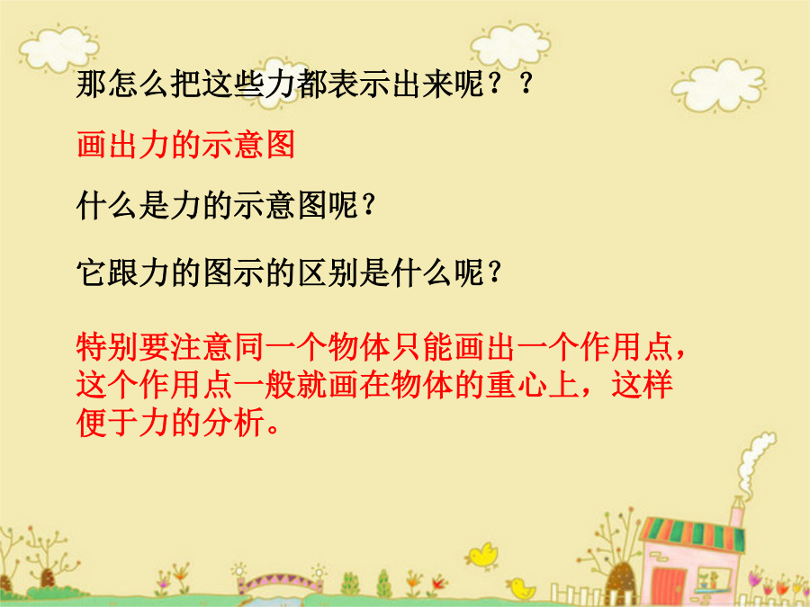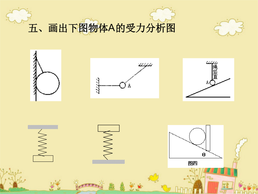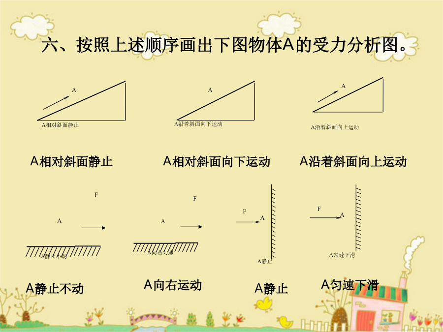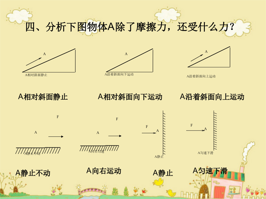 3.4分析物体的受力一、分析物体A所受弹力A物体可以静止,可以做匀速运动,可以做匀变速运动,也可以做非匀变速运动,那么物体的运动状态是由谁决定的呢?三、分析下图中物体A除了弹力,还受什么力?A那怎么把这些力都表示出来呢??五、画出下图物体A的受力分析图2.在分析物体受力的顺序上,因力比较多,一般按照这样的顺序分析力:㈠重力㈡弹力(弹力包括压力、支持力、拉力等)㈢摩擦力(动摩擦力和静摩擦力)㈣其他力(如:磁场力,电场力、分子力等)这样才不会漏掉力,逐一找全,做到正确无误。A四、物体受力分析时应注意以下几点1