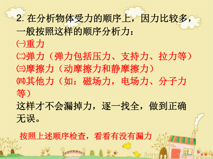 物体的受力分析一、复习基础知识:1.力的基本概念⑸力的表示方法:力的图示、力的示意图。⑹力的测量:测力计(如弹簧秤)⑺力的分类:按性质分;按效果分;按是否接触分…2.常见的三种力⑴重力①产生:由于地球的吸引而使物体受到的力②方向:竖直向下③大小:G=mg2.常见的三种力⑴重力④作用点:重心,形状规则、质量分布均匀的物体的重心在其几何中心。用悬挂法可以找薄板状物体的重心2.常见的三种力⑵弹力①产生条件:直接接触、发生弹性形变(或有挤压作用)②方向:作用在使之发生形变的物体上,与接触面垂直(点接触时,垂直于过