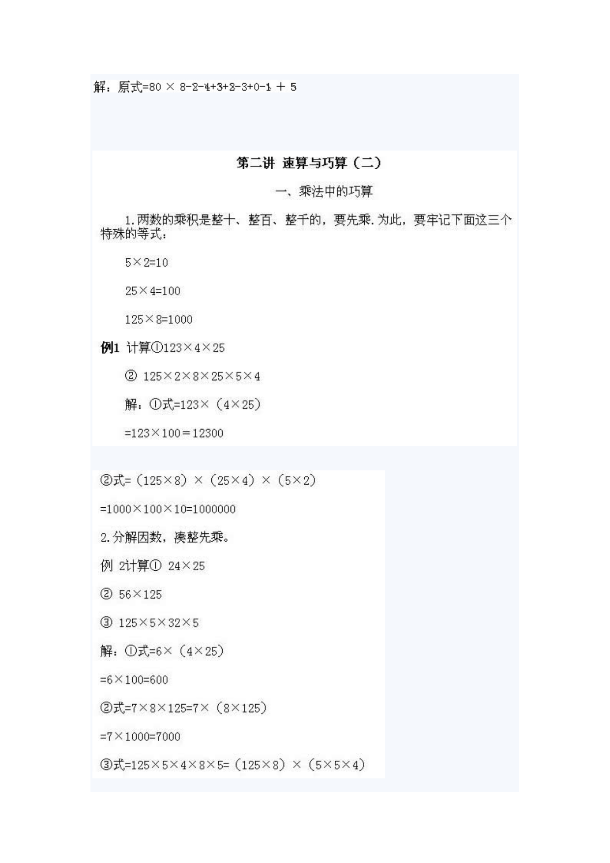 一、加法中的巧算1.什么叫“补数”?两个数相加,若能恰好凑成整十、整百、整千、整万…,就把其中的一个数叫做另一个数的“补数”。如:1+9=10,3+7=10,2+8=10,4+6=10,5+5=10。又如:11+89=100,33+67=100,22+78=100,44+56=100,55+45=100,在上面算式中,1叫9的“补数”;89叫11的“补数”,11也叫89的“补数”.也就是说两个数互为“补数”。对于一个较大的数,如何能很快地算出它的“补数”来呢?一般来说,可以这样“凑”数:从最高位凑起,使各