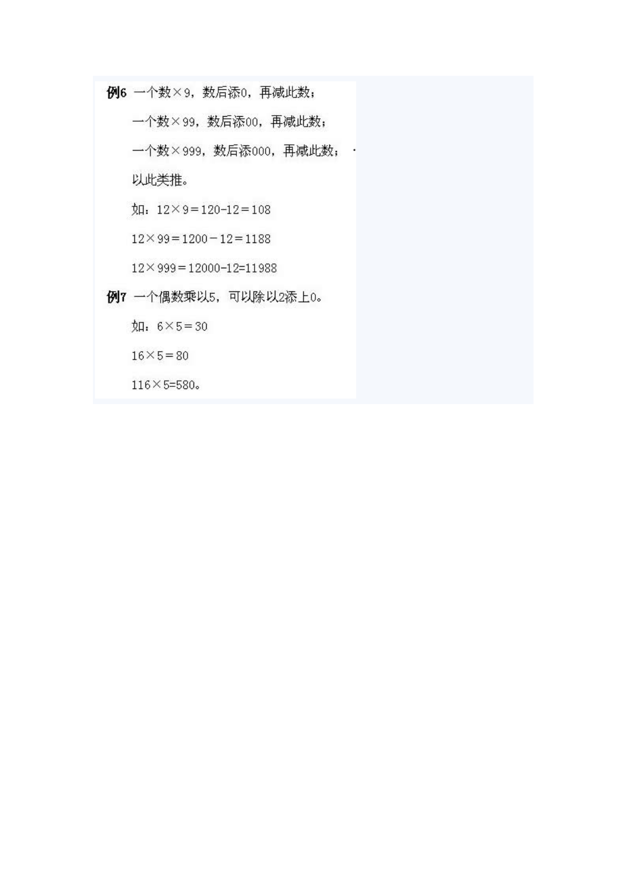 1.十几乘十几:口诀:头乘头,尾加尾,尾乘尾。例:12×14=?解:1×1=12+4=62×4=812×14=168注:个位相乘,不够两位数要用0占位。.头相同,尾互补(尾相加等于10):口诀:一个头加1后,头乘头,尾乘尾。例:23×27=?解:2+1=32×3=63×7=2123×27=621注:个位相乘,不够两位数要用0占位。.第一个乘数互补,另一个乘数数字相同:口诀:一个头加1后,头乘头,尾乘尾。例:37×44=?解:3+1=44×4=167×4=2837×44=1628注:个位相乘,不够两位数要用