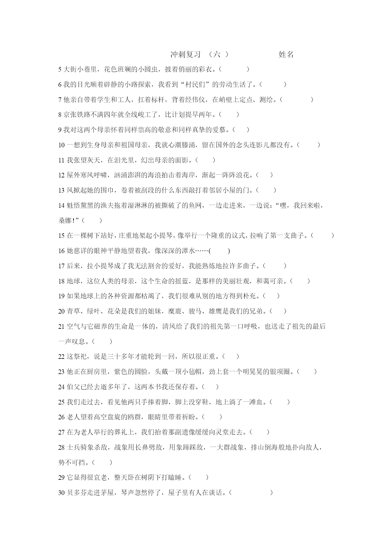 冲刺复习(六)姓名5大街小巷里,花色班斓的小圆虫,披着俏丽的彩衣。()6我的目光顺着辟静的小路探索,我看到“村民们”的劳动生活了。()7他亲自带着学生和工人,扛着标杆,背着经伟仪,在峭壁上定点、测绘。()8京张铁路不满四年就全线峻工了,比计划提早两年。()9我对这两个母亲怀着同样祟高的敬意和同样真挚的爱慕。()10一想到生身母亲和祖国母亲,我就心潮滕涌,留在国外的念头连影儿都没有。()11我张望灰天,在泪光里,幻出母亲的面影。()12屋外寒风呼啸,汹涌澎湃的海浪拍击着海岸,渐起一阵阵浪花。()13风掀起她