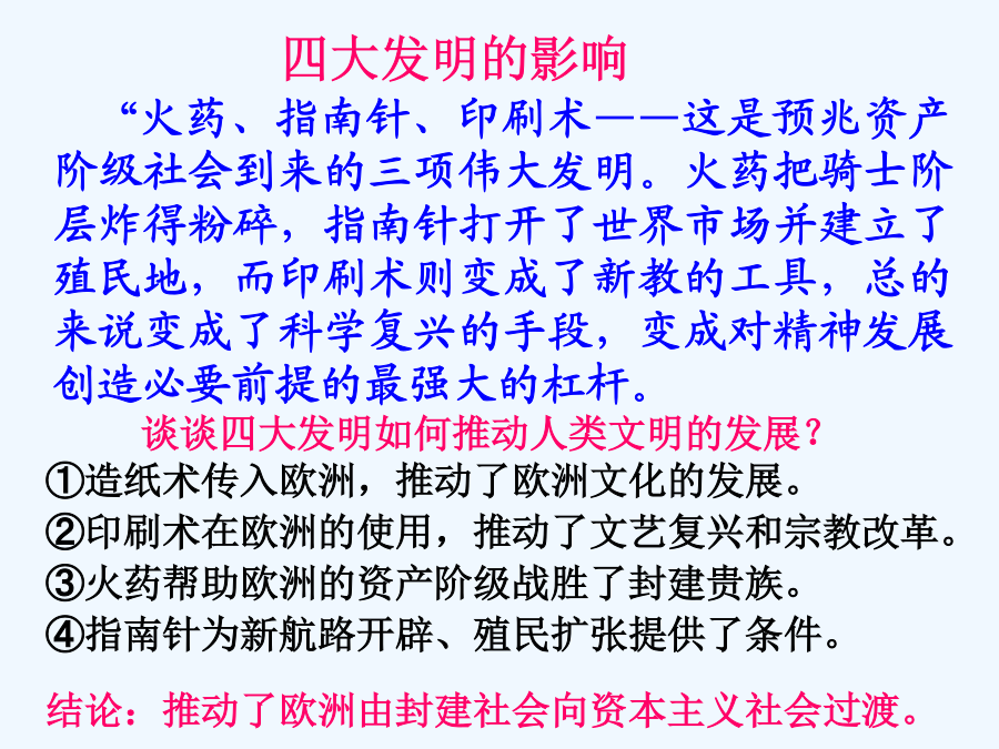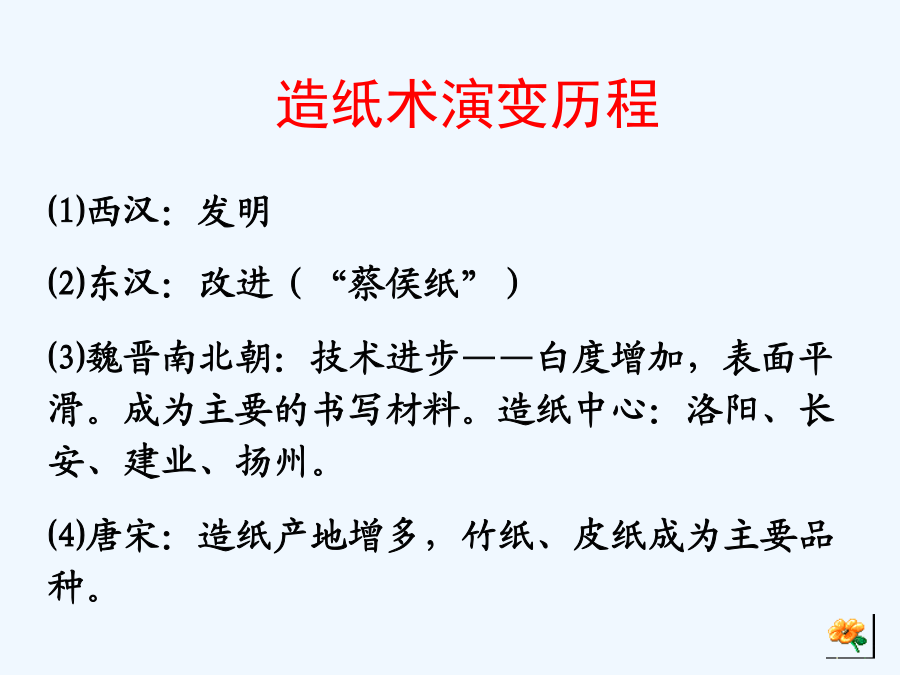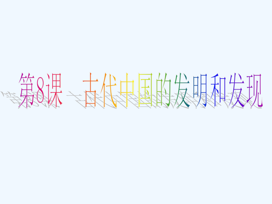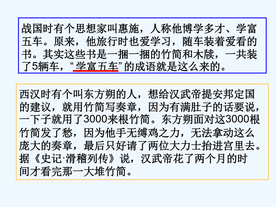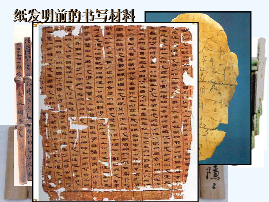 第8课古代中国的发明和发现时间一、四大发明“火药、指南针、印刷术——这是预兆资产阶级社会到来的三项伟大发明。火药把骑士阶层炸得粉碎,指南针打开了世界市场并建立了殖民地,而印刷术则变成了新教的工具,总的来说变成了科学复兴的手段,变成对精神发展创造必要前提的最强大的杠杆。纸发明前的书写材料西汉时有个叫东方朔的人,想给汉武帝提安邦定国的建议,就用竹简写奏章,因为有满肚子的话要说,一下子就用了3000来根竹简。东方朔面对这3000根竹简发了愁,因为他手无缚鸡之力,无法拿动这么庞大的奏章,最后只好请了两位大力士抬进