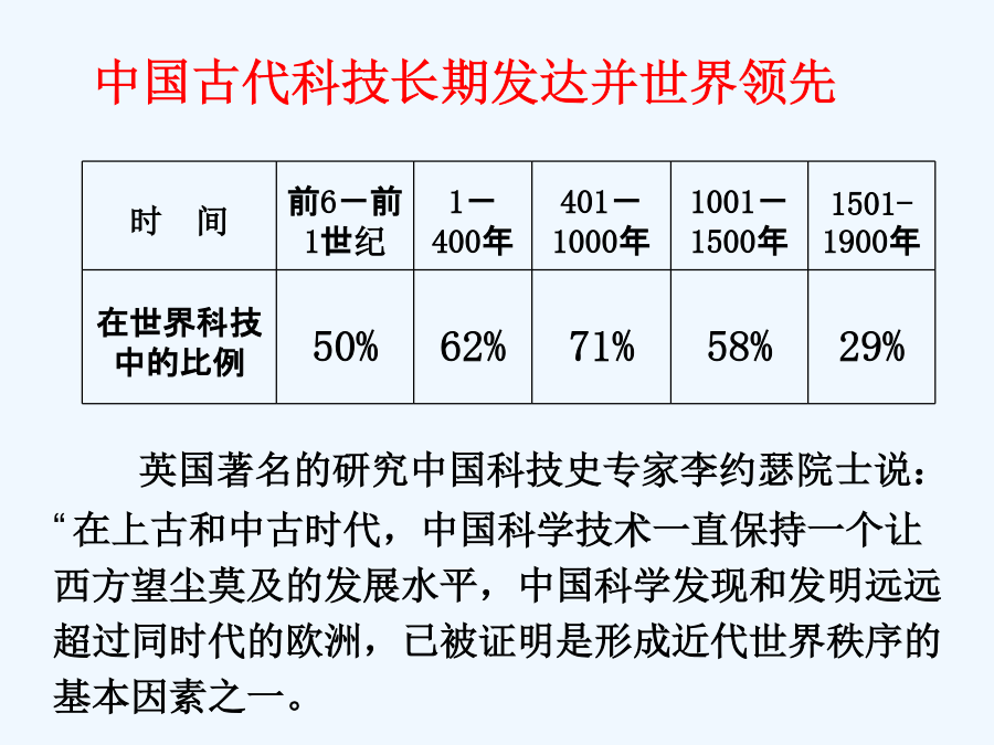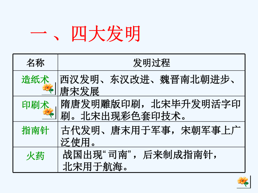 教学目标知识与能力:1、掌握中国古代科技进步的基础知识,特别是纸、指南针、火药和印刷术的发明。2、认识古代中国四大发明对世界文明发展的贡献。3、对比中国四大发明在中国和西方发挥的作用,思考其不同的原因,并从中分析中国古代科技在16世纪后逐渐滞后的原因。过程与方法:1、学生课前在教师的指导下利用图书馆、互联网等资源,分组收集、整理中国古代科技发展的相关材料,并在课堂上相互交流,从而对中国古代科技的成就形成初步的认识。情感态度与价值观:1、了解和认识到中华民族的伟大智慧和对世界做出的巨大贡献。逐步形成对国家、