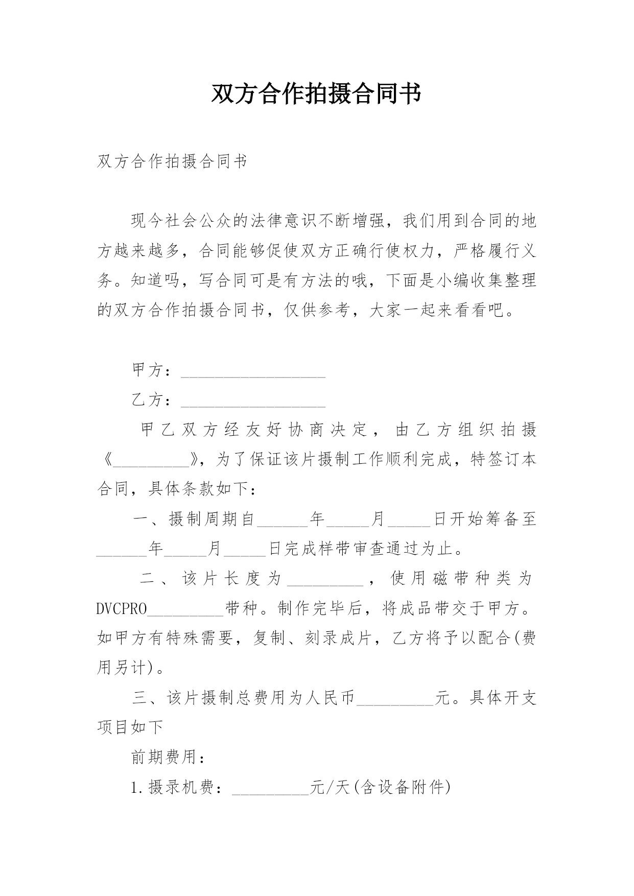 双方合作拍摄合同书双方合作拍摄合同书现今社会公众的法律意识不断增强,我们用到合同的地方越来越多,合同能够促使双方正确行使权力,严格履行义务。知道吗,写合同可是有方法的哦,下面是小编收集整理的双方合作拍摄合同书,仅供参考,大家一起来看看吧。甲方:_________________乙方:_________________甲乙双方经友好协商决定,由乙方组织拍摄《_________》,为了保证该片摄制工作顺利完成,特签订本合同,具体条款如下:一、摄制周期自______年_____月_____日开始筹备至_____