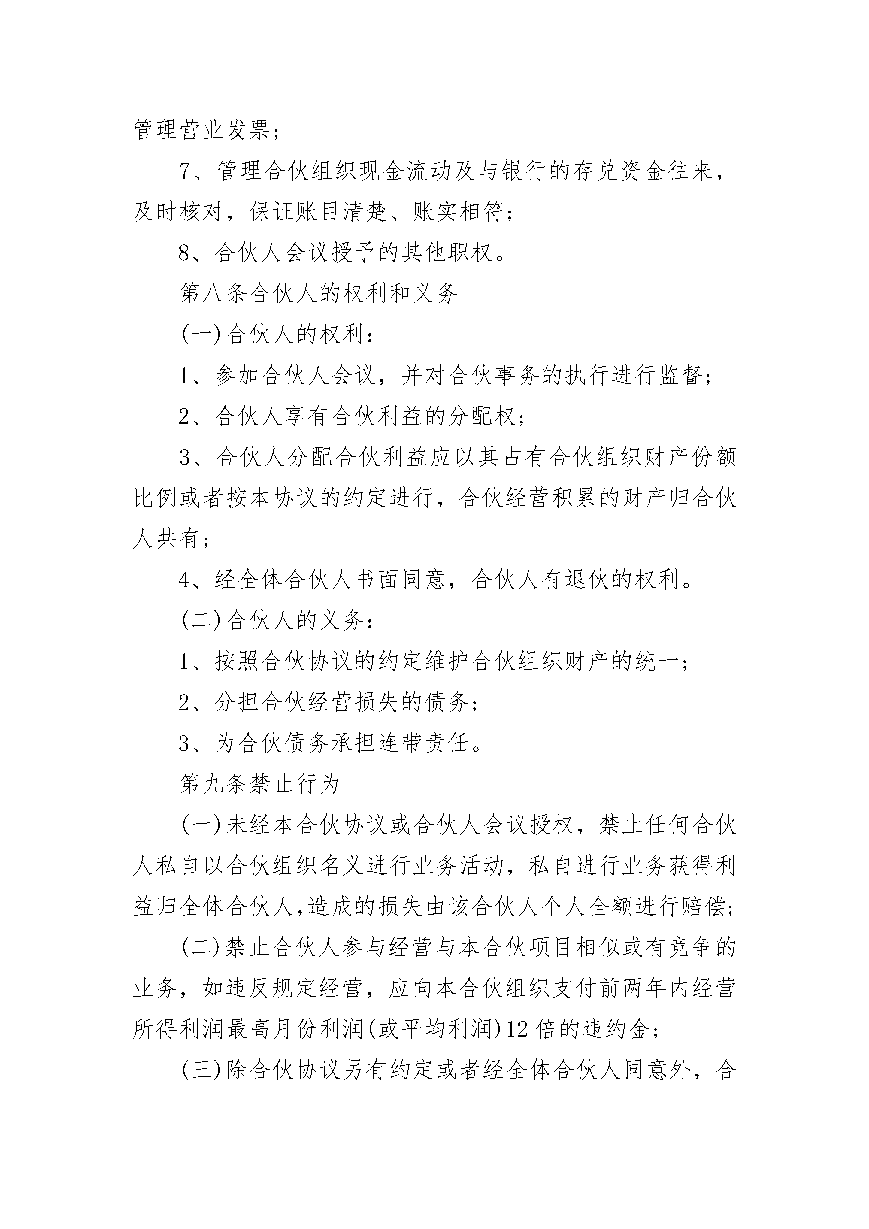 合伙企业合伙协议书合伙企业合伙协议书(集锦4篇)在不断进步的社会中,越来越多人会去使用协议,签订协议可解决或预防不必要的纠纷。那么相关的协议到底怎么写呢?下面是小编整理的合伙企业合伙协议书,仅供参考,大家一起来看看吧。合伙企业合伙协议书1依据《中华人民共和国合伙企业法》和《中华人民共和国合伙企业登记管理办法》,经全体合伙人协商一致,制定本协议。第一条合伙目的:共同经营、共同盈利。第二条合伙企业由合伙人共同出资、合伙经营、共享收益、共担风险,并对合伙企业债务承担无限连带责任。第三条合伙企业名称:第四条合伙企