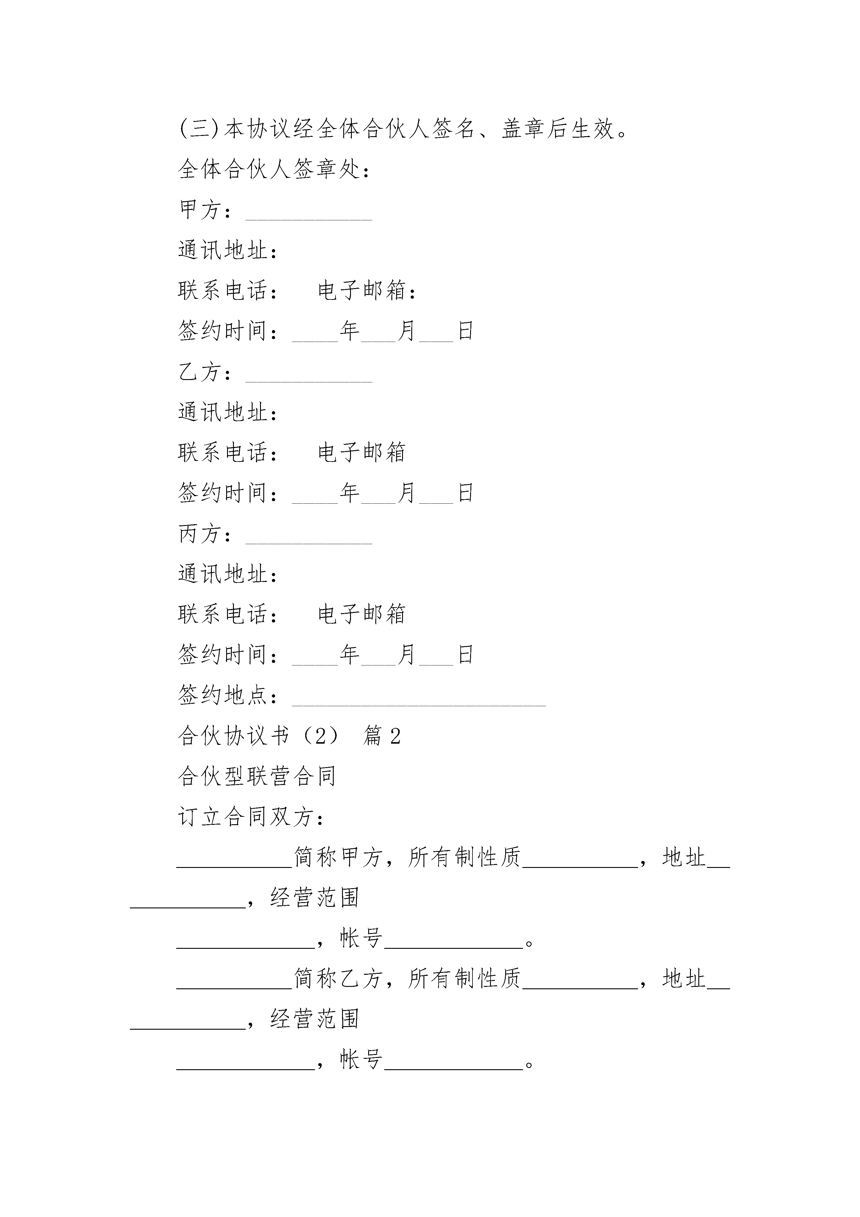 合伙合伙协议书合伙合伙协议书在现实社会中,协议的使用成为日常生活的常态,签订协议可以使双方受到法律的保护。那么协议怎么写才能发挥它最大的作用呢?下面是小编为大家收集的合伙合伙协议书,希望能够帮助到大家。合伙合伙协议书1依据《中华人民共和国合伙企业法》相关,按照自愿、平等、公平、诚实的原则,经新合伙人和原全体合伙人协商一致,制定本协议。第一条合伙企业的名称和经营场地1、合伙企业的名称:_______2、合伙企业经营场地:_______第二条合伙人情况1、合伙企业原合伙人情况:(1)合伙人名称:_______