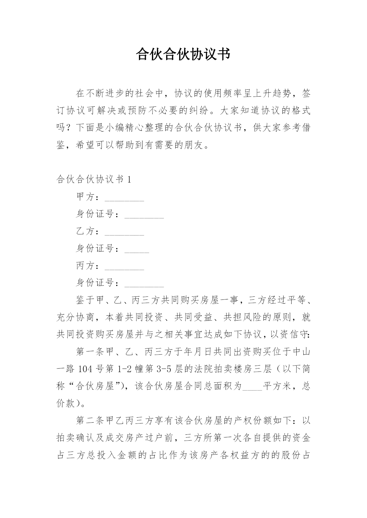 合伙合伙协议书合伙合伙协议书在不断进步的社会中,协议的使用频率呈上升趋势,签订协议可解决或预防不必要的纠纷。大家知道协议的格式吗?下面是小编精心整理的合伙合伙协议书,供大家参考借鉴,希望可以帮助到有需要的朋友。合伙合伙协议书1甲方:________身份证号:________乙方:________身份证号:_____丙方:________身份证号:________鉴于甲、乙、丙三方共同购买房屋一事,三方经过平等、充分协商,本着共同投资、共同受益、共担风险的原则,就共同投资购买房屋并与之相关事宜达成如下协议,