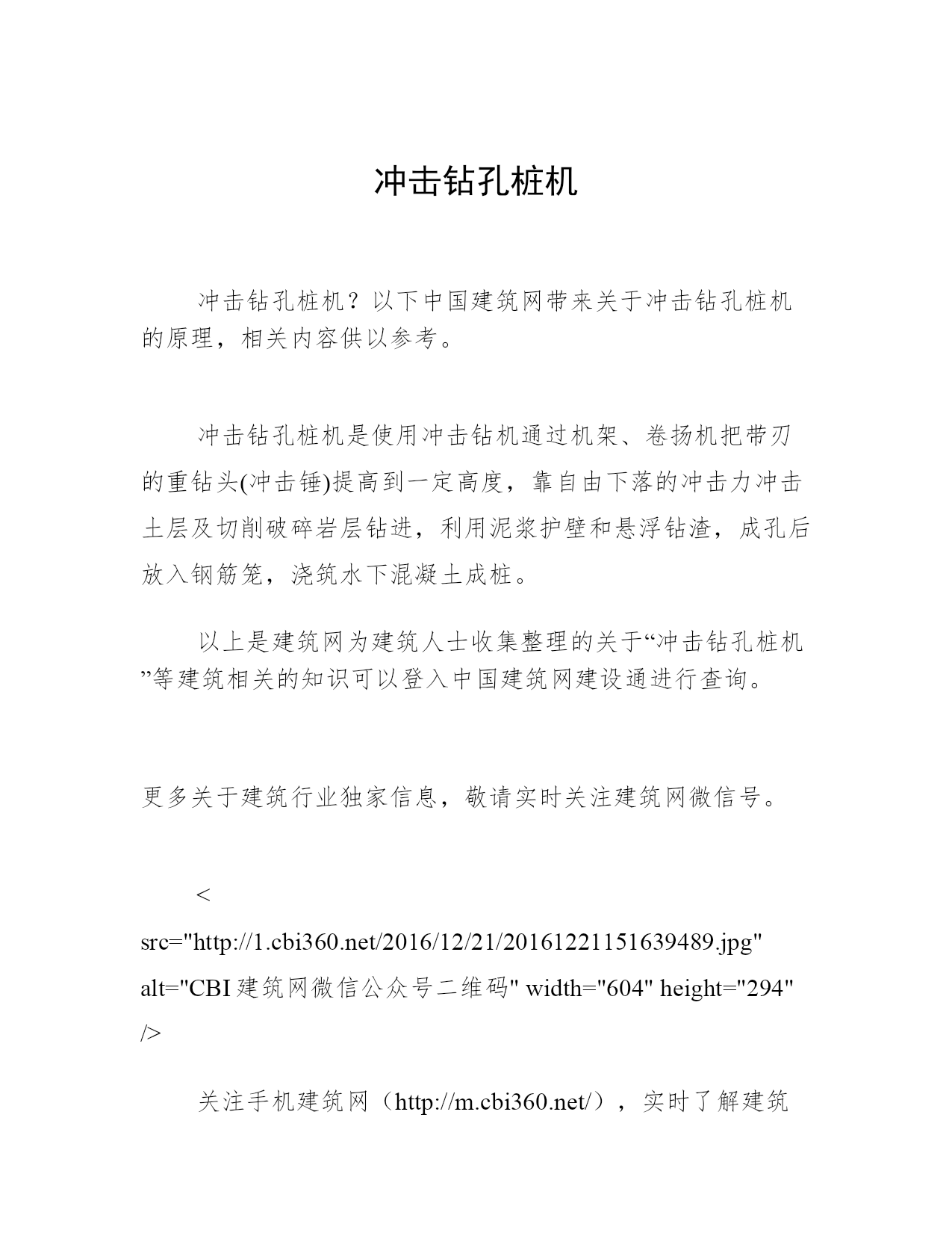 冲击钻孔桩机HYPERLINK"http://www.cbi360.net/"\h冲击钻孔桩机?以下中国建筑网带来关于冲击钻孔桩机的原理,相关内容供以参考。冲击钻孔桩机是使用冲击钻机通过机架、卷扬机把带刃的重钻头(冲击锤)提高到一定高度,靠自由下落的冲击力冲击土层及切削破碎岩层钻进,利用泥浆护壁和悬浮钻渣,成孔后放入钢筋笼,浇筑水下混凝土成桩。HYPERLINK"http://www.cbi360.net/"\h以上是建筑网为建筑人士收集整理的关于“冲击钻孔桩机”等建筑相关的知识可以登入中国建筑