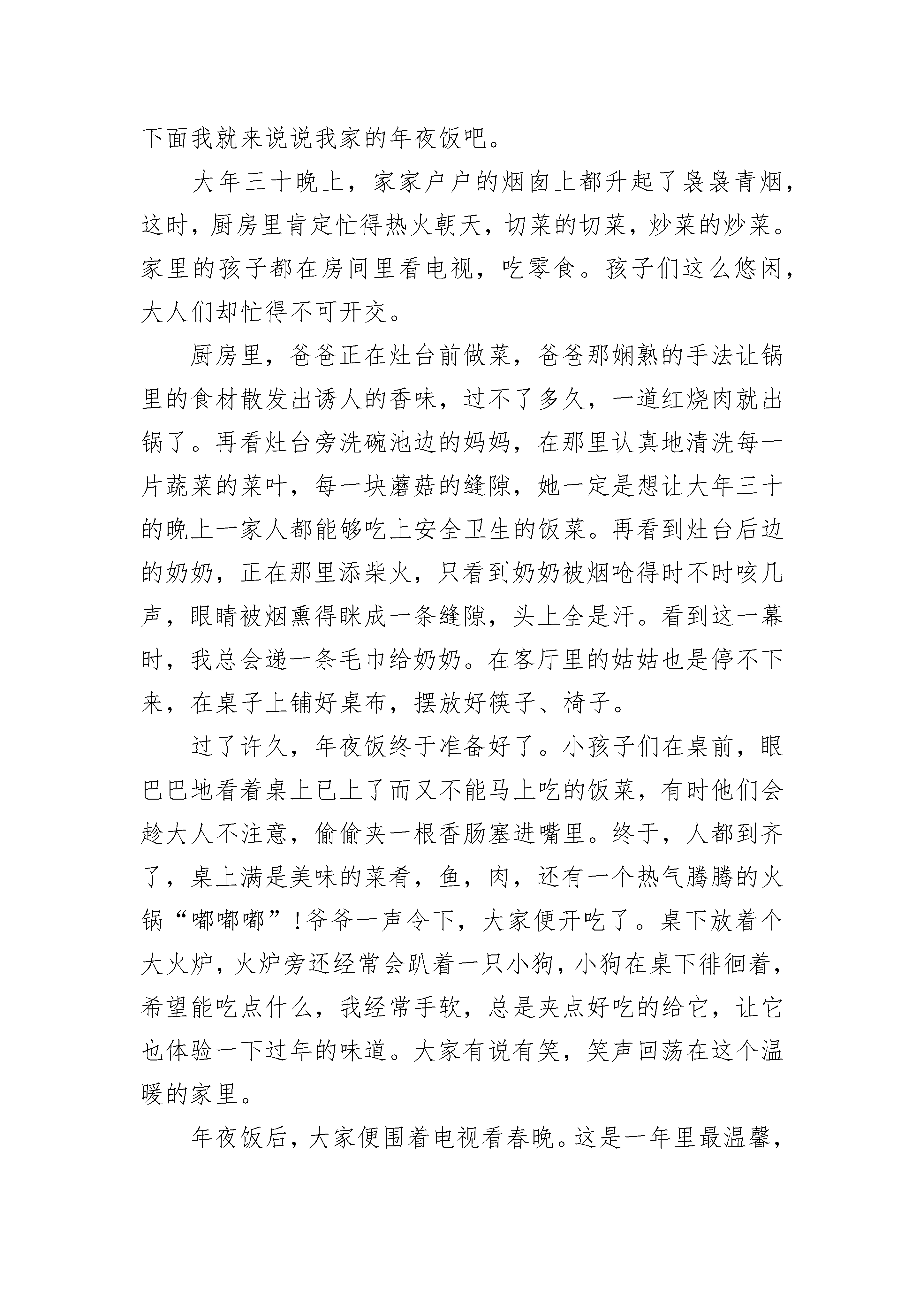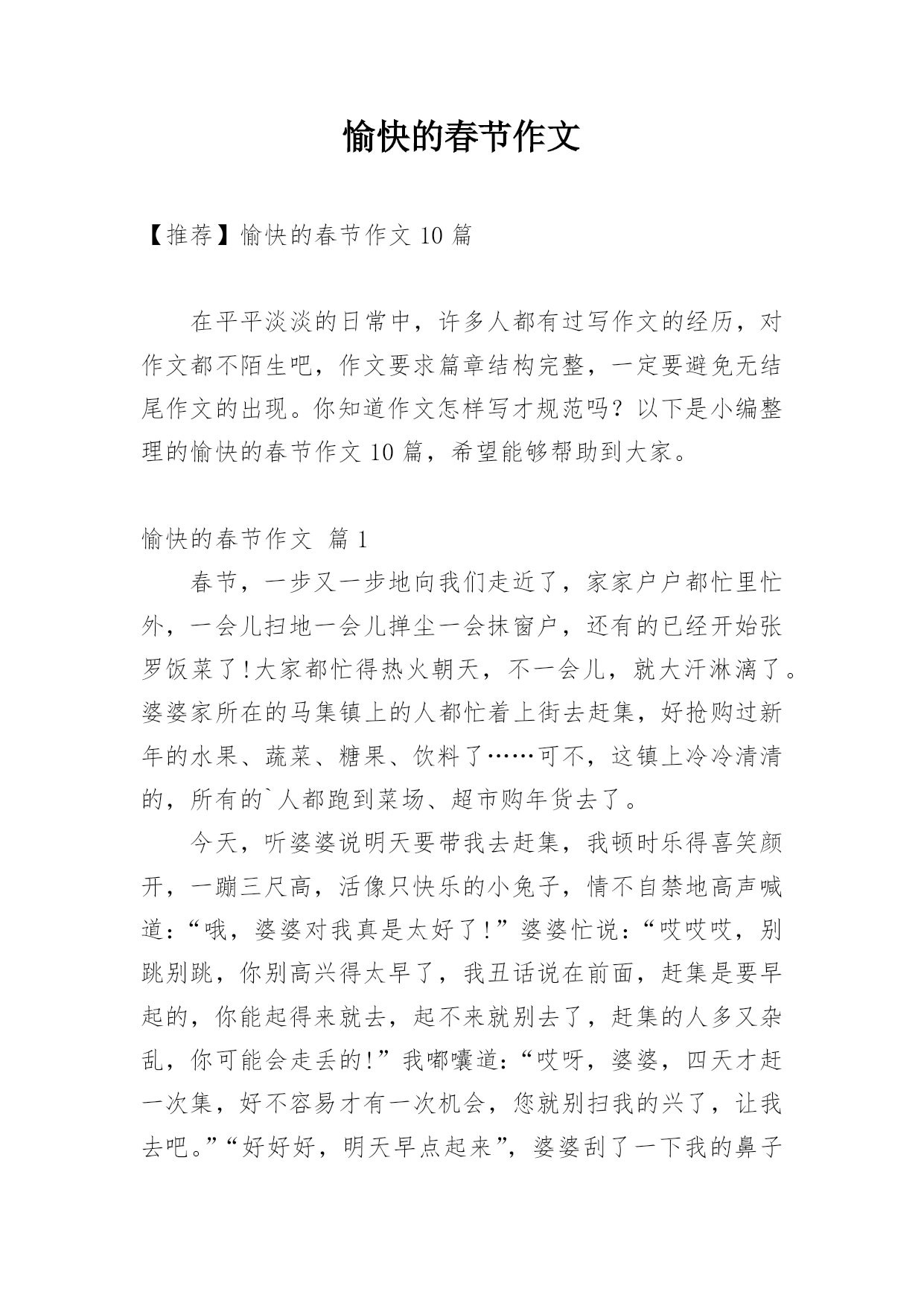 愉快的春节作文【推荐】愉快的春节作文10篇在平平淡淡的日常中,许多人都有过写作文的经历,对作文都不陌生吧,作文要求篇章结构完整,一定要避免无结尾作文的出现。你知道作文怎样写才规范吗?以下是小编整理的愉快的春节作文10篇,希望能够帮助到大家。愉快的春节作文篇1春节,一步又一步地向我们走近了,家家户户都忙里忙外,一会儿扫地一会儿掸尘一会抹窗户,还有的已经开始张罗饭菜了!大家都忙得热火朝天,不一会儿,就大汗淋漓了。婆婆家所在的马集镇上的人都忙着上街去赶集,好抢购过新年的水果、蔬菜、糖果、饮料了……可不,这镇上冷